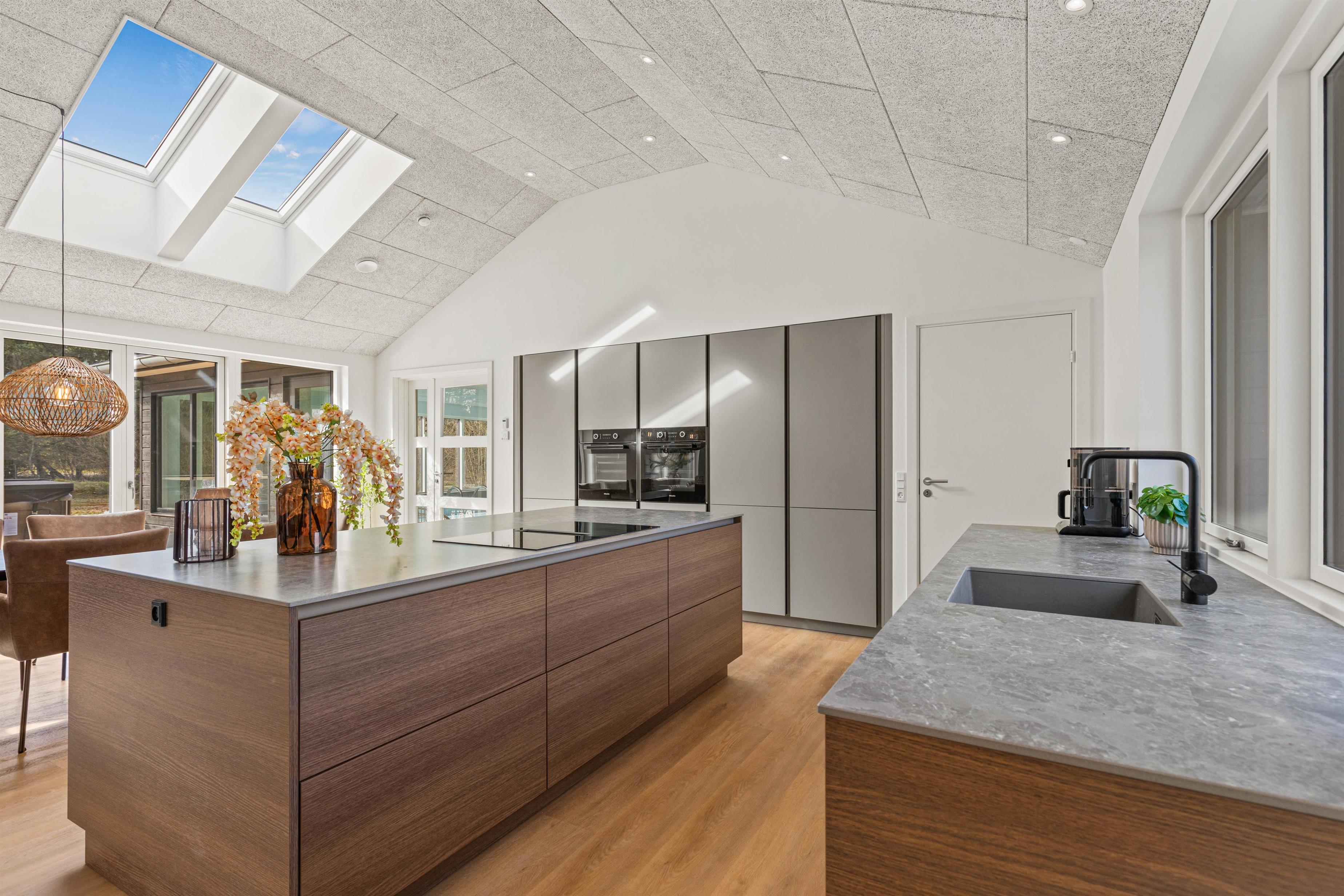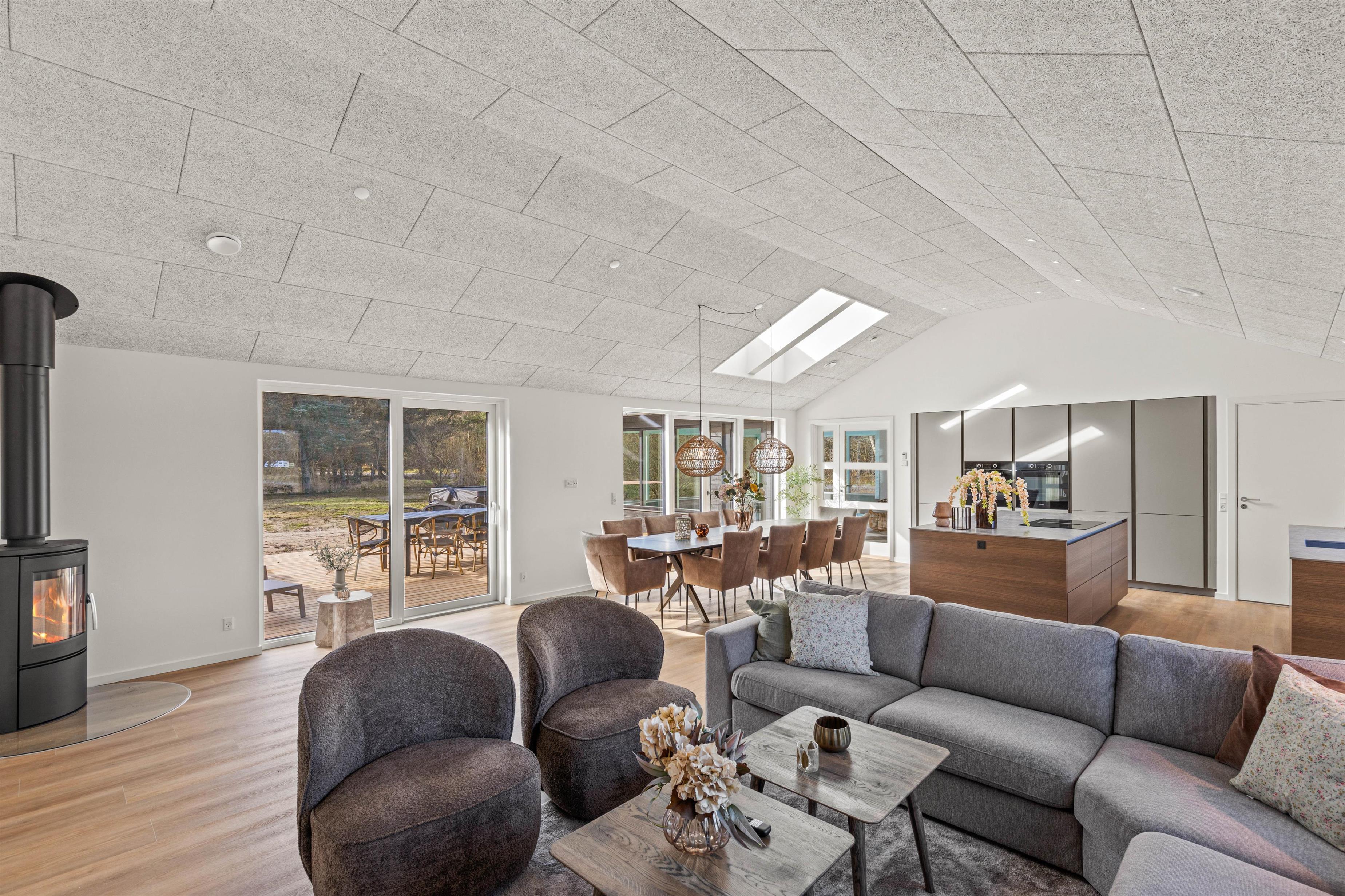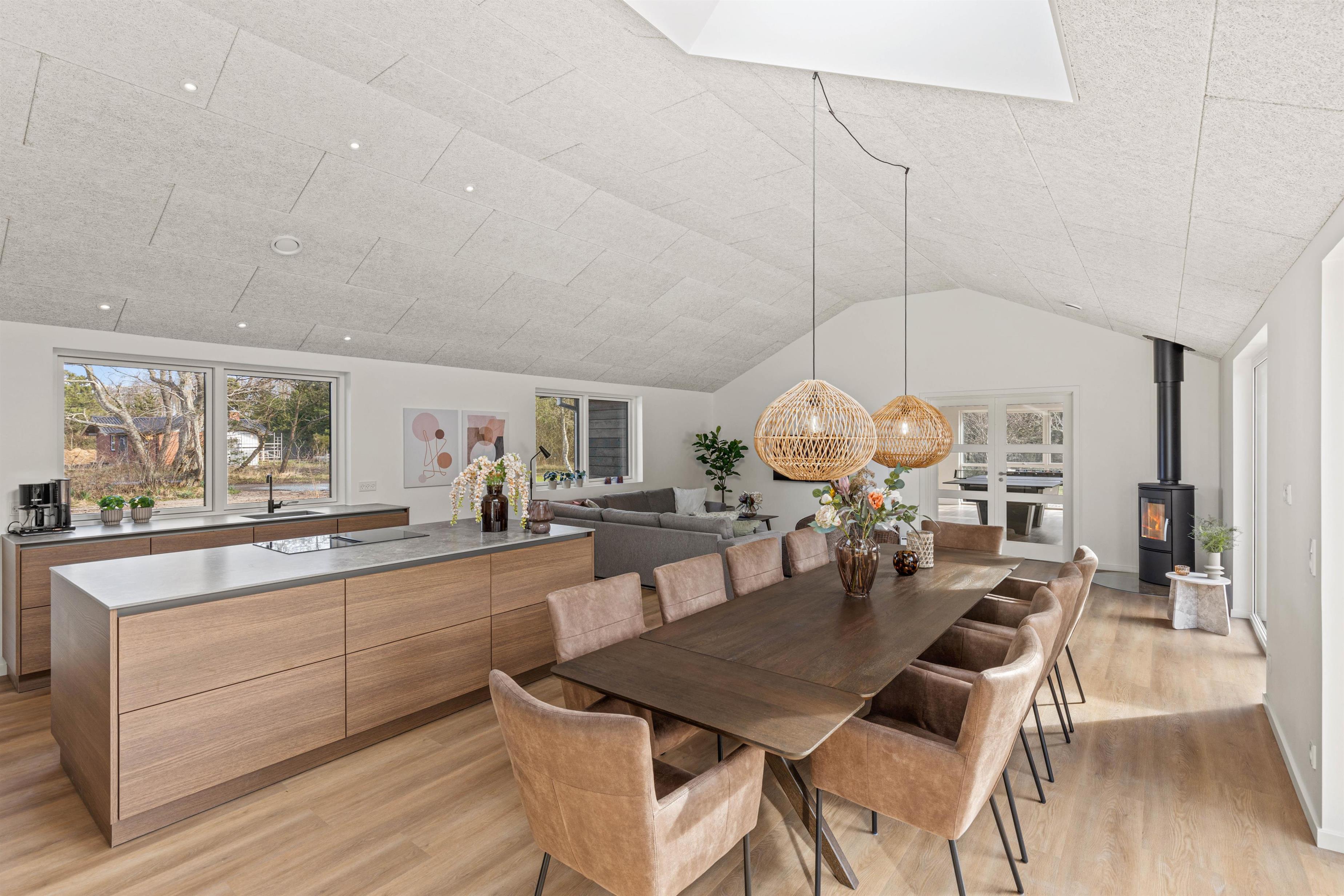 Det veludstyrede køkken har naturligvis alt moderne udstyr – opvaskemaskine, store køle/fryseskabe, ovn i løftehøjde og induktionskogeplade på køkkenøen. Derved kan kokken og køkkenhjælperne stadig deltage i samtalen ved spisebordet eller se, hvem der vinder i brætspillet. Der er god plads til alle i de lækre sofaer, der frister til hygge og samvær foran brændeovnen.