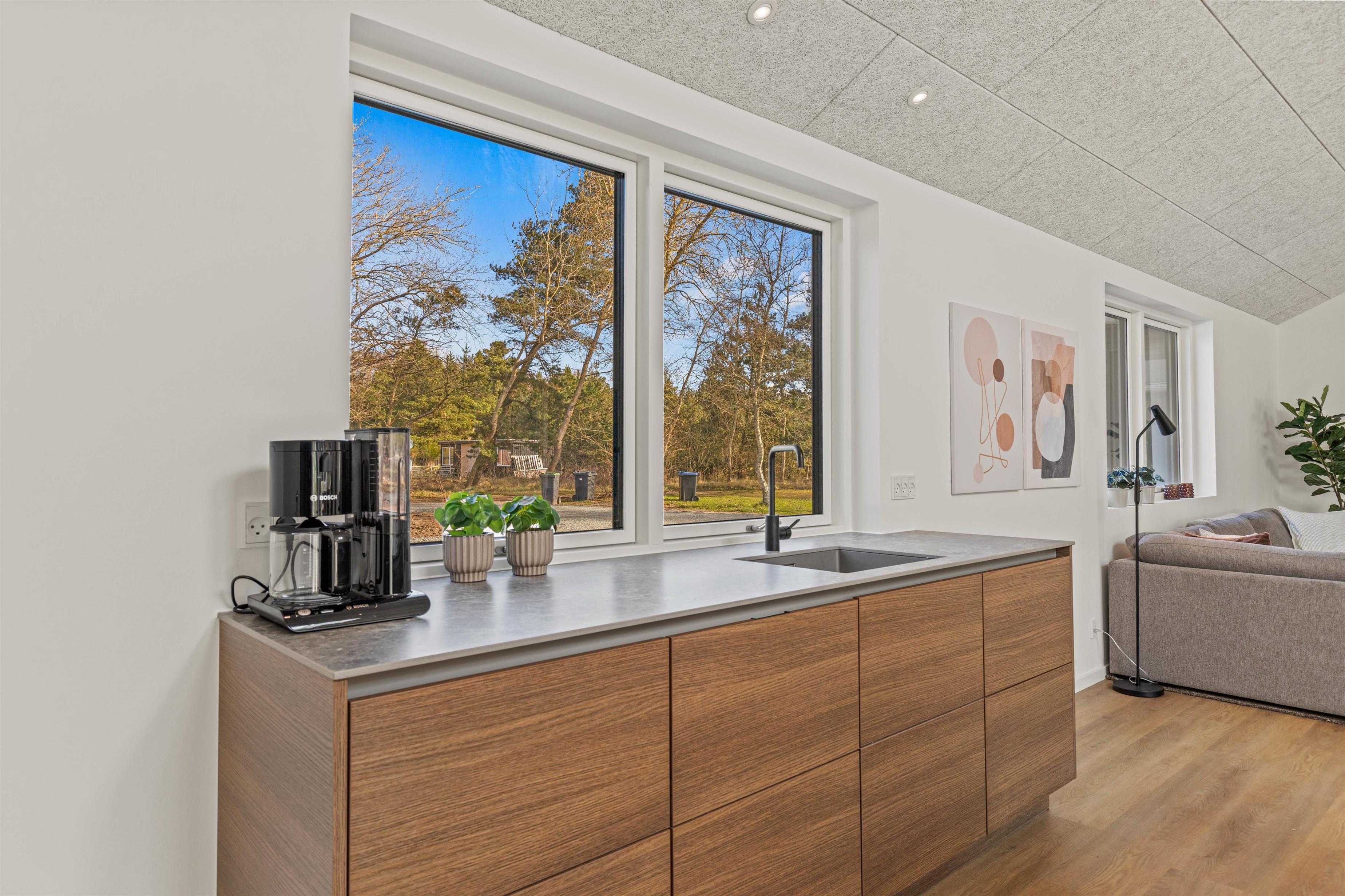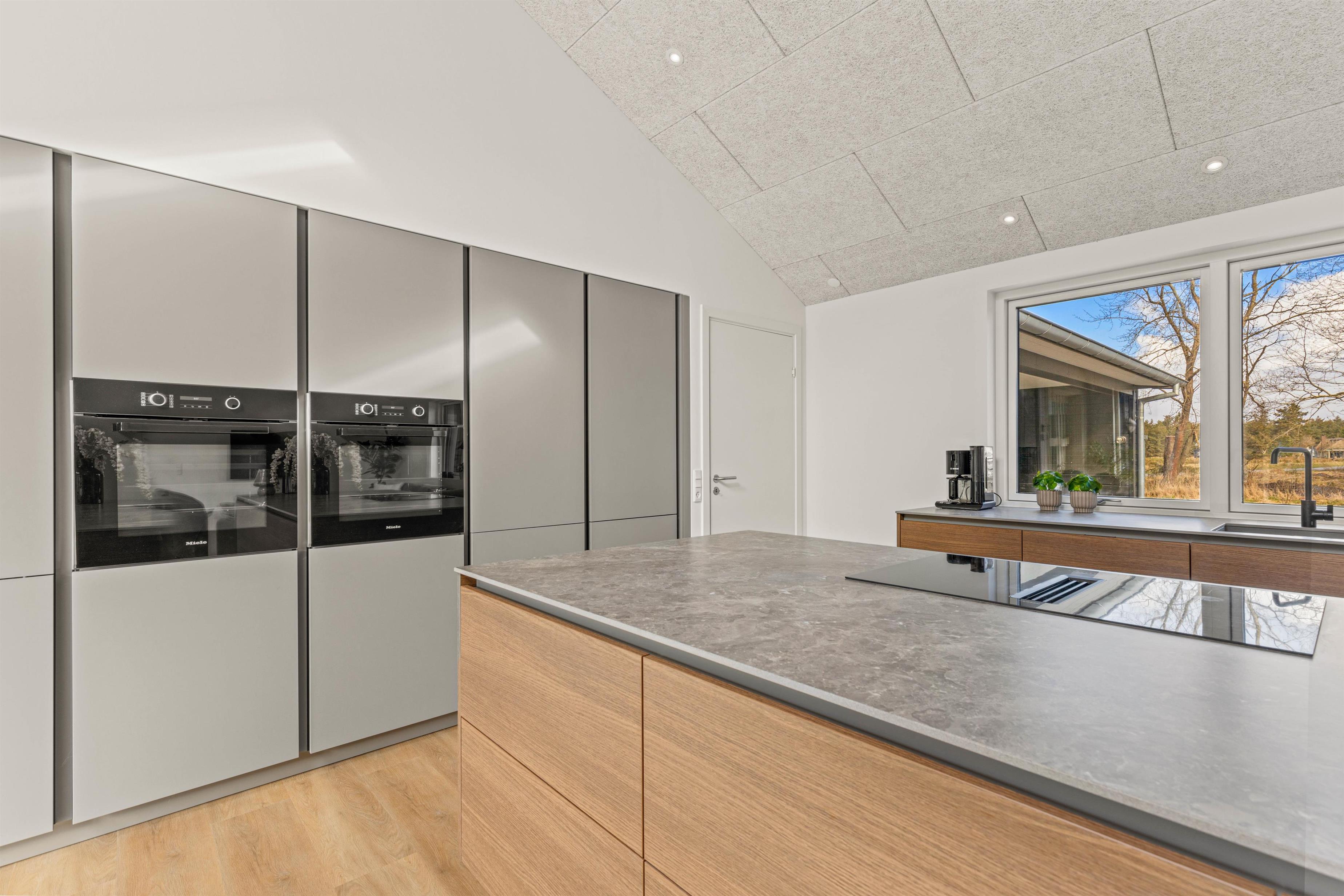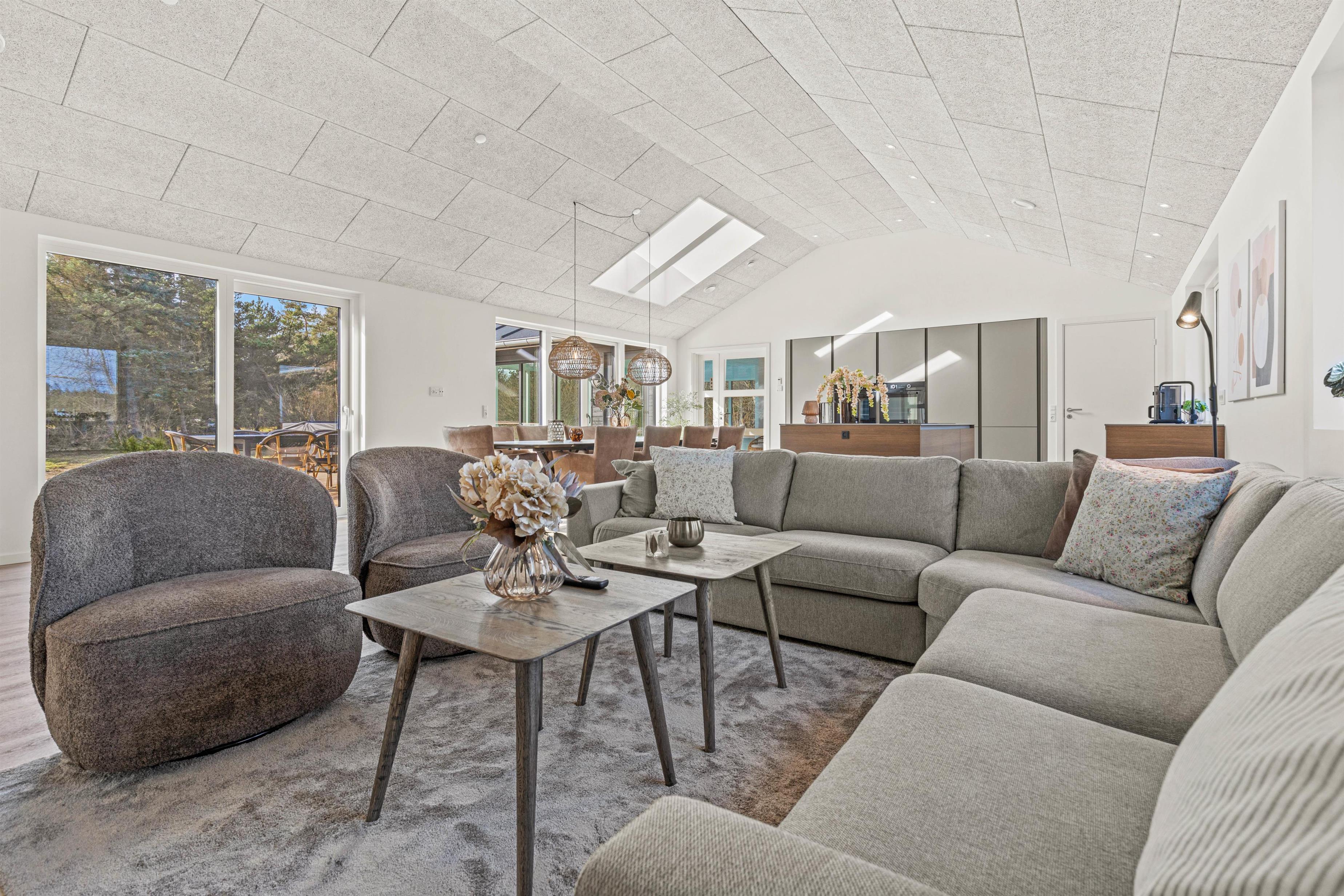 Det veludstyrede køkken har naturligvis alt moderne udstyr – opvaskemaskine, store køle/fryseskabe, ovn i løftehøjde og induktionskogeplade på køkkenøen. Derved kan kokken og køkkenhjælperne stadig deltage i samtalen ved spisebordet eller se, hvem der vinder i brætspillet. Der er god plads til alle i de lækre sofaer, der frister til hygge og samvær foran brændeovnen.