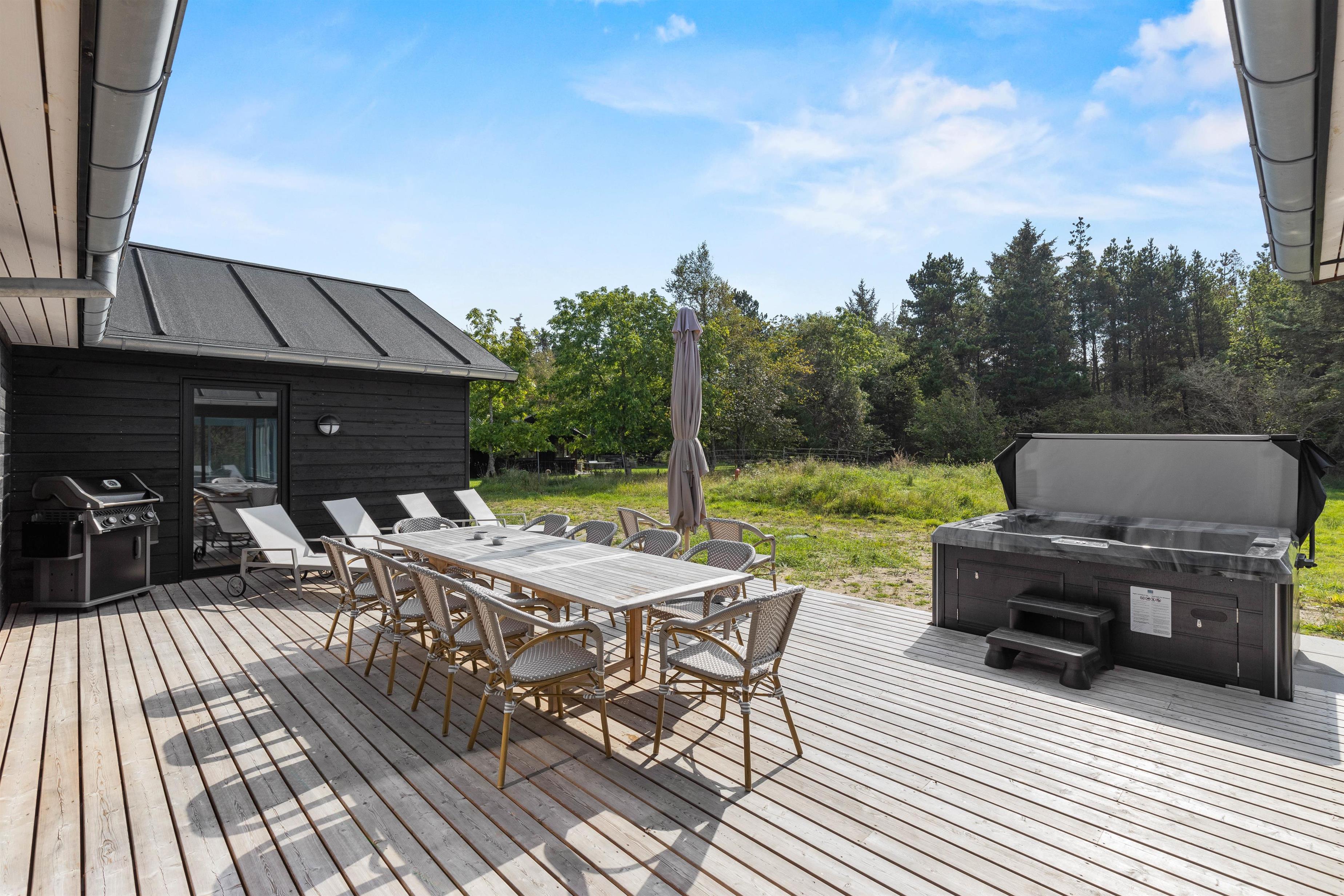 På terrassen er der naturligvis både liggestole til soldyrkerne og behagelige havemøbler, hvor veltilberede måltider fra gasgrillen kan indtages med et godt glas vin.