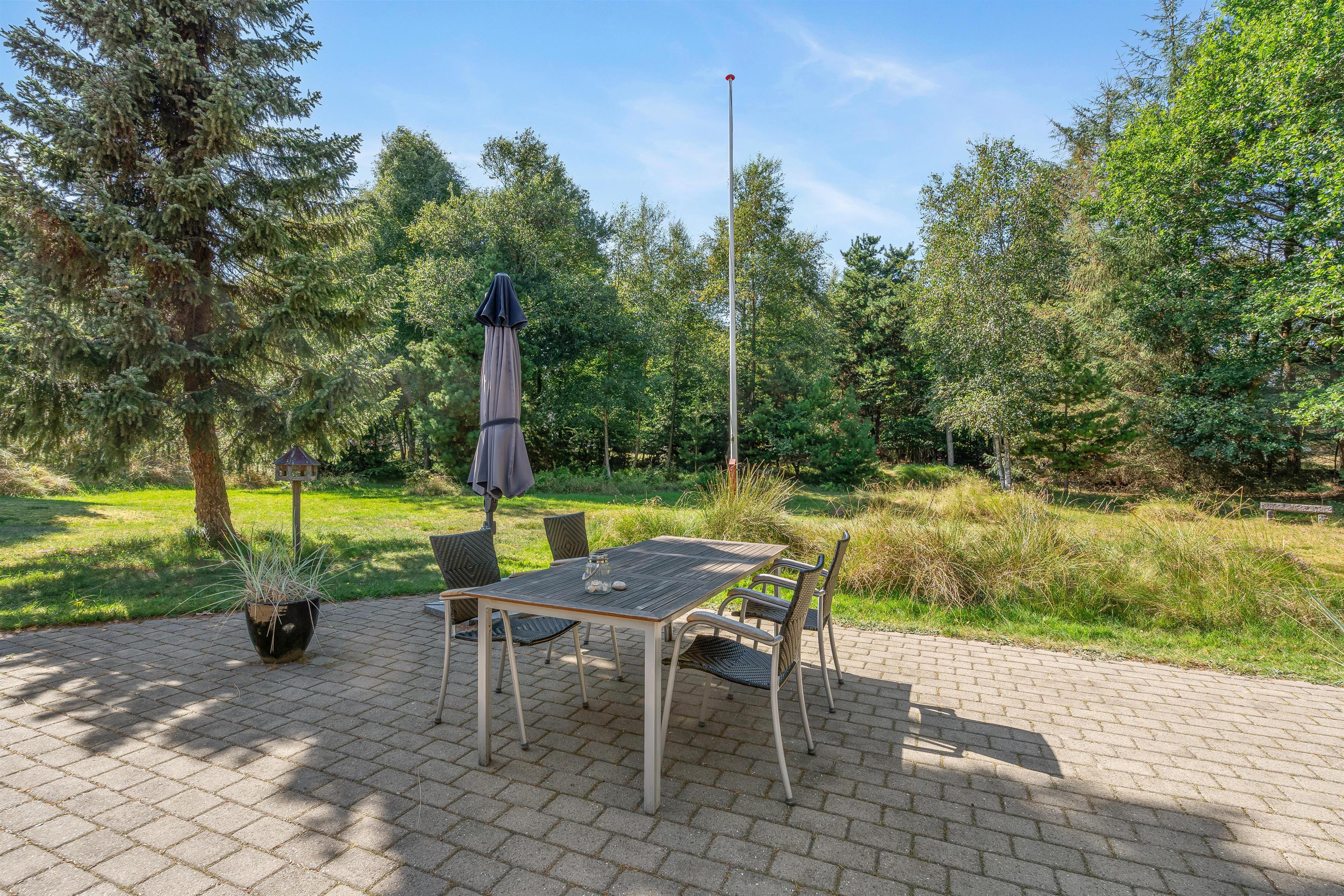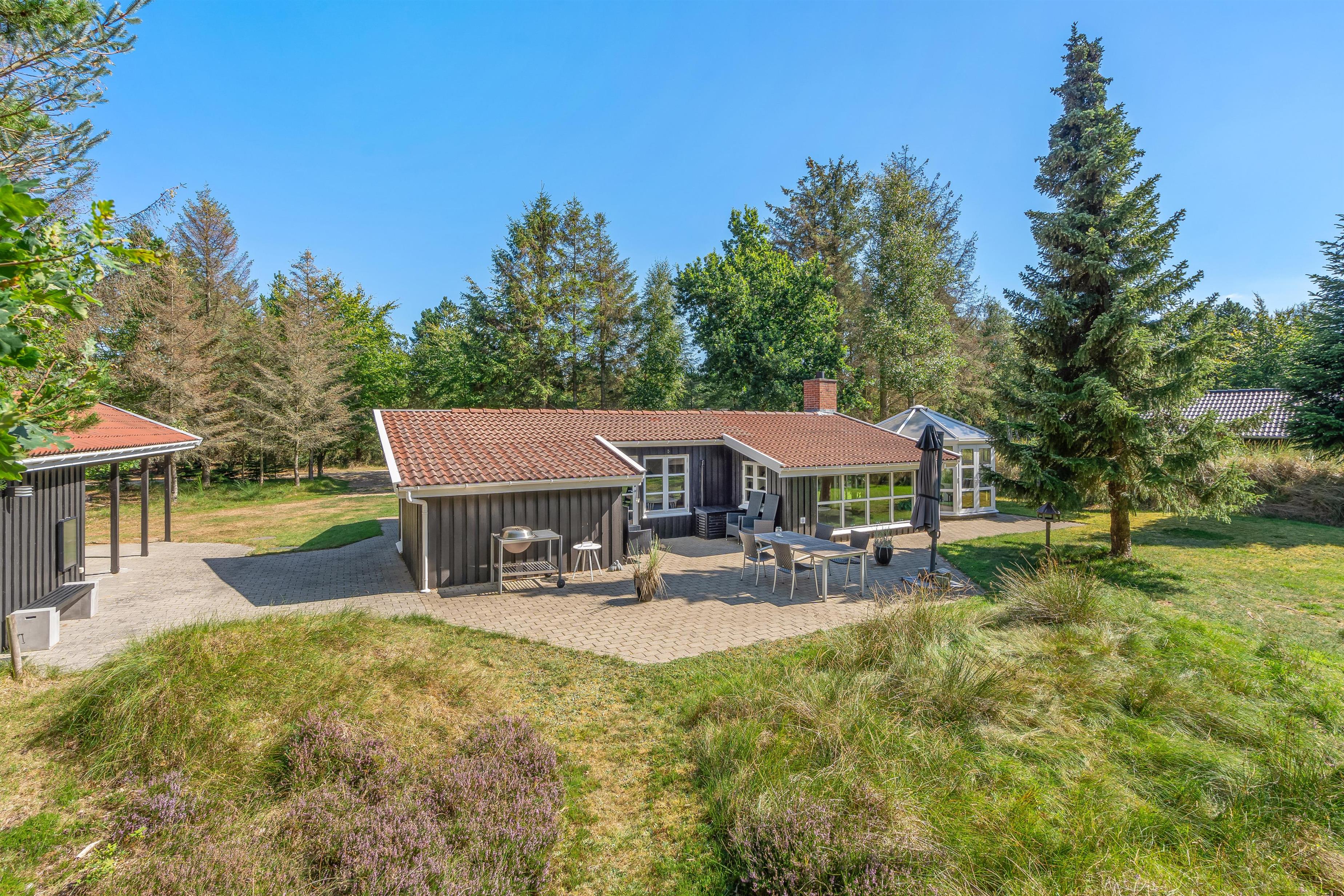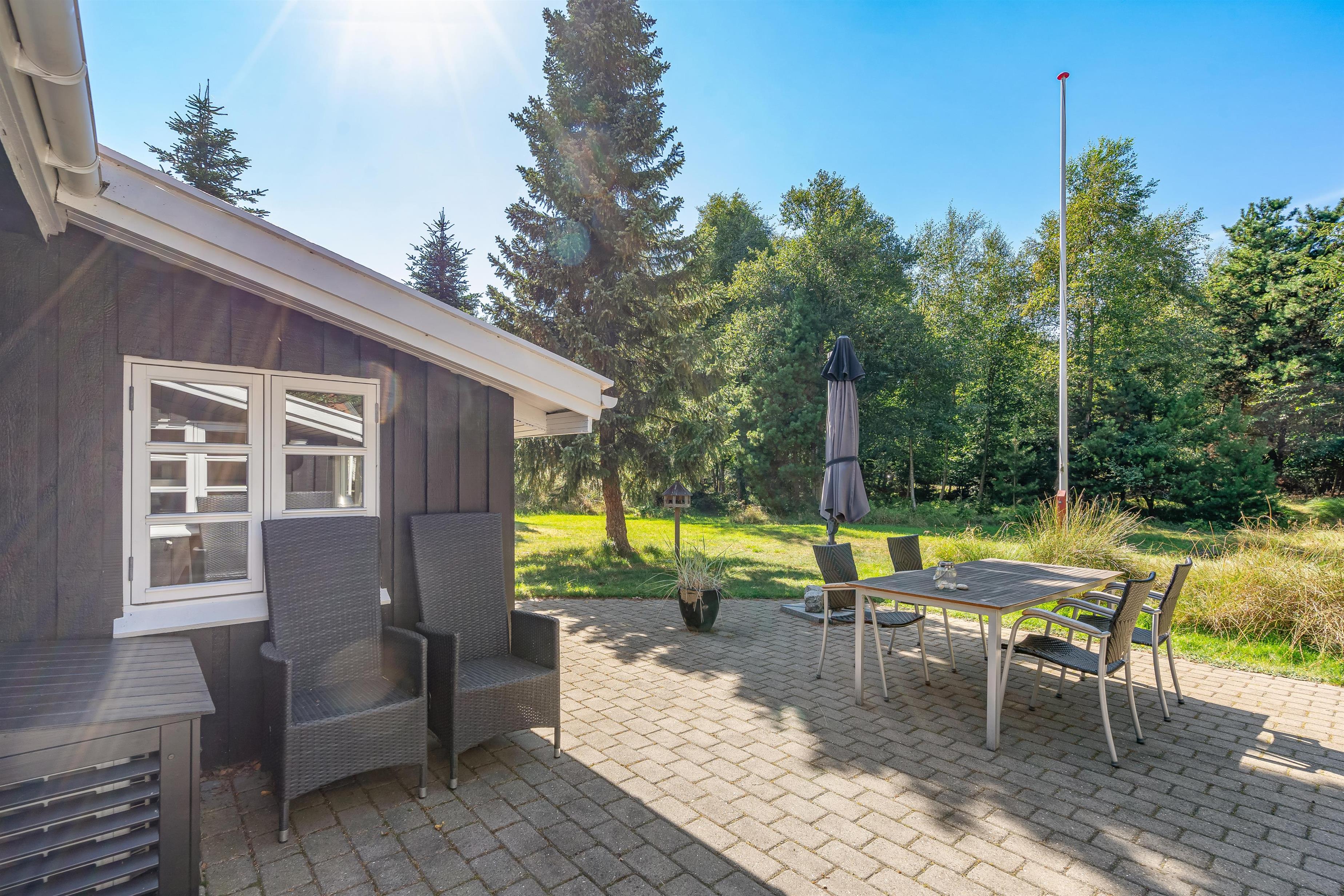 Det charmerende feriehus i Ho har en helt fantastisk og ugeneret beliggenhed midt i det grønne skovområde, og fra den åbne terrasse kan I hver dag nyde den friske luft og det flotte område. Der er selvfølgelig sørget for havemøbler, liggestole og grill til jer, så I kan udnytte de dejlige solskinsdage fuldt ud.