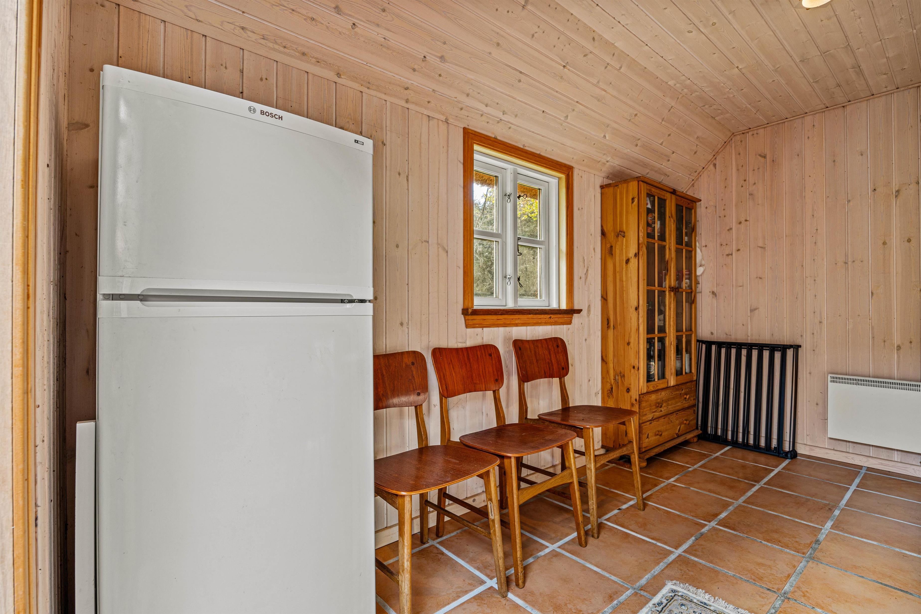 Det moderne køkken/alrum med gulvvarme er udstyret med opvaskemaskine, hvilket giver dig mere tid til de behagelige ting i livet. Uanset om du tilbereder en hurtig morgenmad eller en omfattende middag, lykkes alt uden besvær. Desuden finder du her et separat køleskab og fryser på 60 liter i annekset, der giver dig ekstra opbevaringsplads til forsyninger, så du er godt rustet til alle lejligheder.