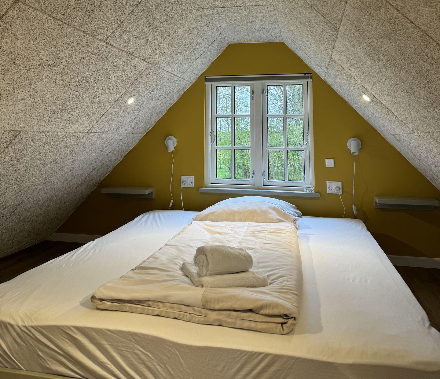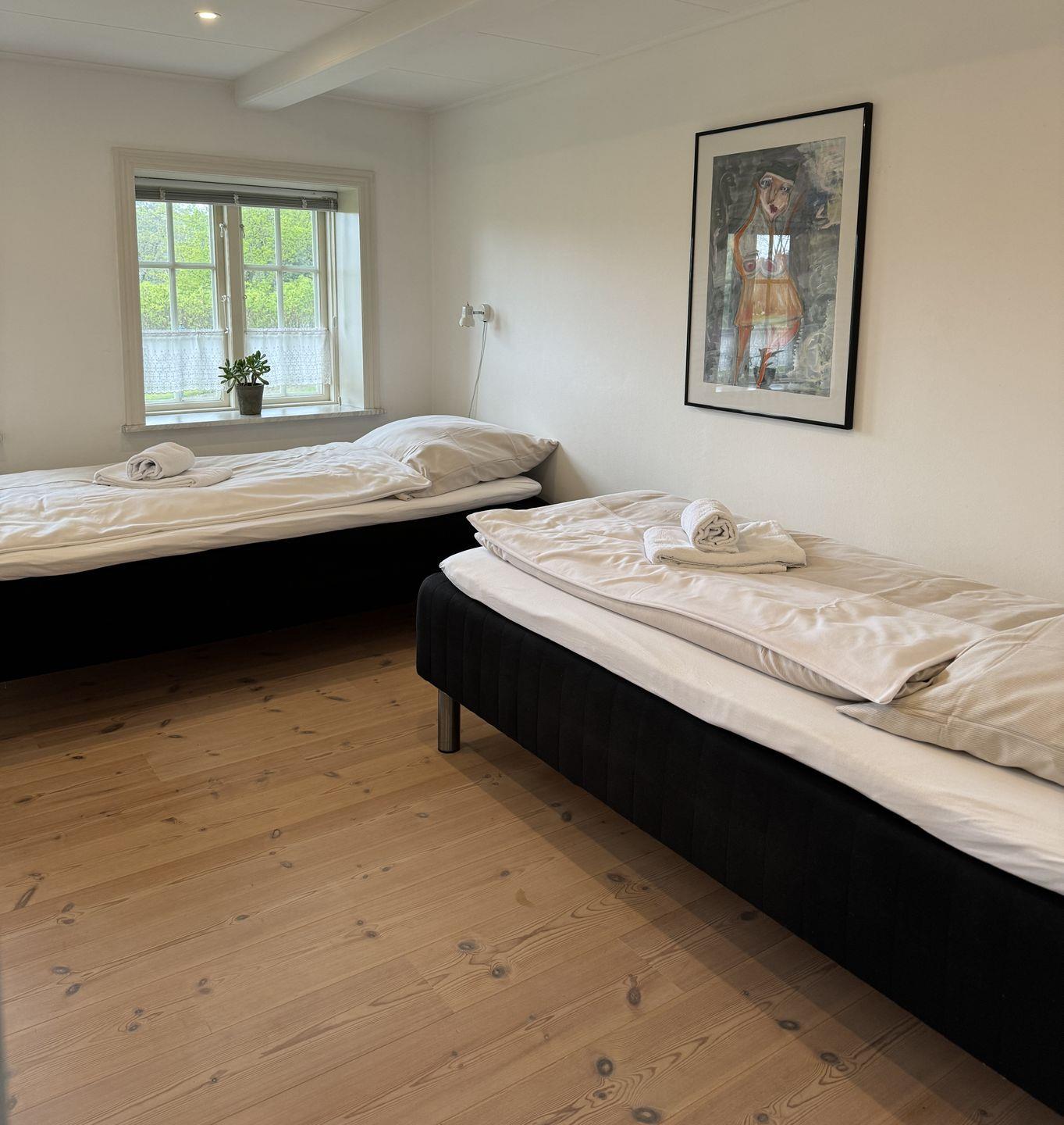 Das eine Zimmer hat ein Bett 1,40x 2,00 m. Im zweiten, viel größeren Zimmer befindet sich ein großes Doppelbett 1,80 x 2,00 m und ein Hems (ein offener Schlafboden mit Holzleiter) mit Stehhöhe, indem befindet sich ein Bett von 1,40 x 2,00 Meter.