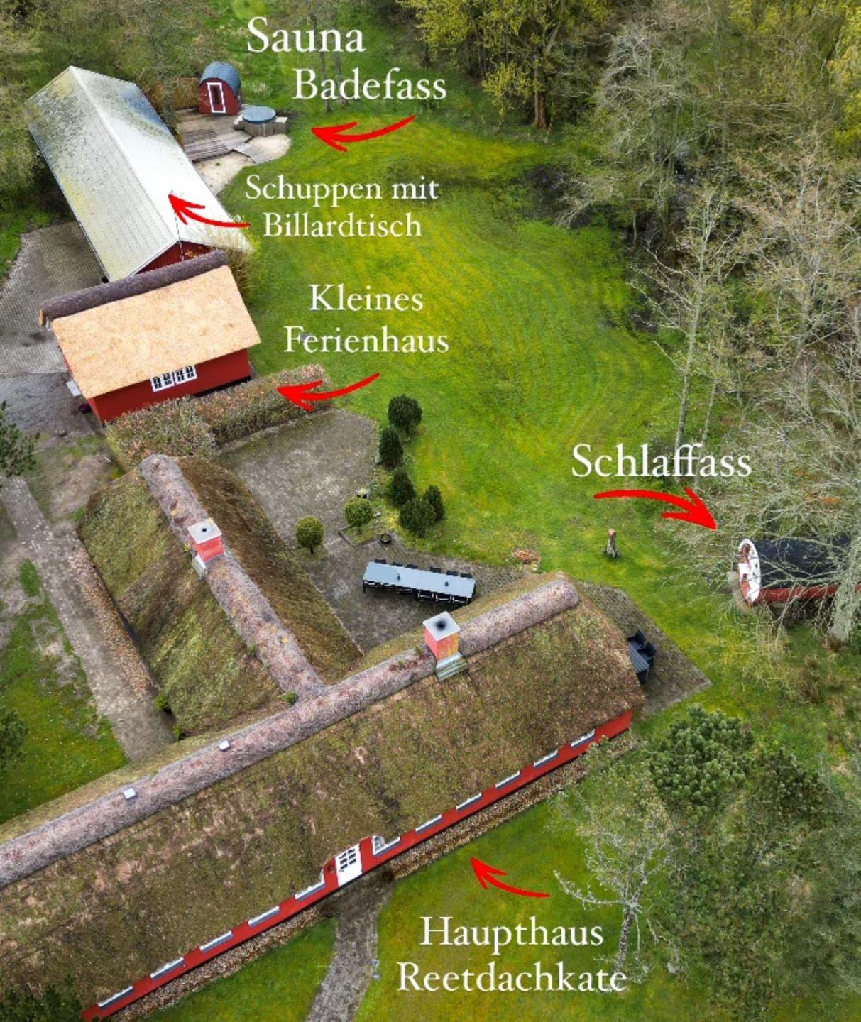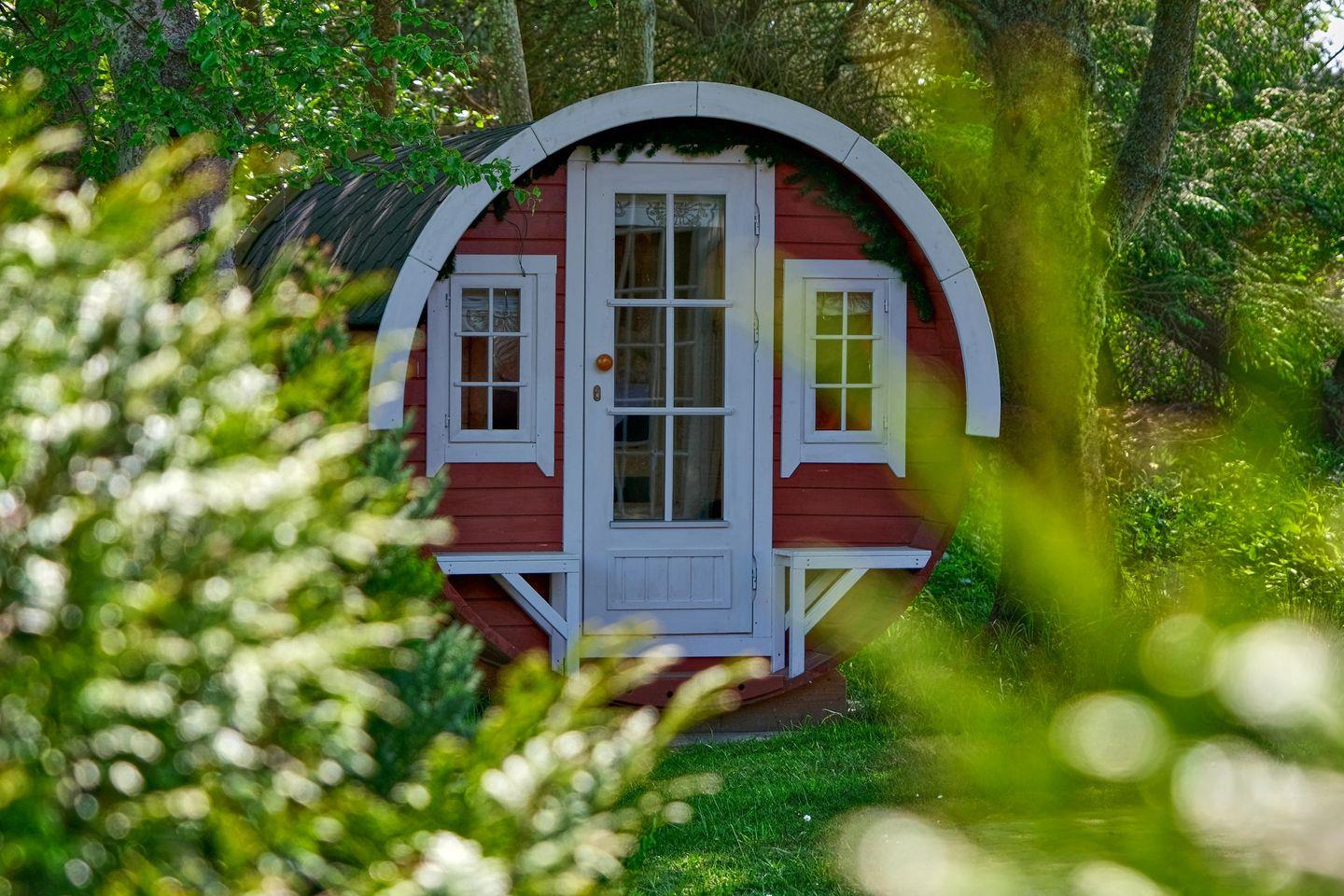 Jetzt kommt unsere kleine Besonderheit - 2 Meter von der Terrasse entfernt steht ein "Schlaffass", hier findet ihr ein großes gemütliches Bett von 2m x 2m. Das Fass steht inmitten von Bäumen und ist ein absolut hyggeliger Schlafplatz. Für kältere Nächte ist dort eine Heizung mit eingebaut.