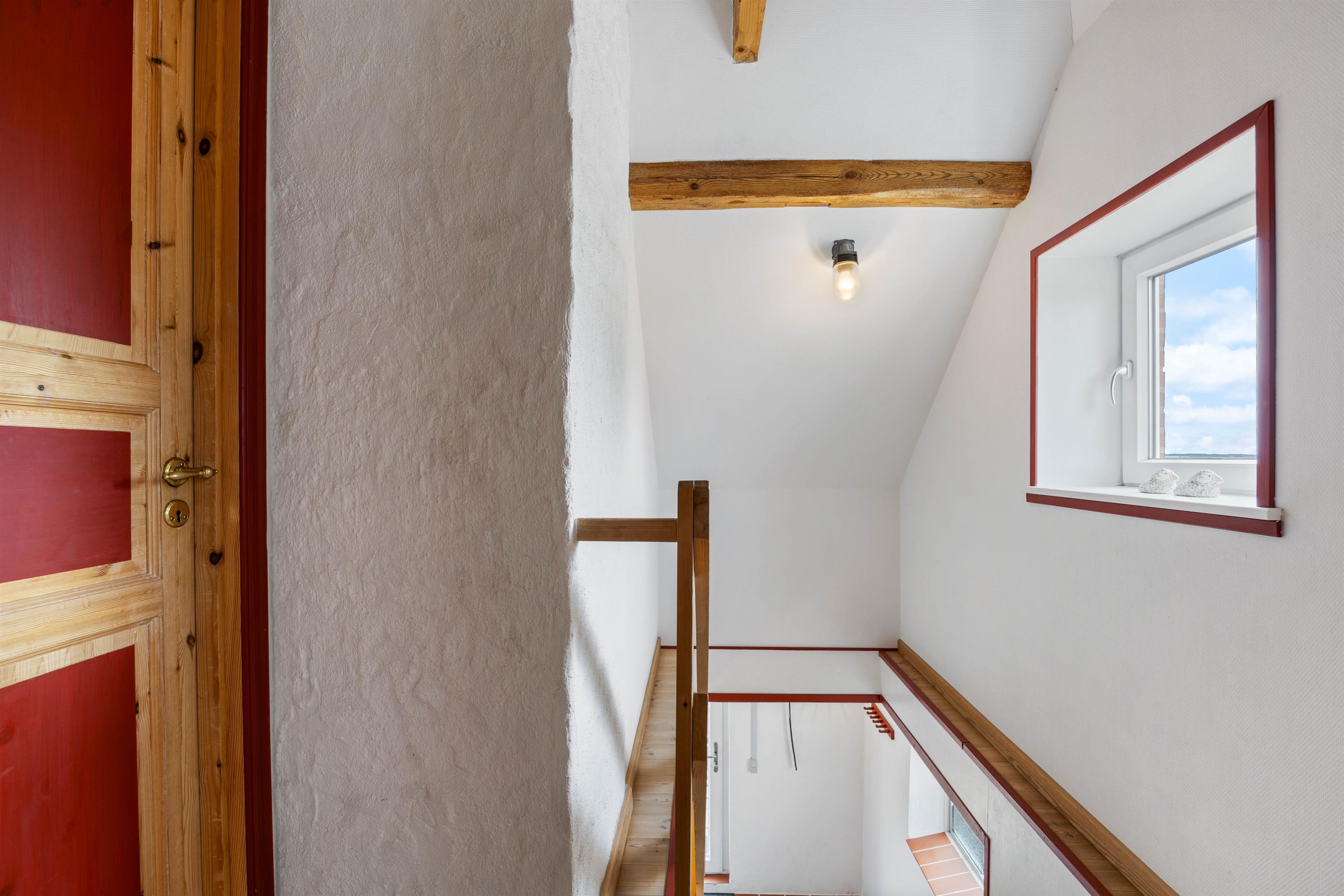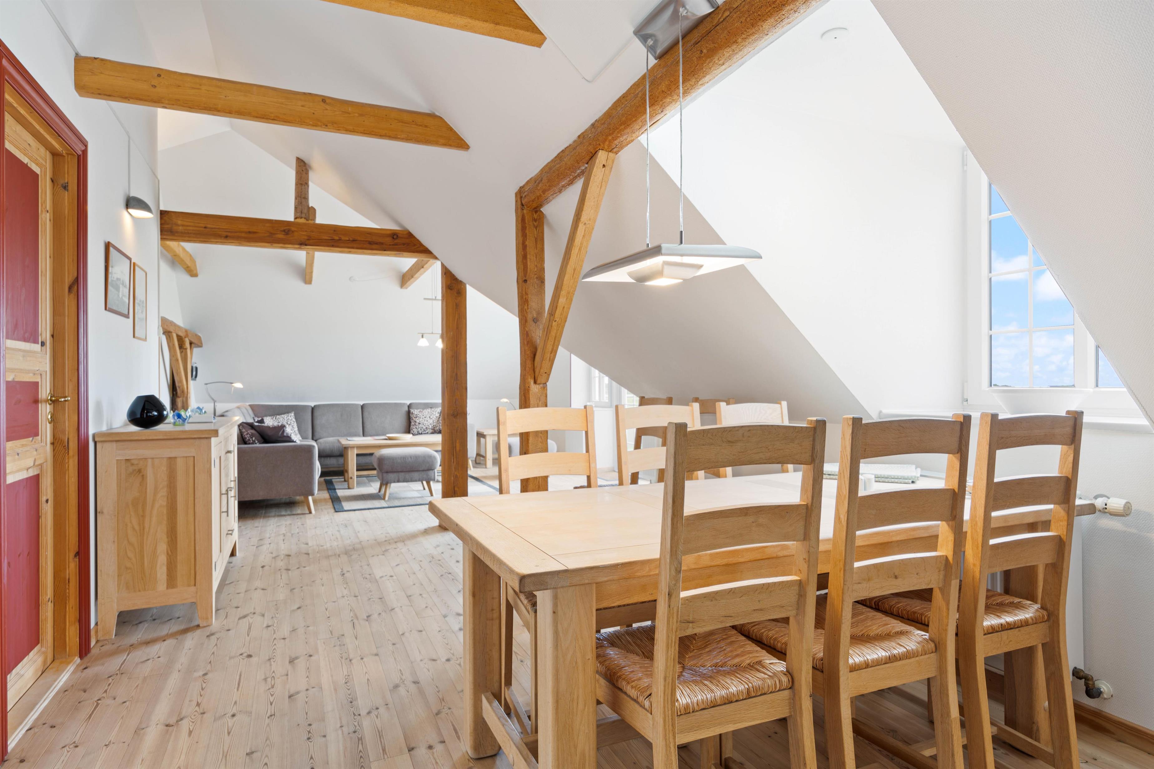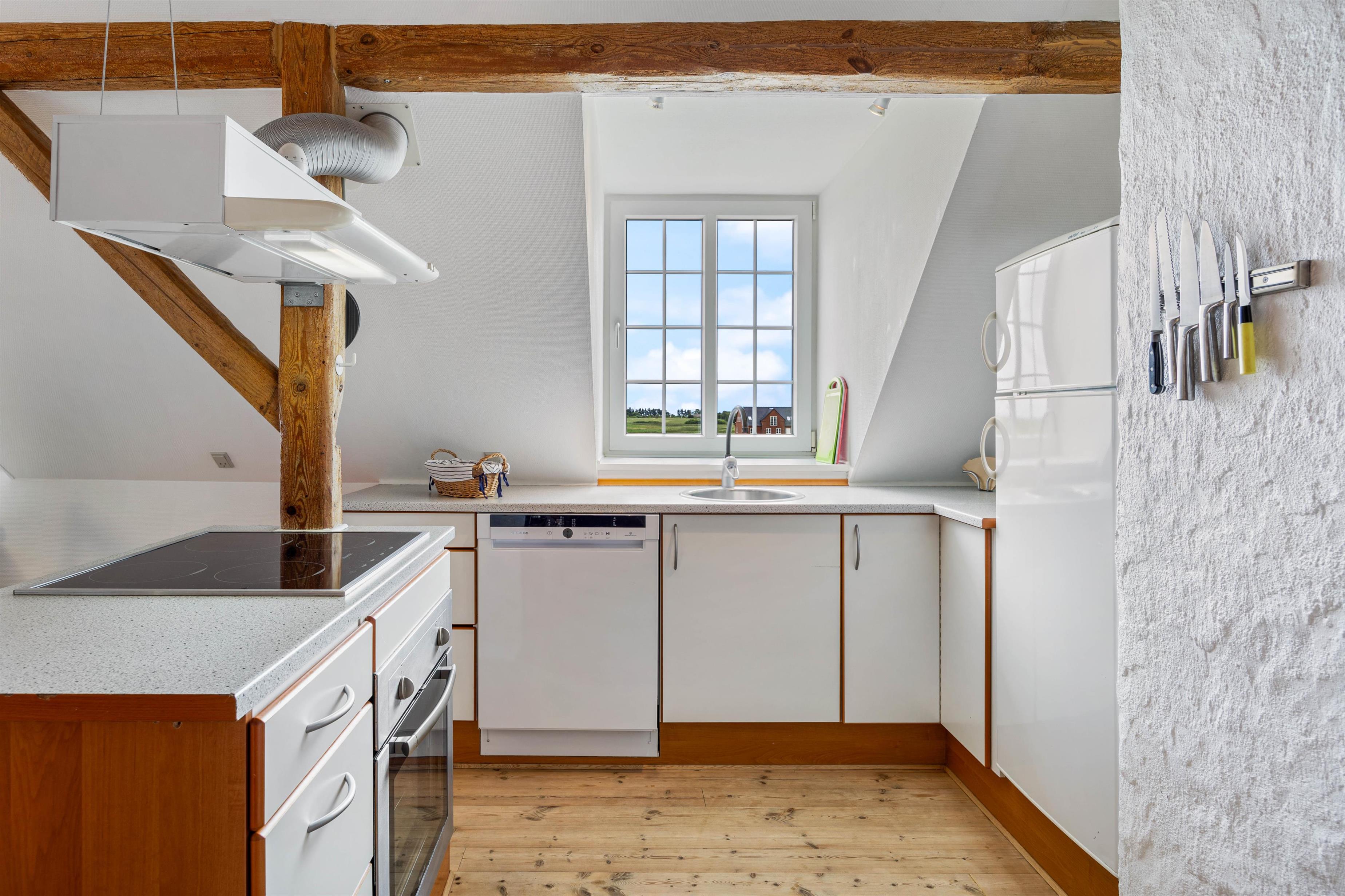 Ferielejligheden, der er placeret på øverste etage, er indrettet hyggeligt, landligt og med mange gode og rustikke detaljer. I entreen finder I en vaskemaskine og tørretumbler, så I kan få frisket jeres håndklæder op i løbet af jeres ferie.