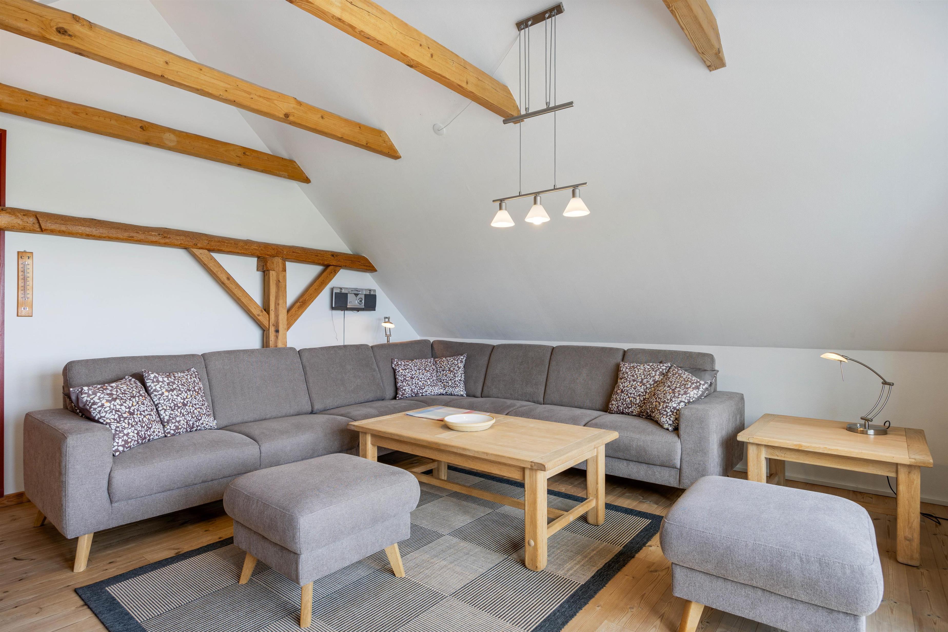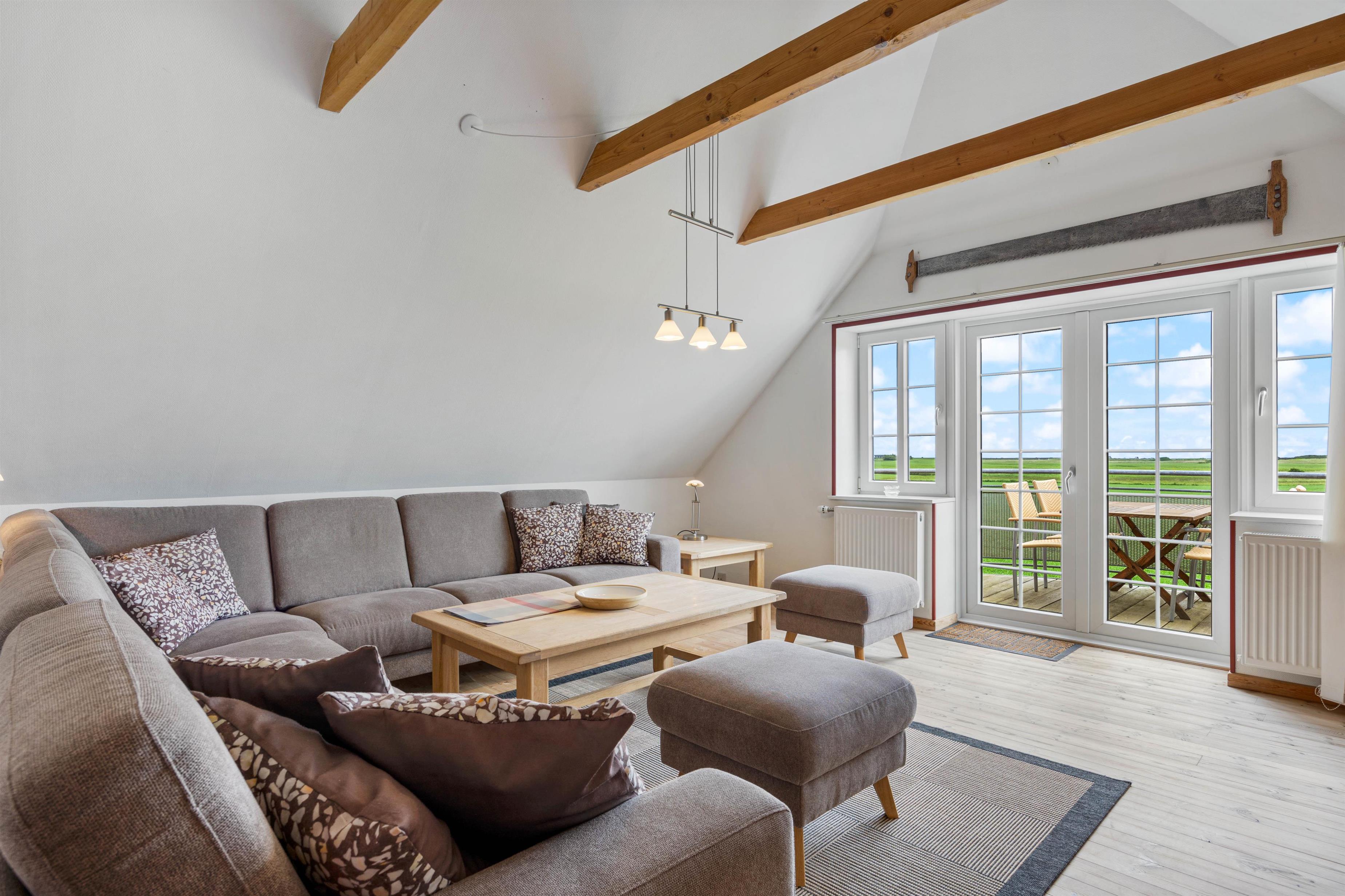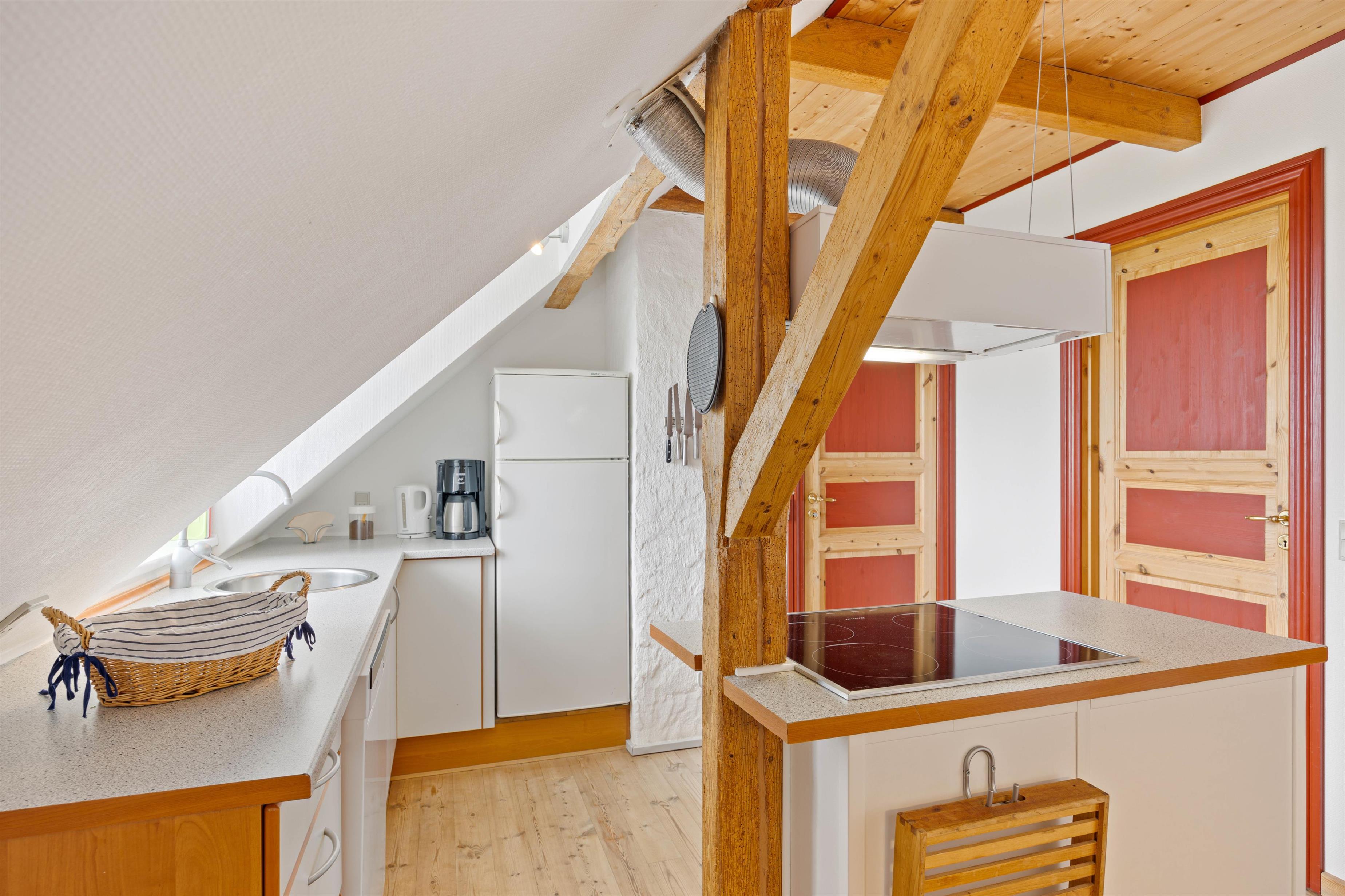 Ferielejligheden, der er placeret på øverste etage, er indrettet hyggeligt, landligt og med mange gode og rustikke detaljer. I entreen finder I en vaskemaskine og tørretumbler, så I kan få frisket jeres håndklæder op i løbet af jeres ferie.