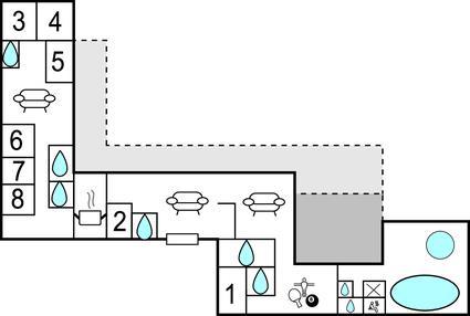 Fra køkkenet fører gangen til husets ene soveafdeling med 6 soveværelser, hvoraf flere er indrettede som familierum med både dobbeltseng og køjesenge på værelset. I denne ende af huset findes også tv-stuen med behagelige sofaer og stort fladskærms-tv samt 3 badeværelser med bruser og et gæstetoilet. Der findes en sovesofa i tv-stuen, og endnu en sovesofa i et gennemgangsrum. Et af soveværelserne med dobbeltseng ligger for sig selv mellem køkken og spisestue, og det ottende soveværelse ligger helt for sig selv ved siden af aktivitetsrummet. Til dette soveværelse hører et badeværelse med 2 håndvaske, bruser og badekar.