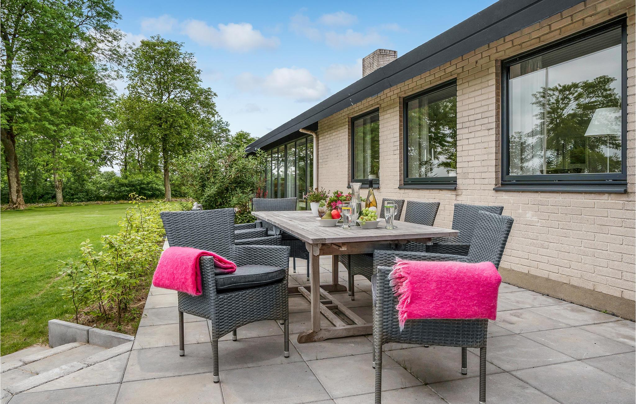 Huset har flere udgange til den åbne terrasse, der har en dejlig udsigt over landskabet. På terrassen står en stor grill samt gode havemøbler til alle gæster, og markisen kan køres ud efter behov. På den store græsplæne er der god plads til boldspil og udeaktiviteter.