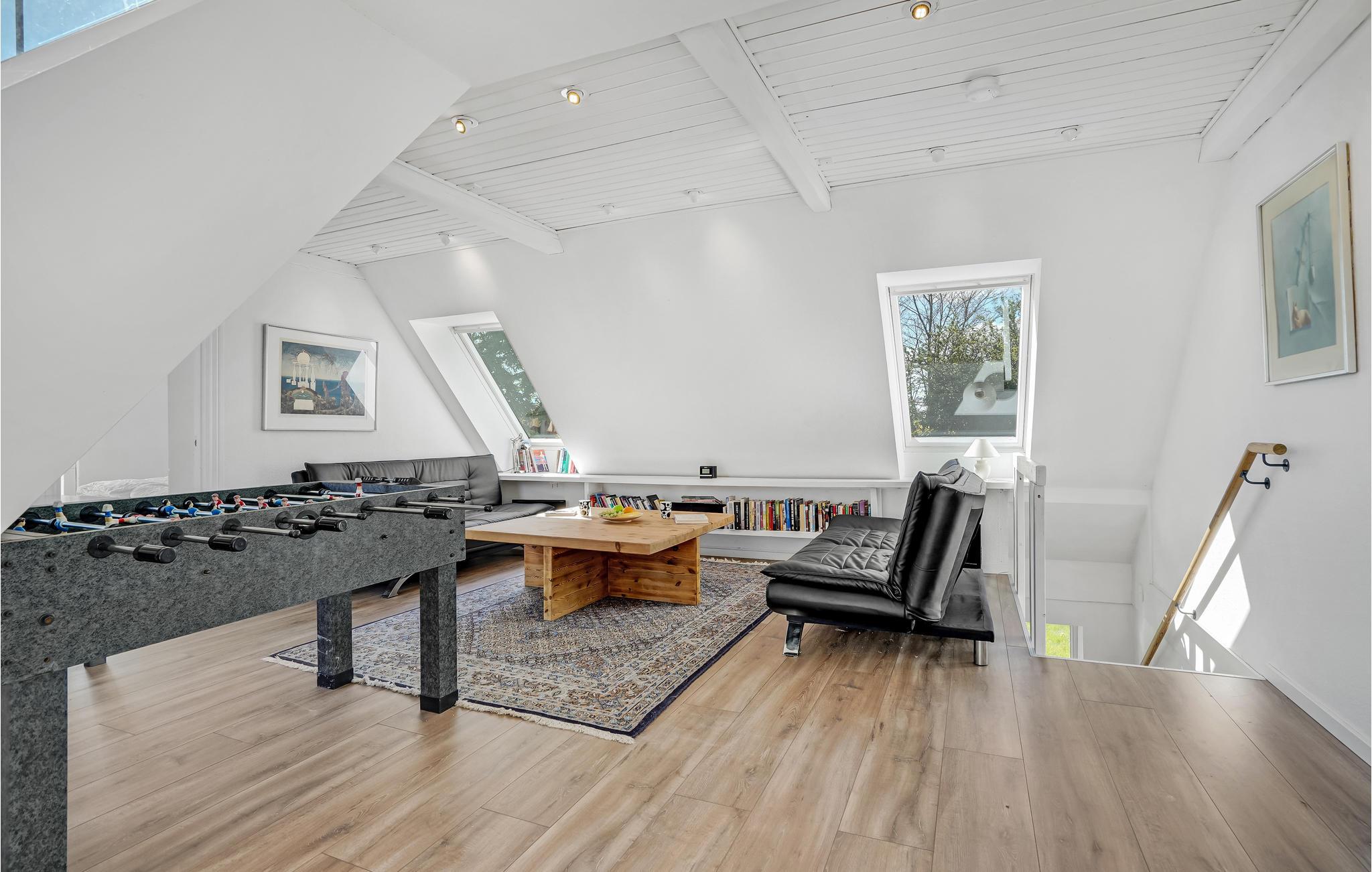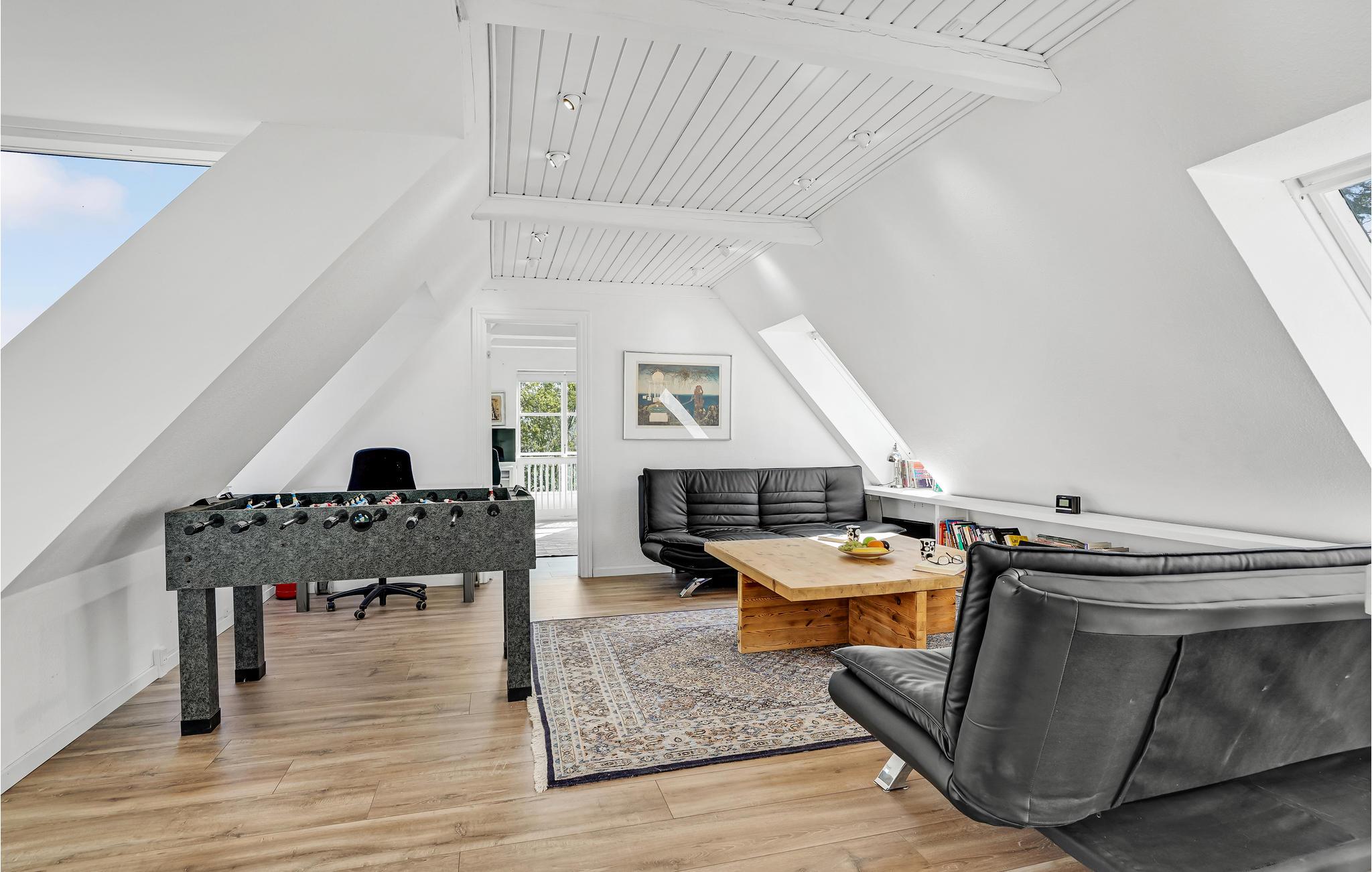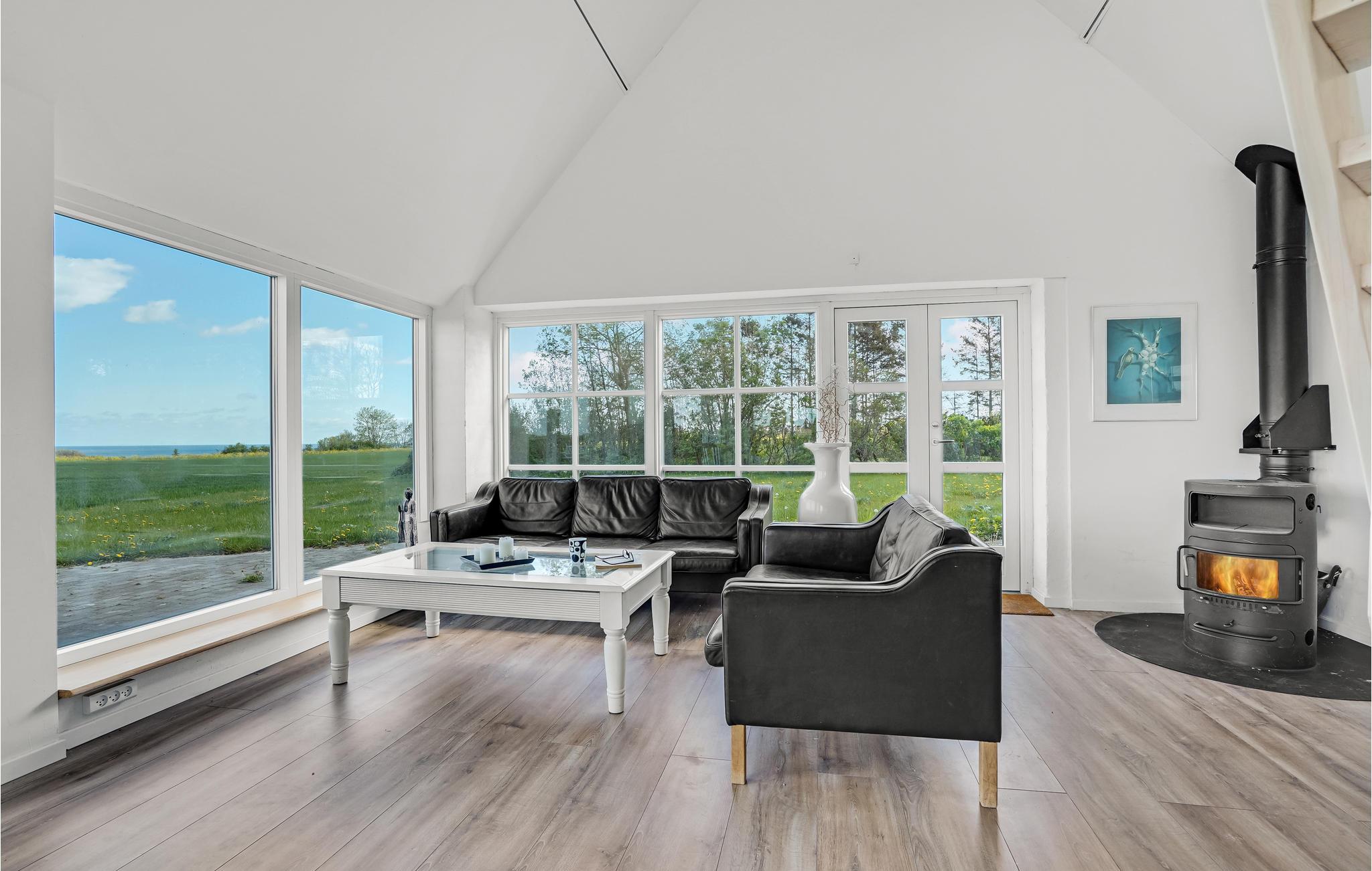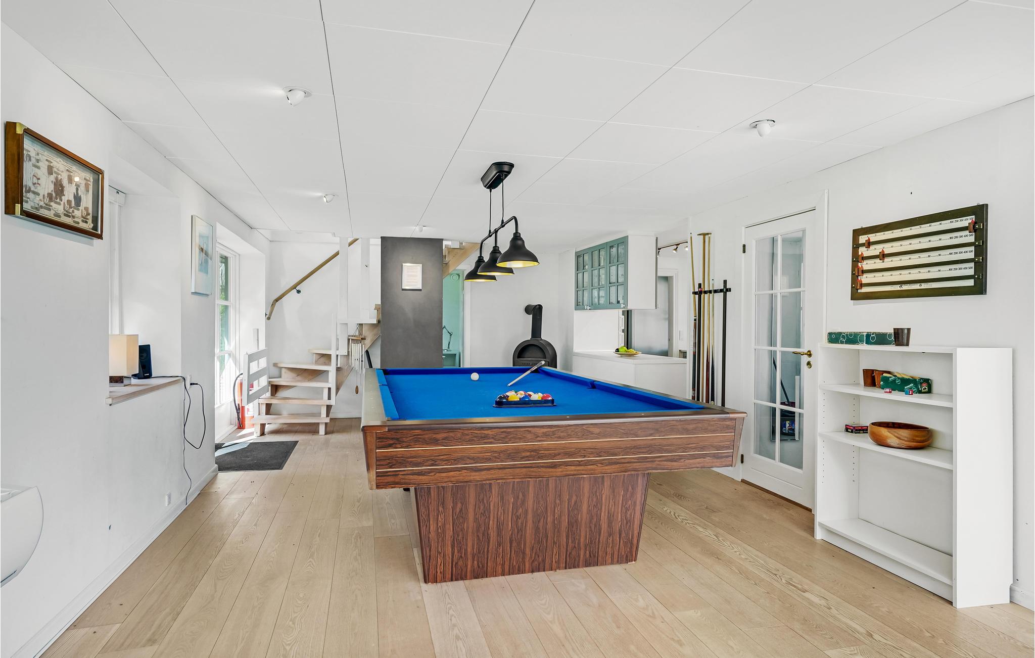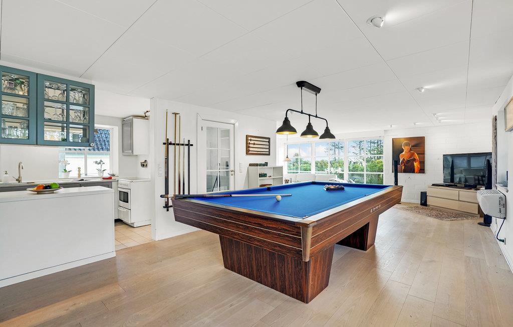 Velkommen indenfor i dette smagfuldt indrettede feriehus med stilfulde møbler. Her kan du hygge dig ved den lune pejs eller med et glas vin i stuen. Den originale, moderne udformning af rummene giver masser af plads og en behagelig atmosfære. Takket være de store vinduesfronter kommer der utroligt meget lys ind, hvilket bidrager til den afslappede, naturnære stemning. Alle gæster får noget for pengene her, ikke mindst i aktivitetsrummet, hvor et poolbord venter på dig. Udenfor er der en rummelig terrasse samt havemøbler og en grill, som inviterer til at nyde morgenmaden i det fri og afslutte dagene med grillmad og havudsigt.