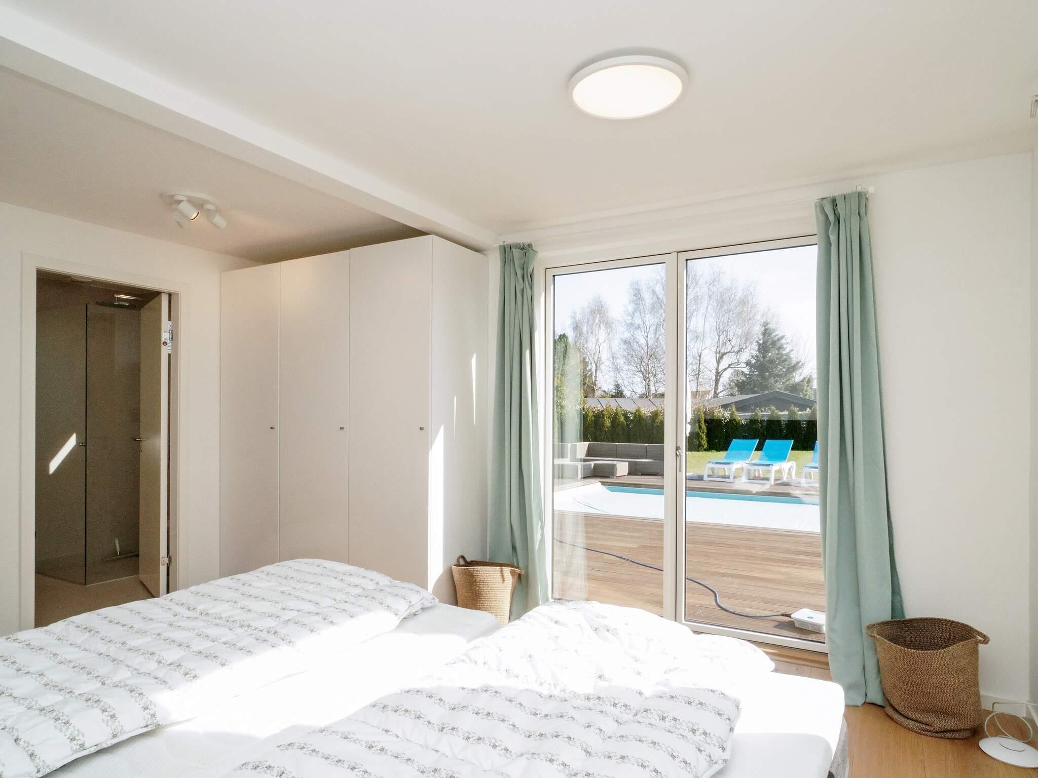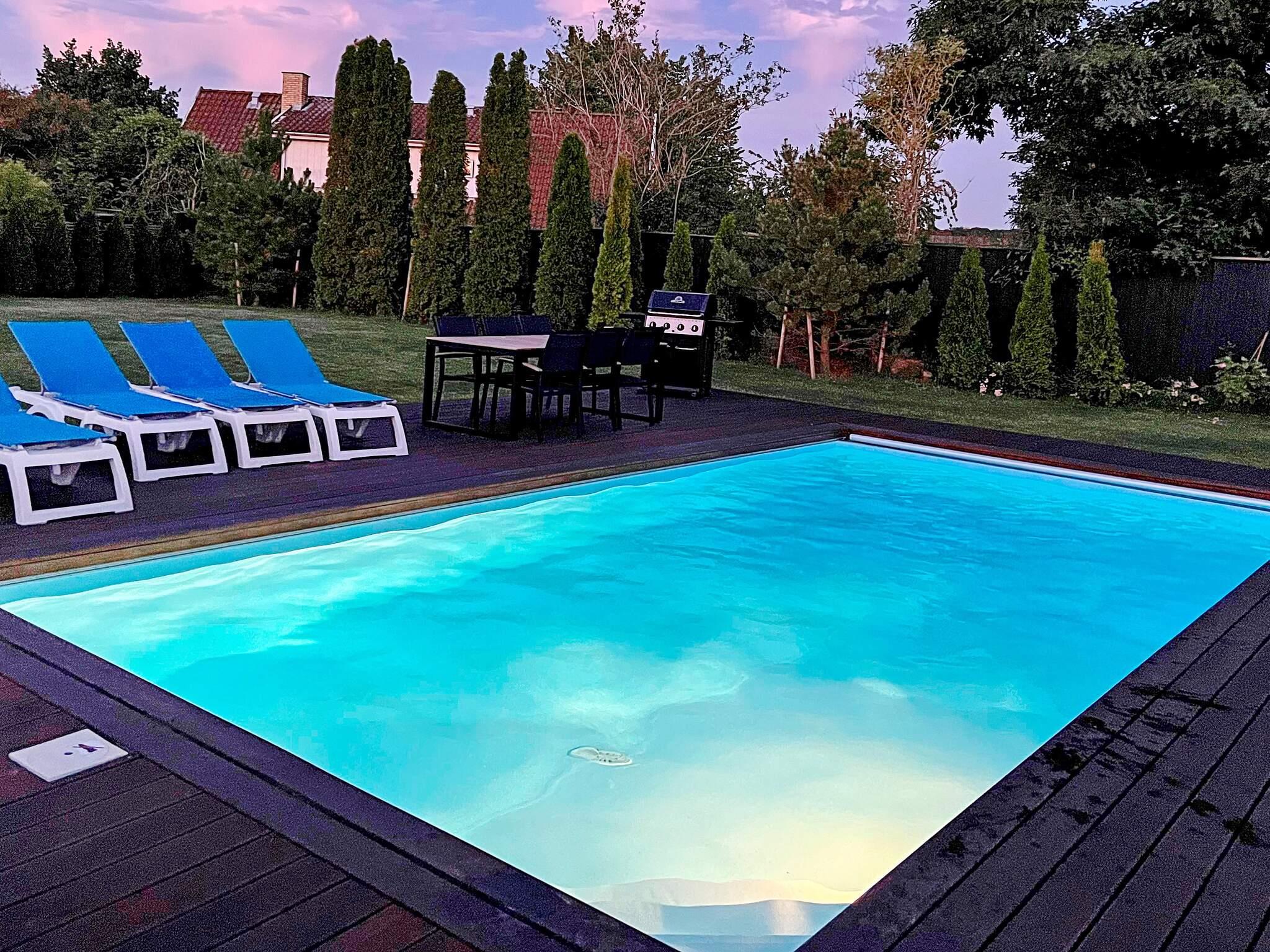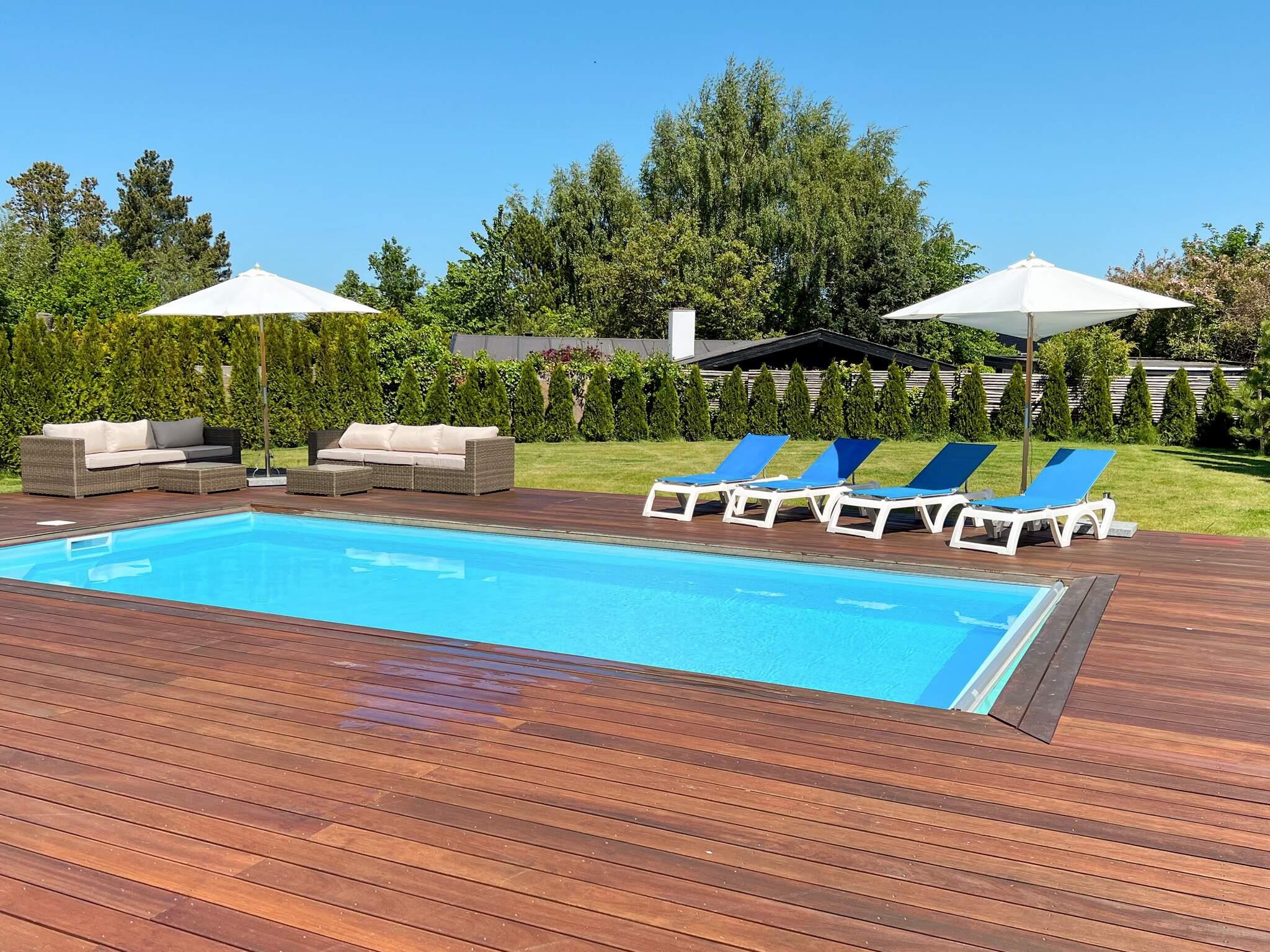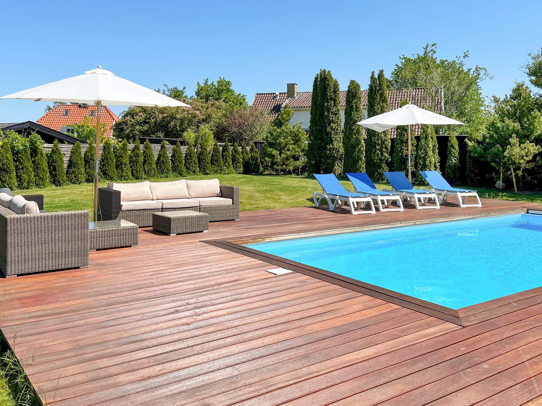 Udendørsområdet er designet til afslapning og sjov. En stor terrasse med havemøbler omgiver den opvarmede pool og byder på solrige og skyggefulde steder at nyde den friske luft. En gasgrill er også tilgængelig, så du kan få mest muligt ud af de varme sommeraftener udenfor. Poolen har et praktisk sikkerhedsdæksel, der kan lukkes automatisk. Den opvarmes med en energibesparende luft til vand varmepumpe kombineret med solpaneler, hvilket sikrer behagelige vandtemperaturer hele sæsonen.