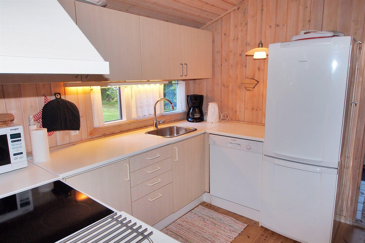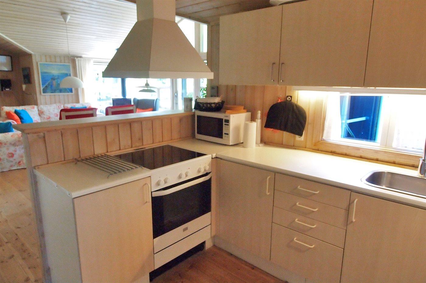 Køkkenet er udstyret med 1 køleskab. Der er 4 keramiske kogeplader, varmluftovn, mikrobølgeovn samt opvaskemaskine.