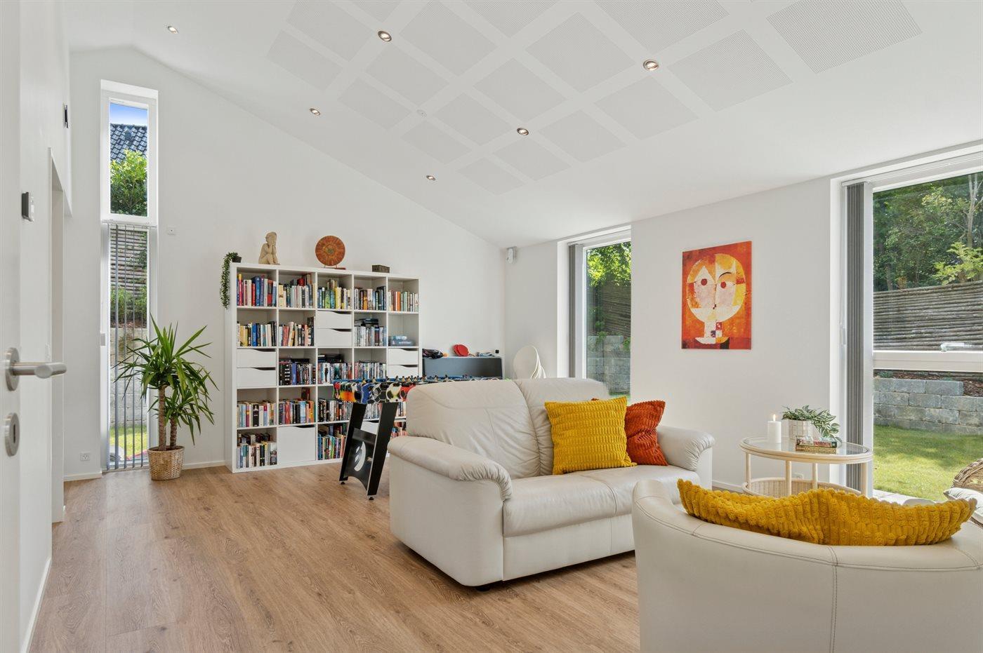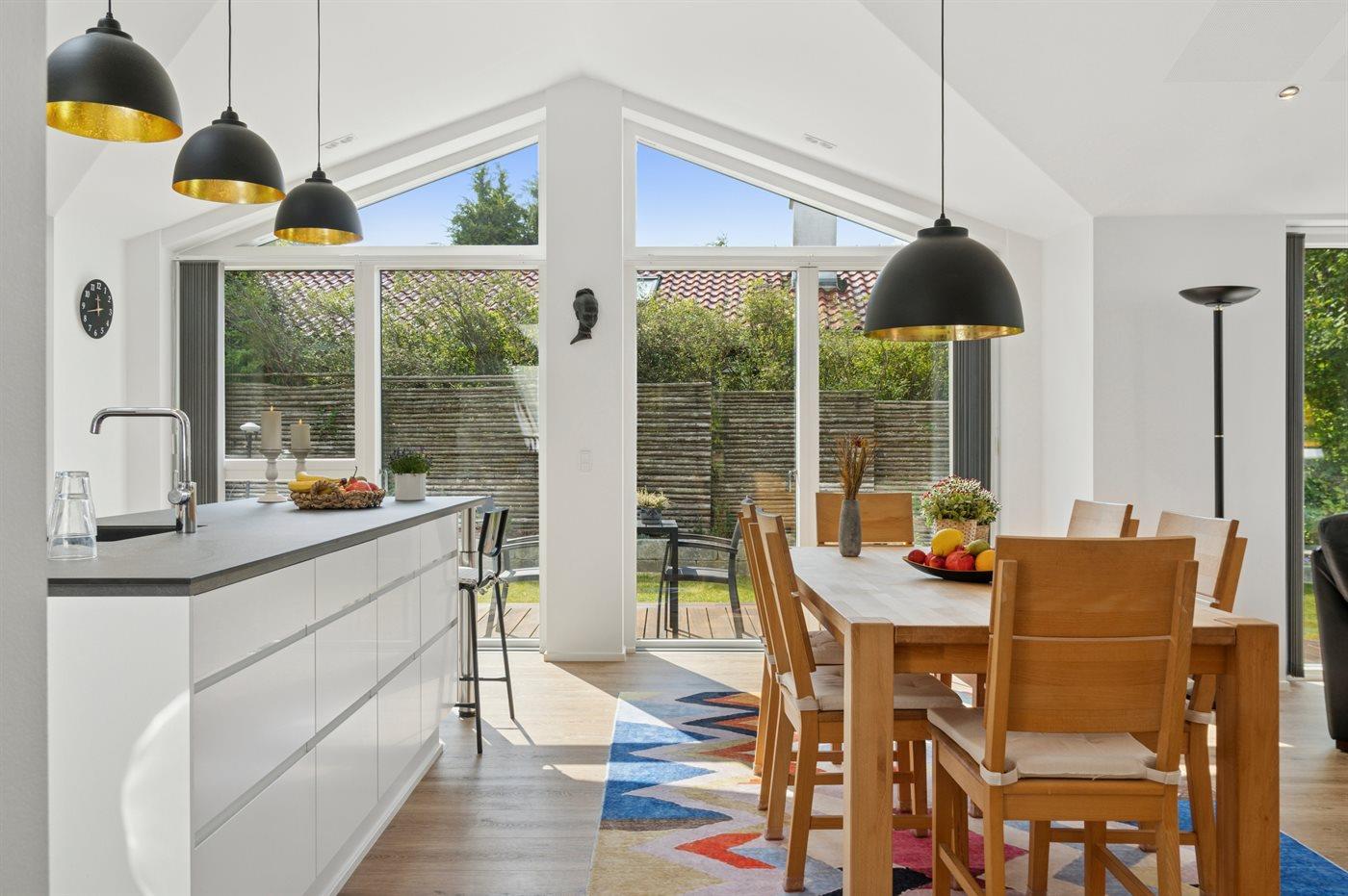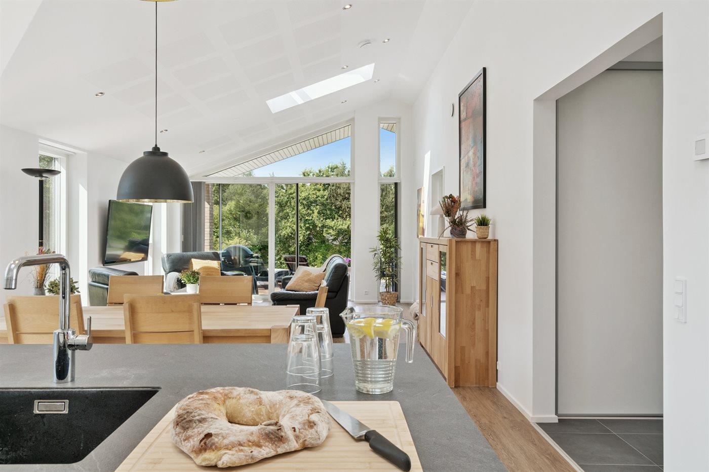 Huset er opført i en tidløs stil med kvalitetsmaterialer og store vinduespartier, som skaber et naturligt lysindfald og en smuk forbindelse til de grønne omgivelser. Indretningen er åben og funktionel med køkken, alrum og stue i ét – ideelt til hyggelige stunder med familie og venner.