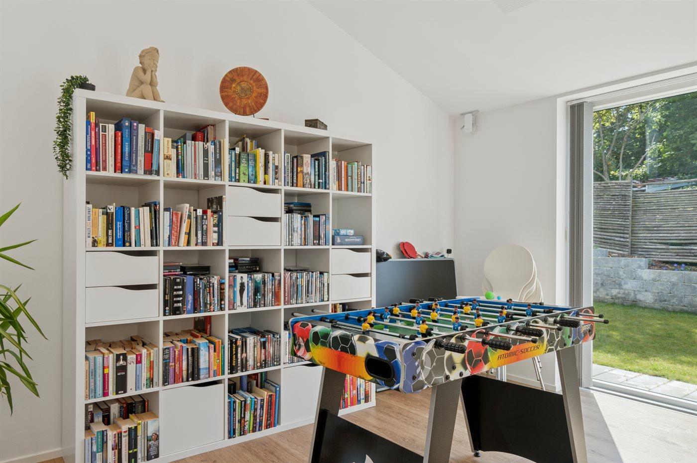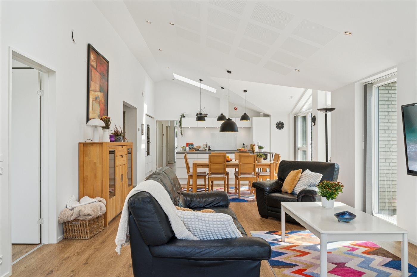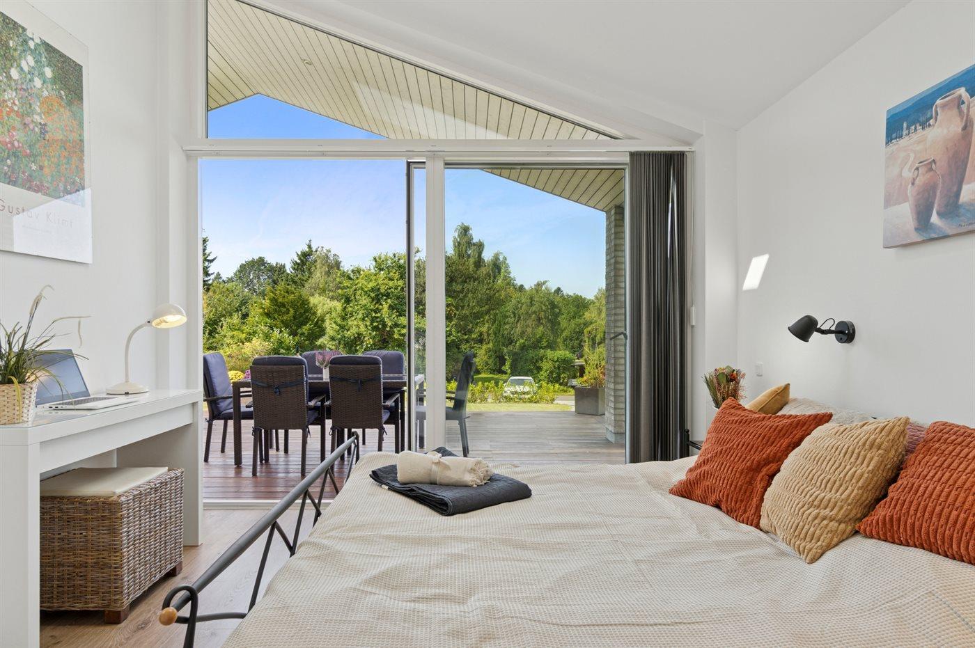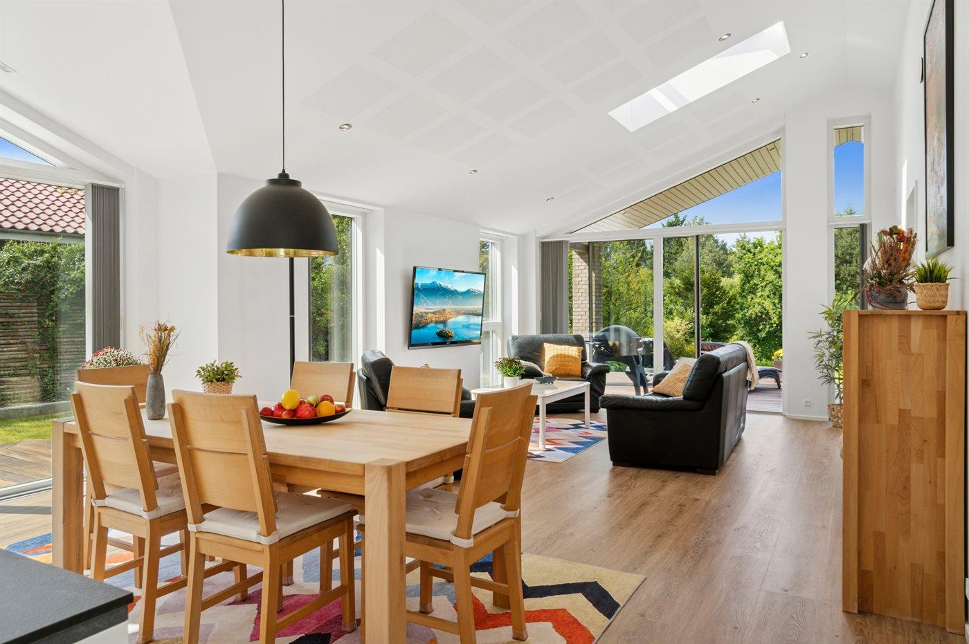 Huset er opført i en tidløs stil med kvalitetsmaterialer og store vinduespartier, som skaber et naturligt lysindfald og en smuk forbindelse til de grønne omgivelser. Indretningen er åben og funktionel med køkken, alrum og stue i ét – ideelt til hyggelige stunder med familie og venner.