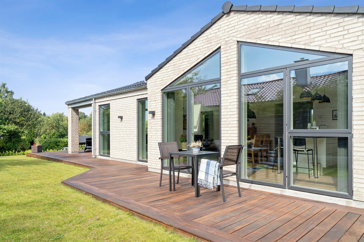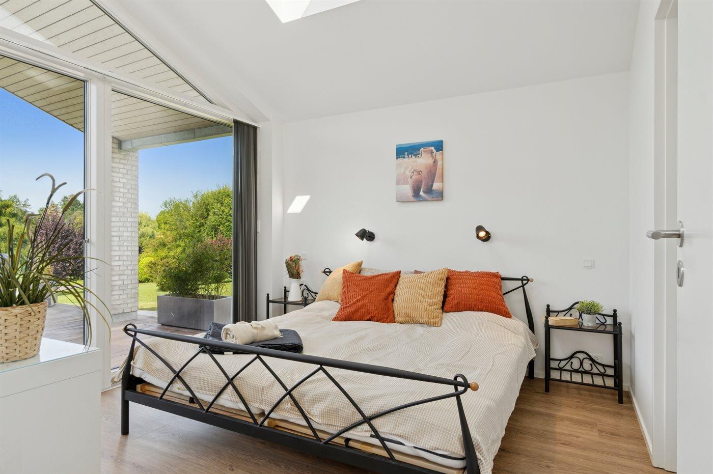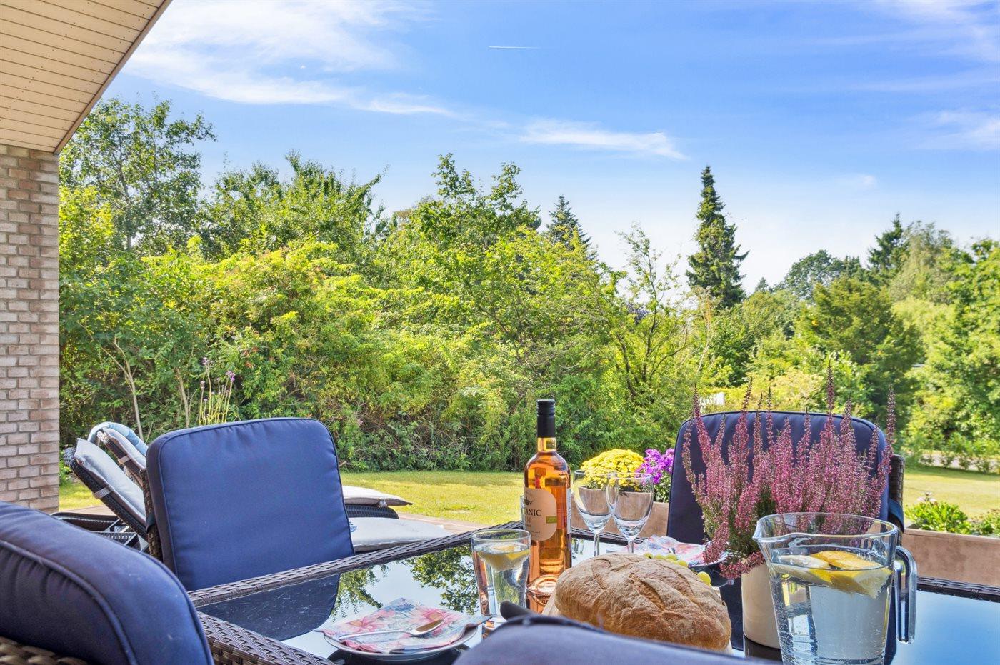 Udendørs finder du en stor træterrasse og en have, hvor solen kan nydes hele dagen. Her er plads til afslapning, grill og leg i fredelige omgivelser.