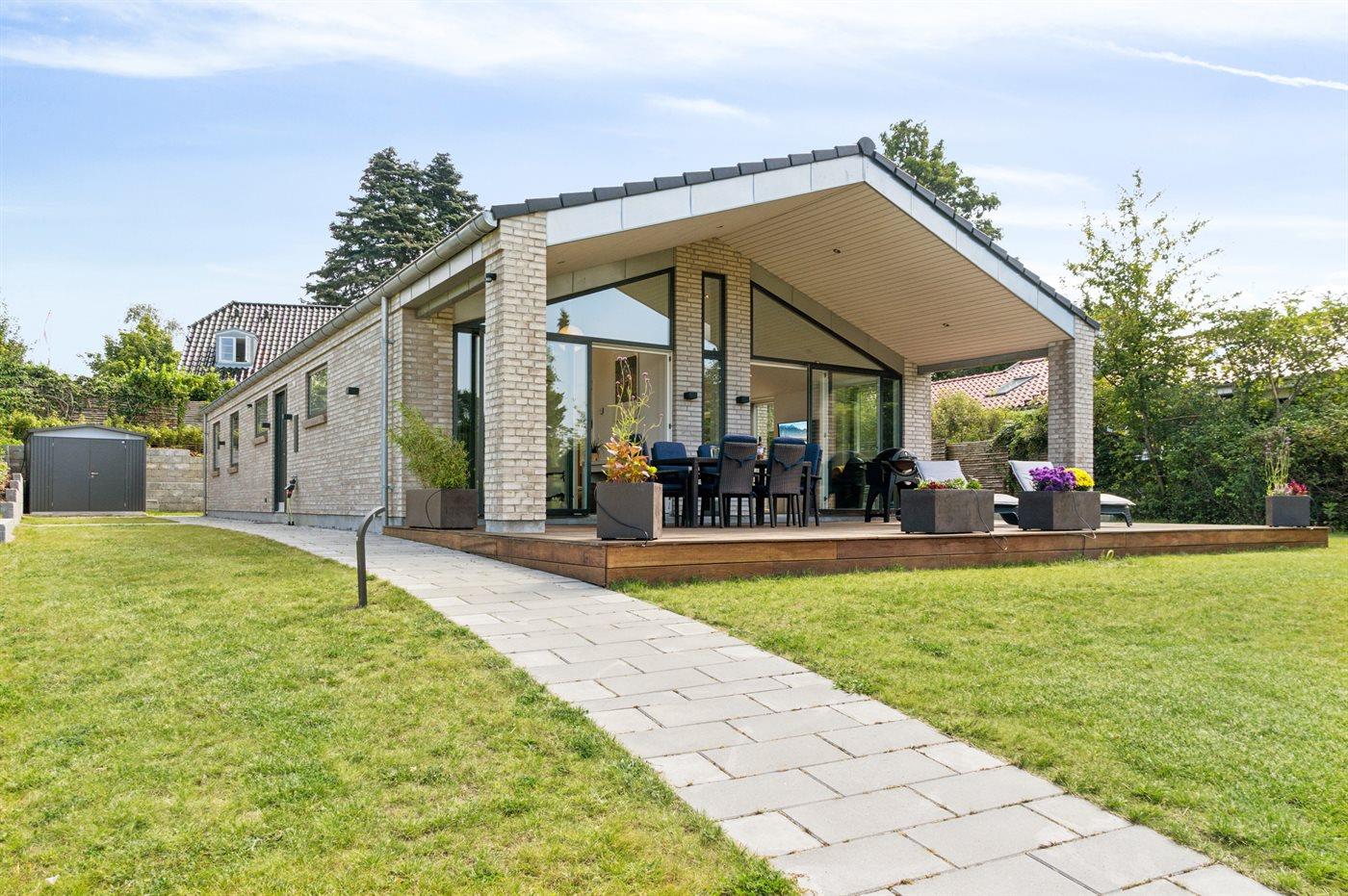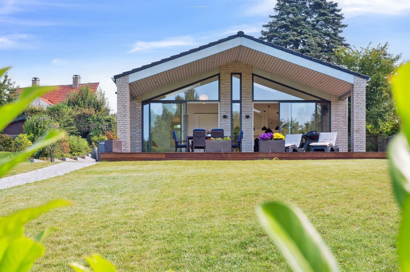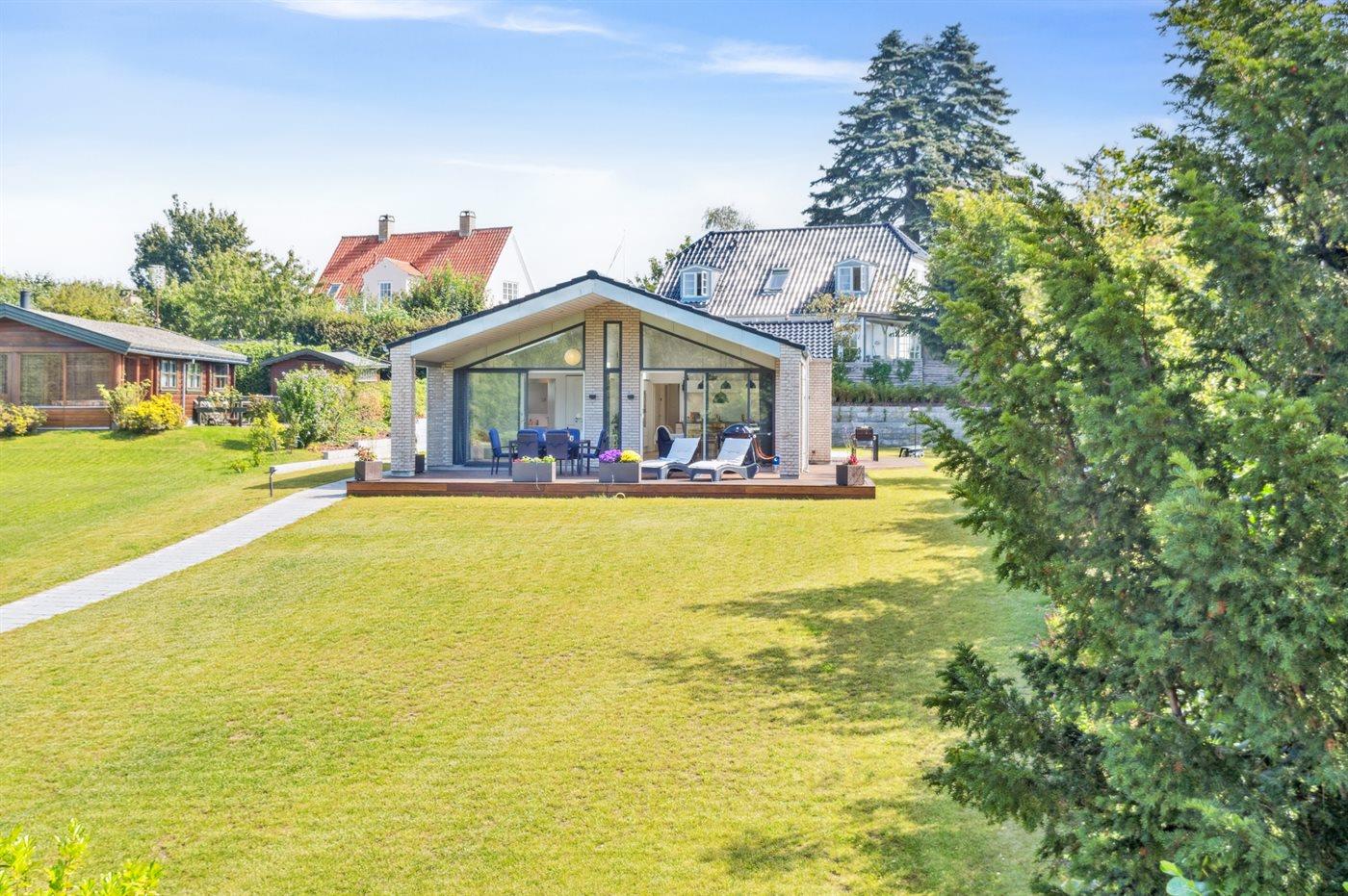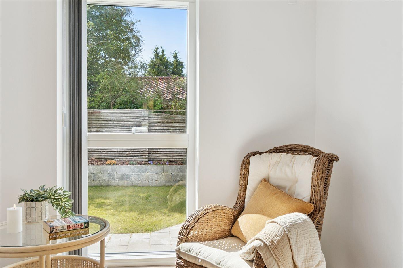 Udendørs finder du en stor træterrasse og en have, hvor solen kan nydes hele dagen. Her er plads til afslapning, grill og leg i fredelige omgivelser.