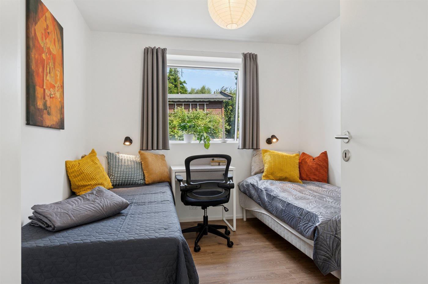 Der er i alt 3 soveværelser. Sovepladserne fordeler sig på: 2 sovepladser i dobbeltseng. 4 sovepladser i enkeltsenge.