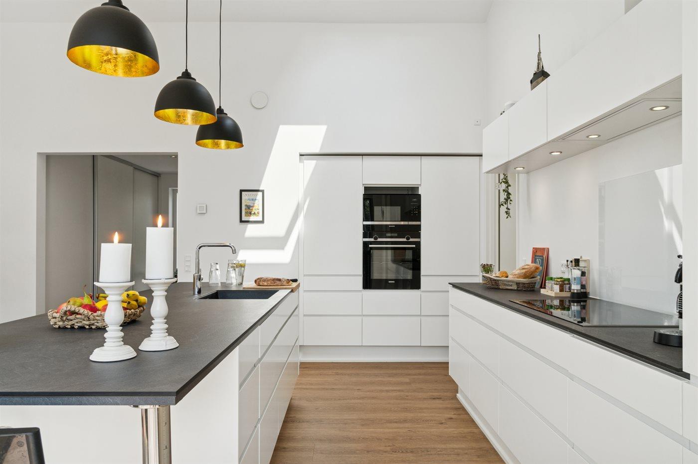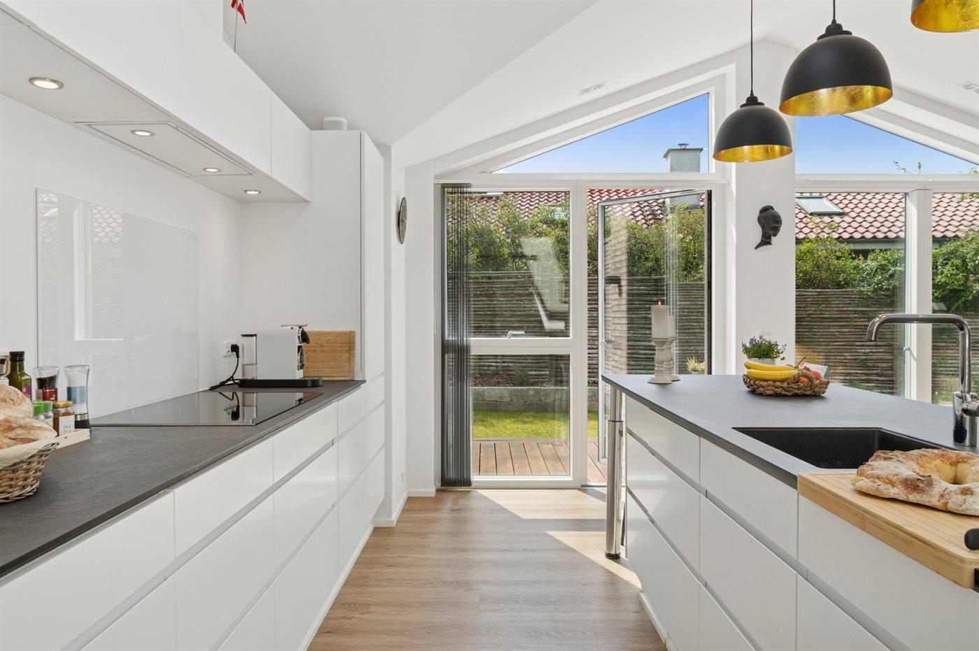 Køkkenet er udstyret med 1 køleskab. Der er 4 induktionskogeplader, varmluftovn, mikrobølgeovn samt opvaskemaskine.