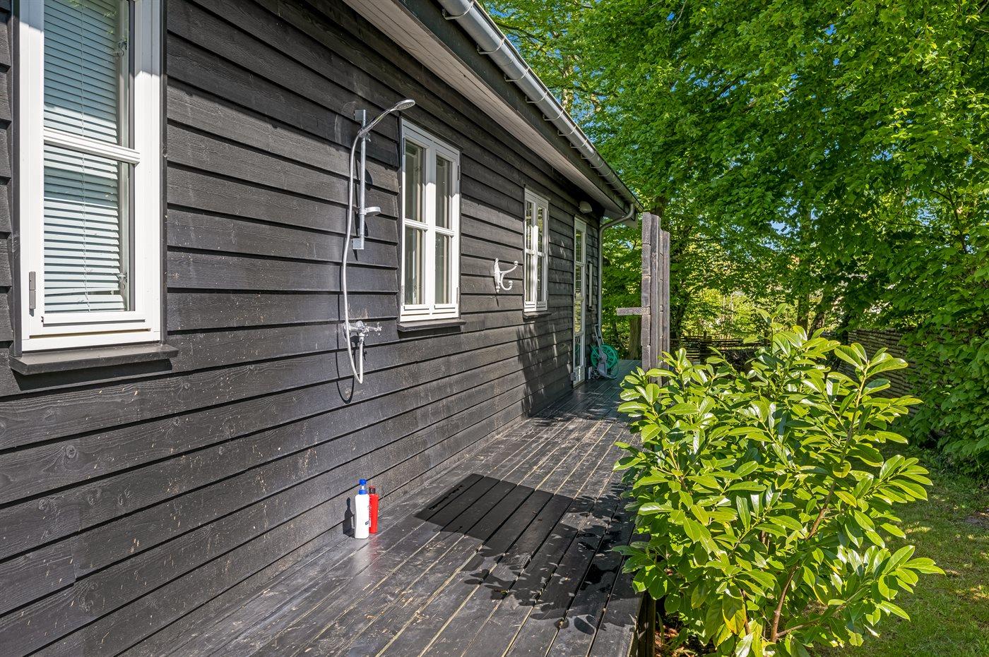 Ferieboligen er beliggende på en 1380 m² stor havegrund. Der er 275 m til havet. Nærmeste forretning er beliggende i en afstand af 200 m. Til ferieboligen hører åbent terrasseareal. Desuden er der overdækket terrasse. Trampolin. Udendørs bruser. Der er mulighed for at tilberede maden udendørs i udekøkkenet. Grill til rådighed. Parkering ved ferieboligen.