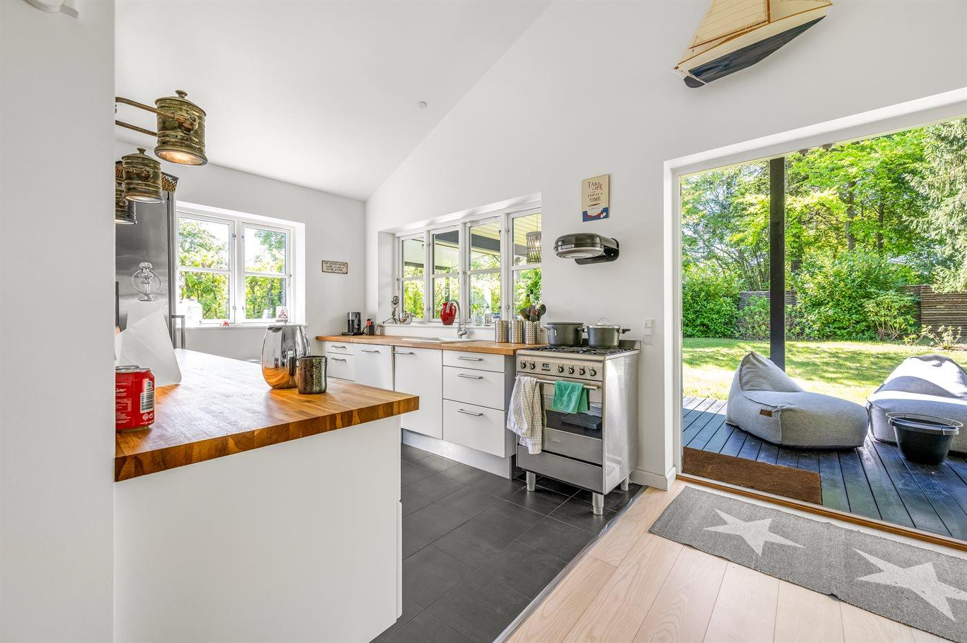 Køkkenet er udstyret med 1 køleskab. Der er 4 gasblus, varmluftovn samt opvaskemaskine.