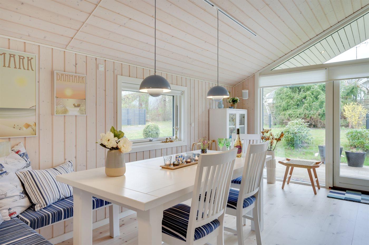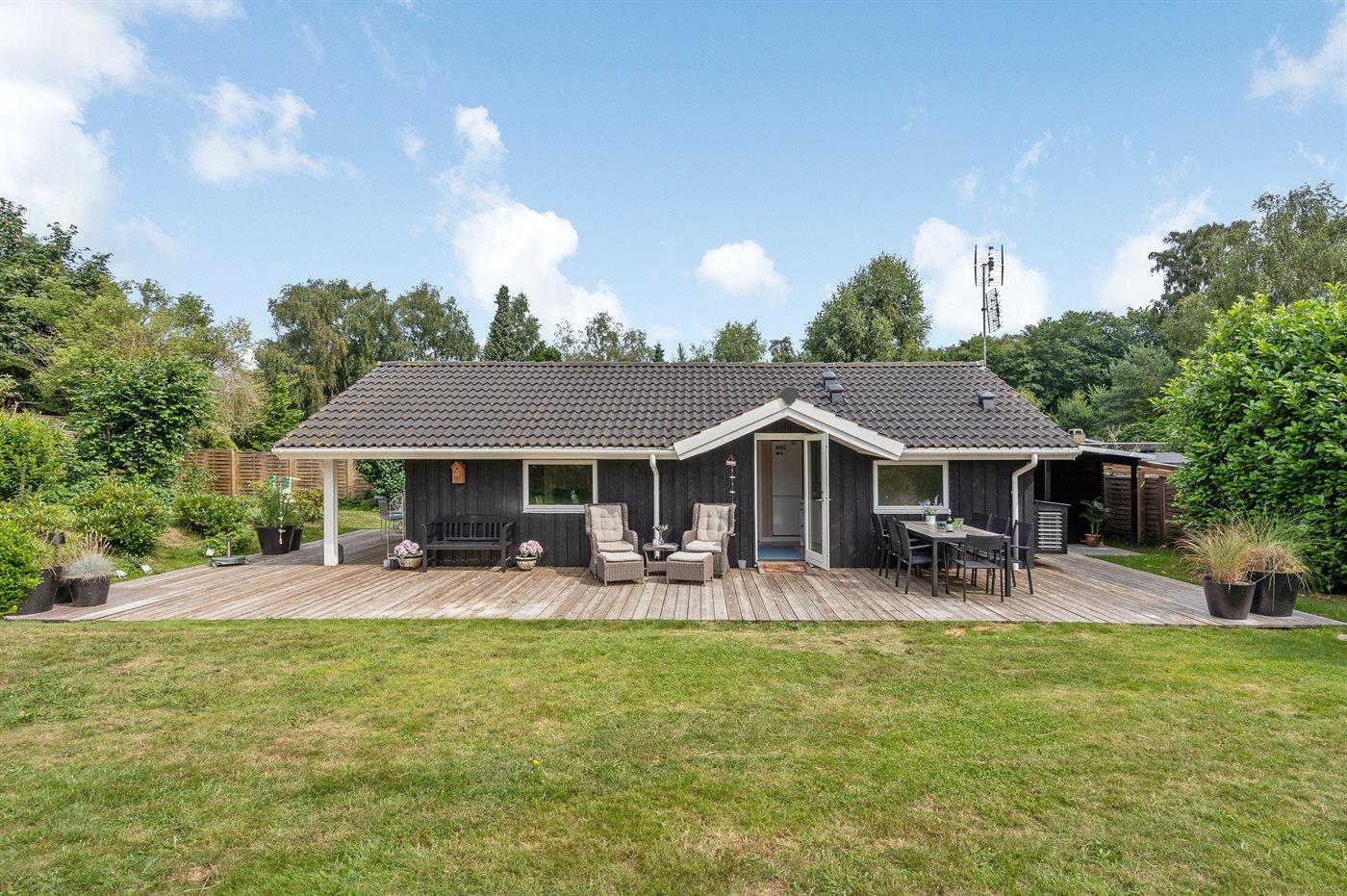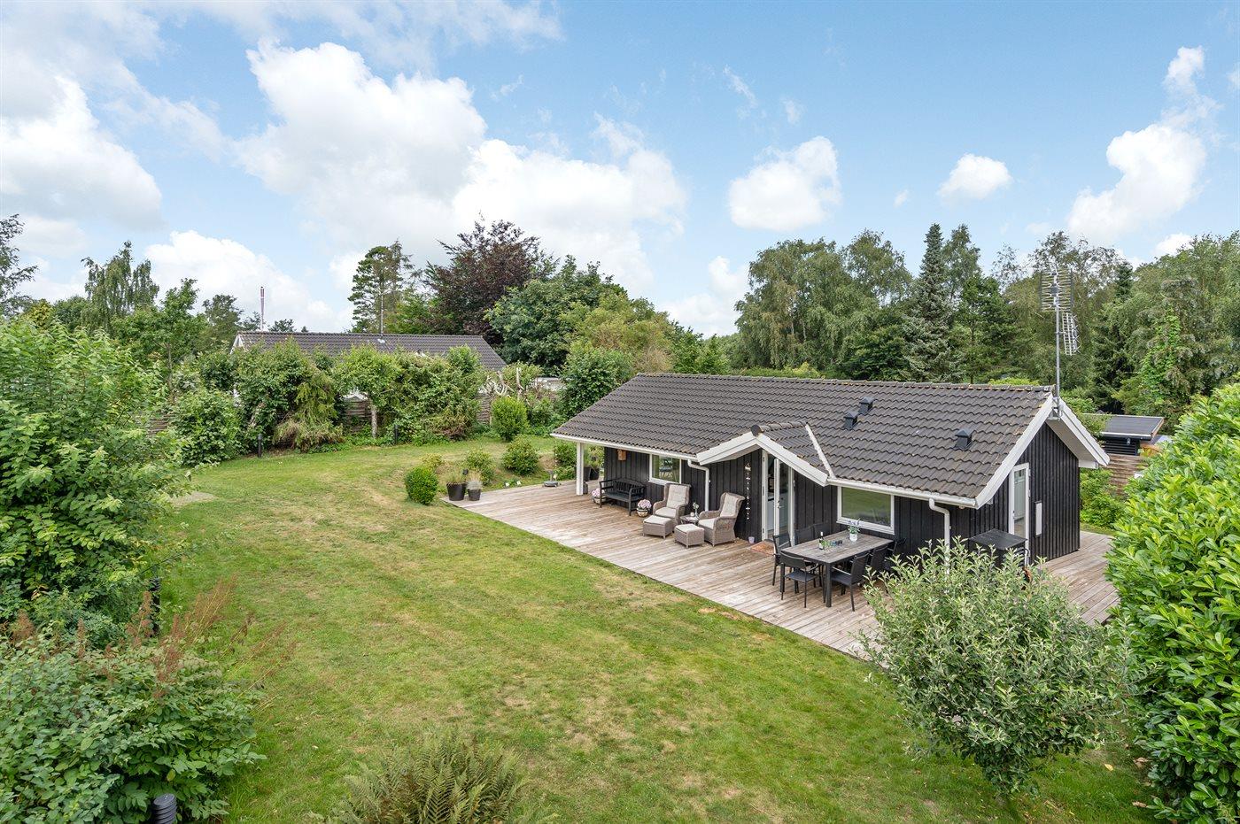 Lyst og moderne sommerhus i Hornbæk nær stranden og golfbaner, med stor have og elbilopladning.