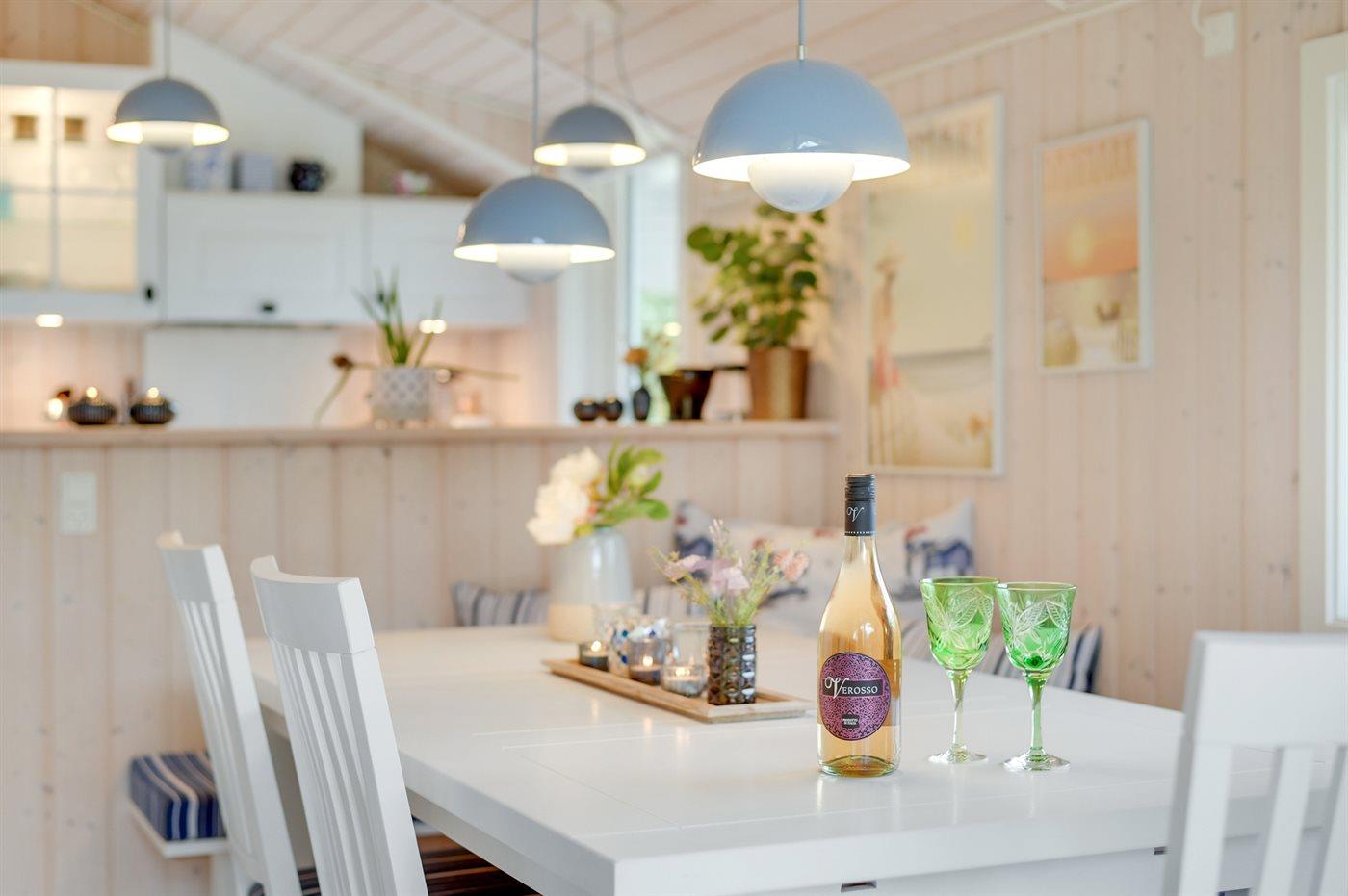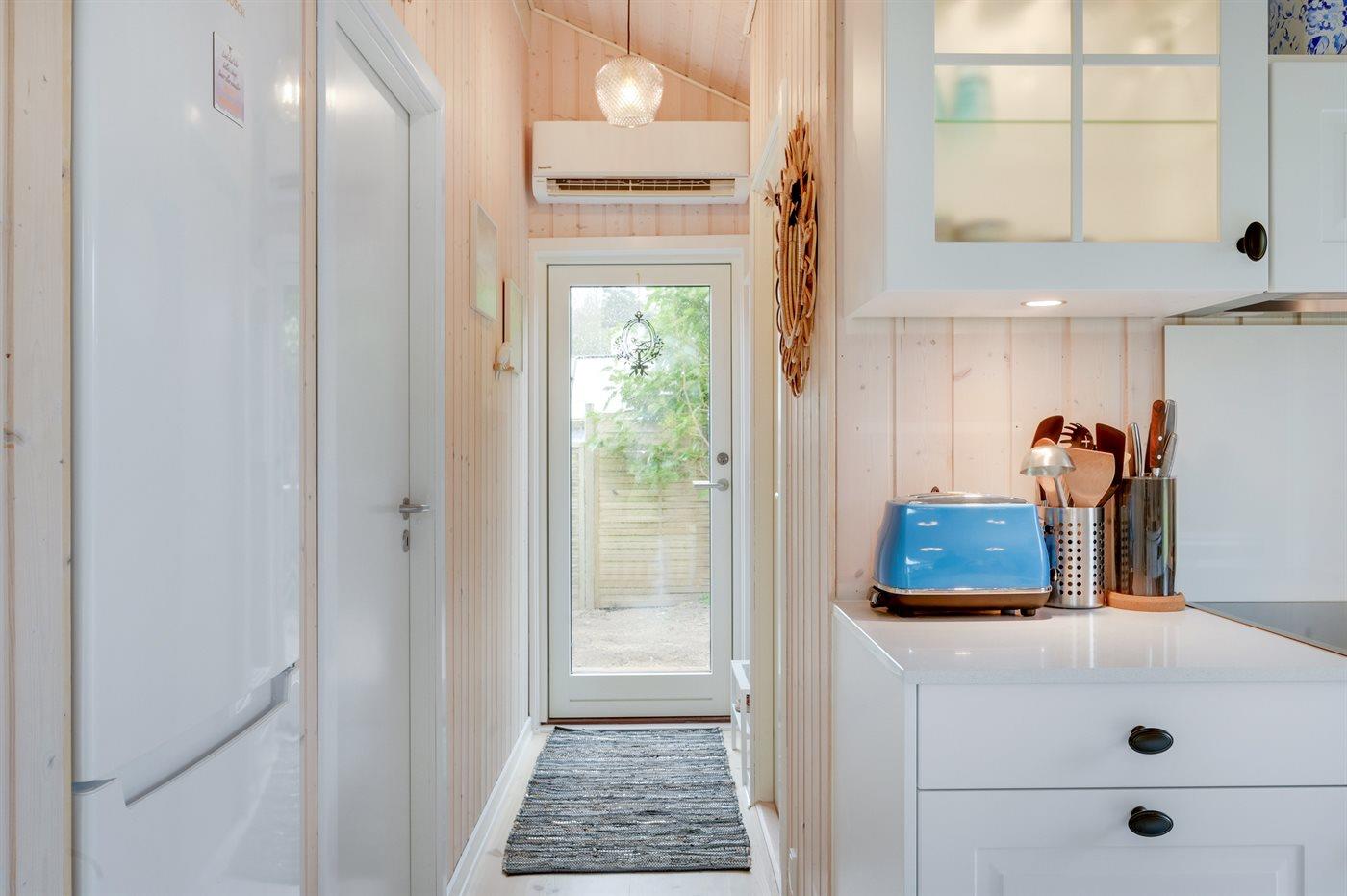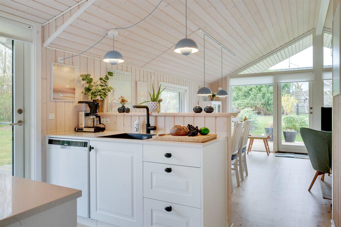 Køkkenet er udstyret med 1 køleskab. Der er 4 keramiske kogeplader, varmluftovn samt opvaskemaskine.