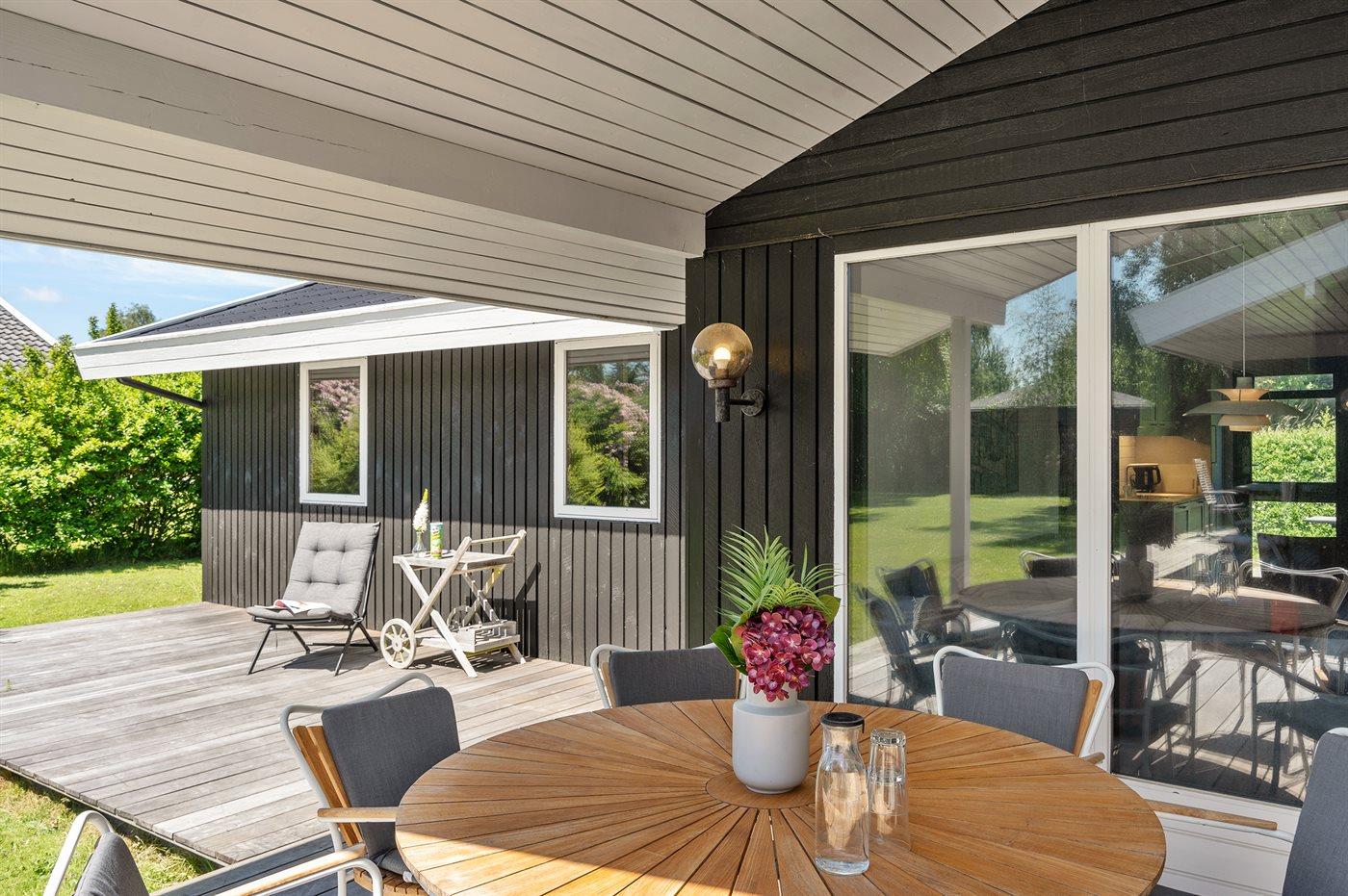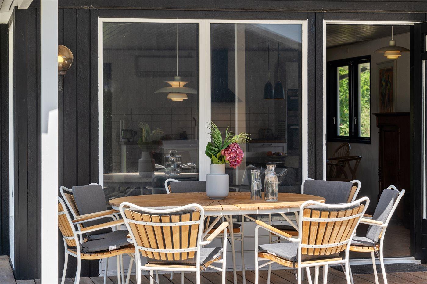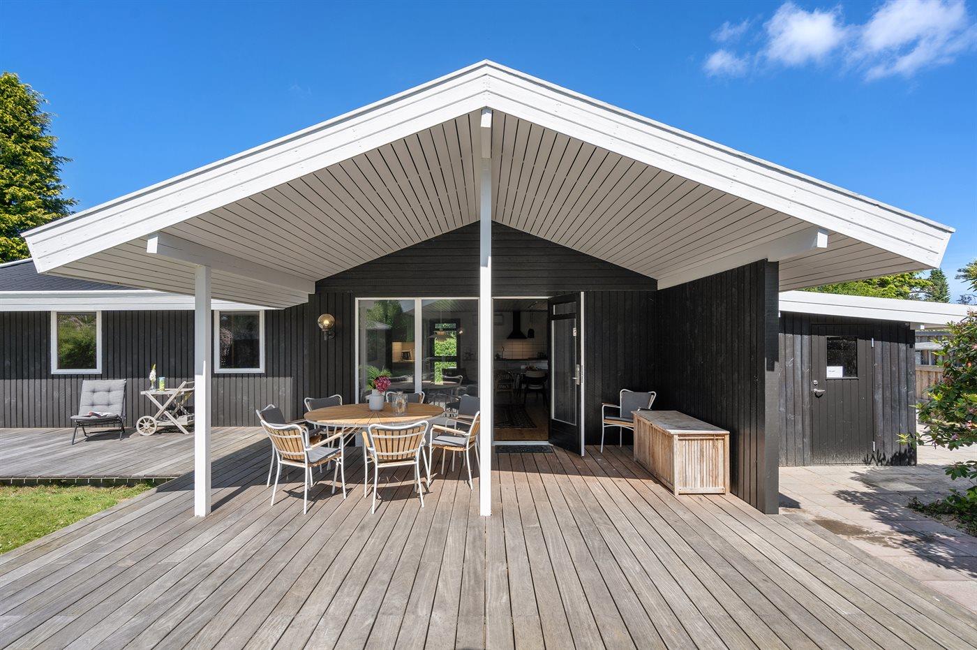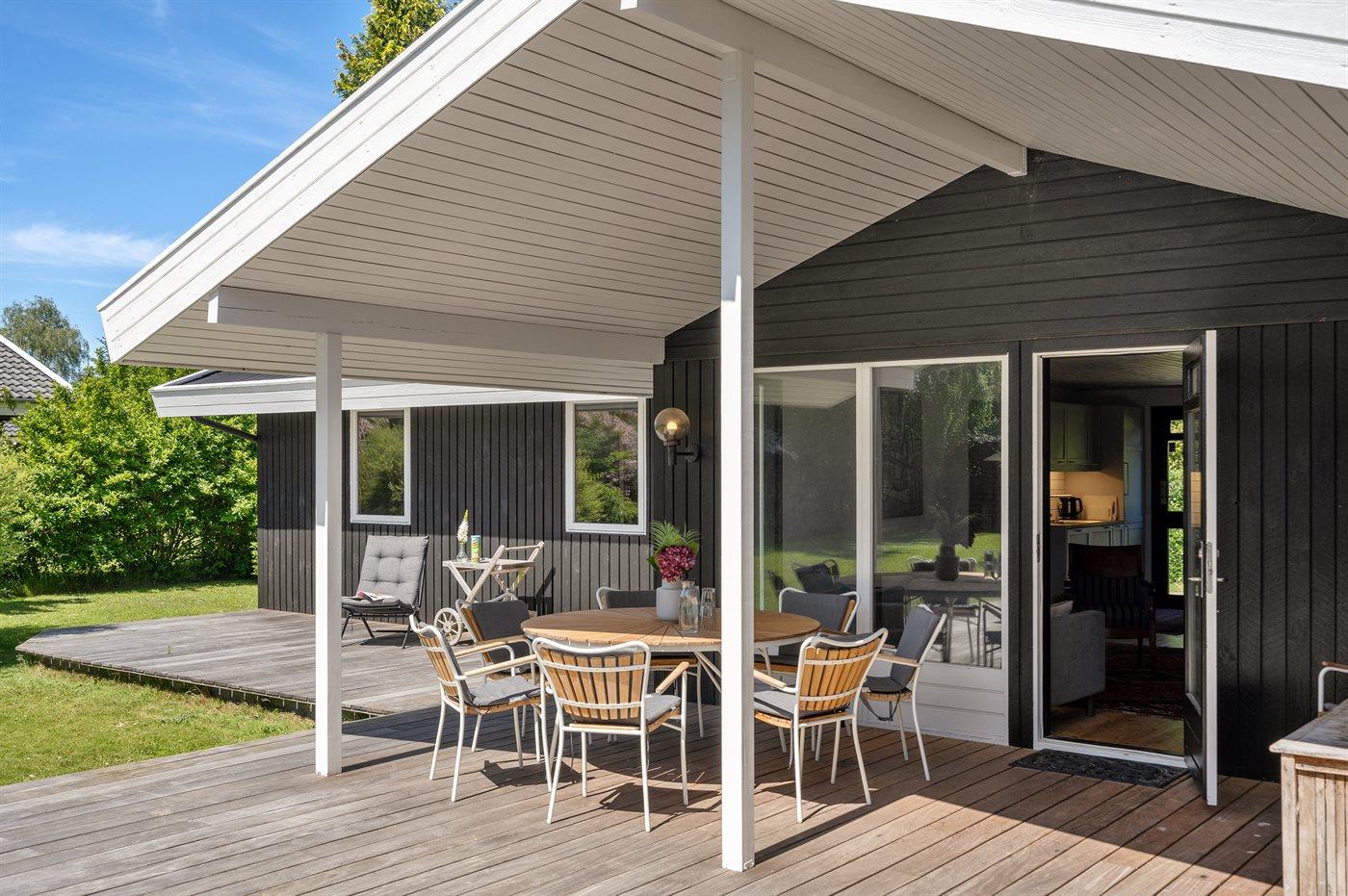 Udendørs er der store træterrasser, hvoraf en del er overdækket, så sommeren og solen kan nydes i ro og fred.
