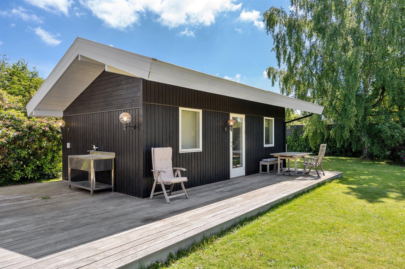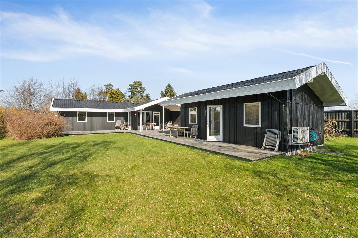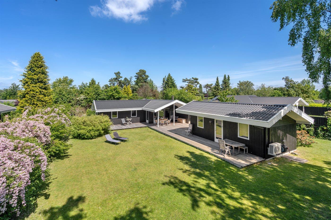 Udendørs er der store træterrasser, hvoraf en del er overdækket, så sommeren og solen kan nydes i ro og fred.