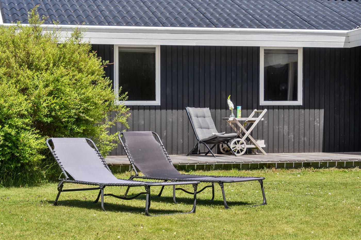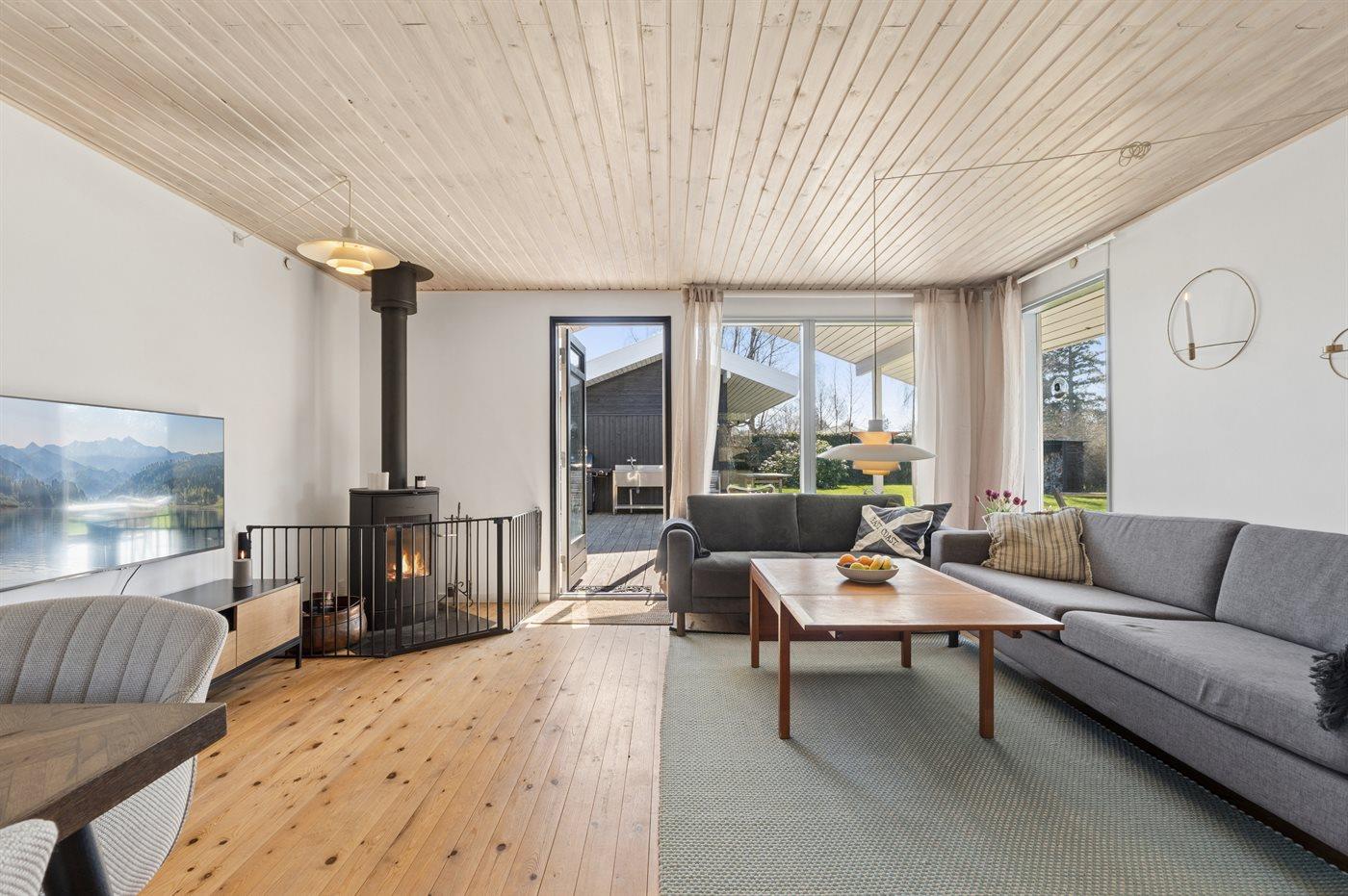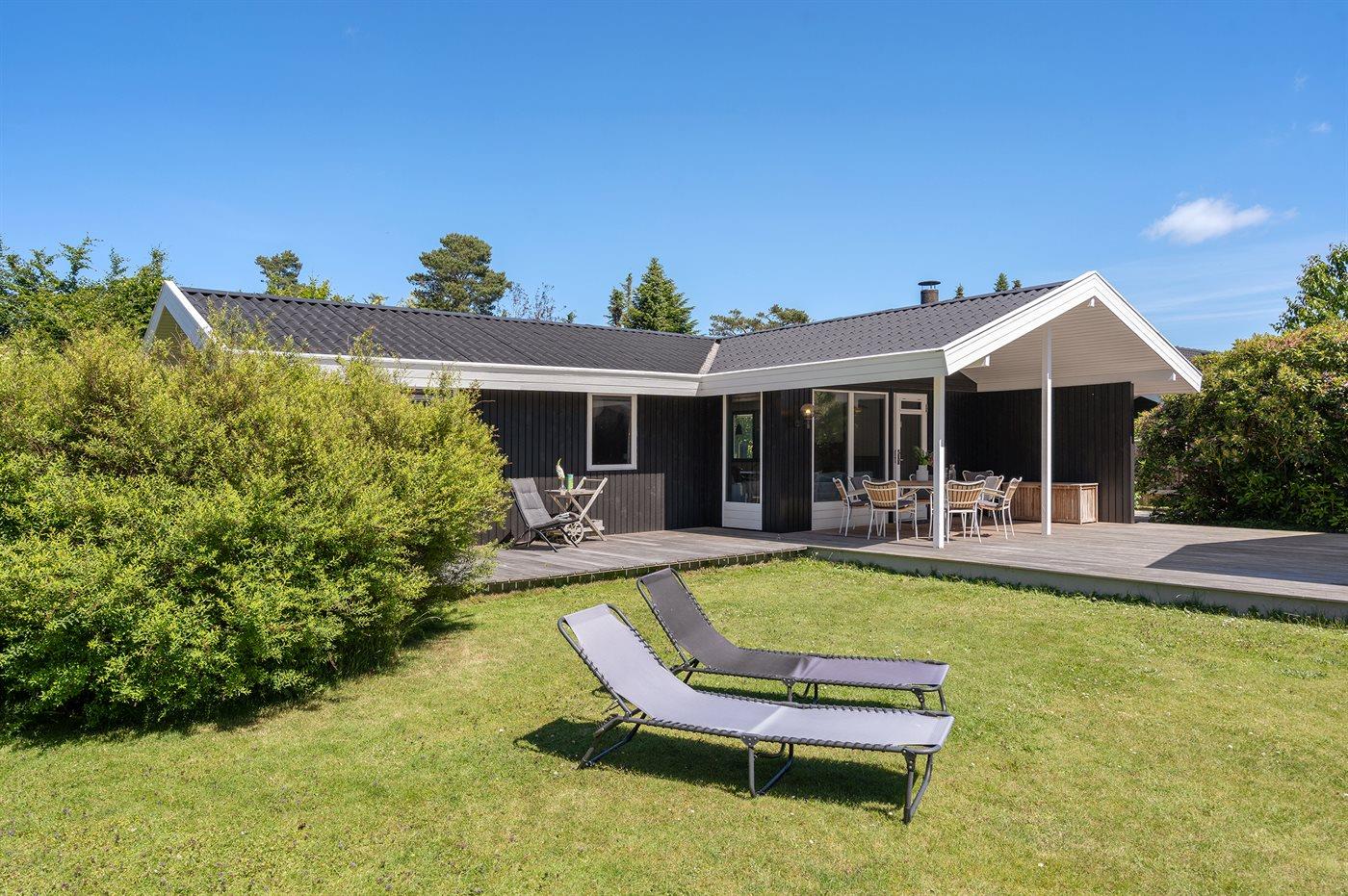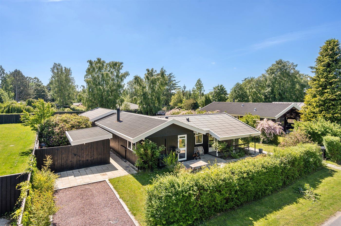 Udendørs er der store træterrasser, hvoraf en del er overdækket, så sommeren og solen kan nydes i ro og fred.