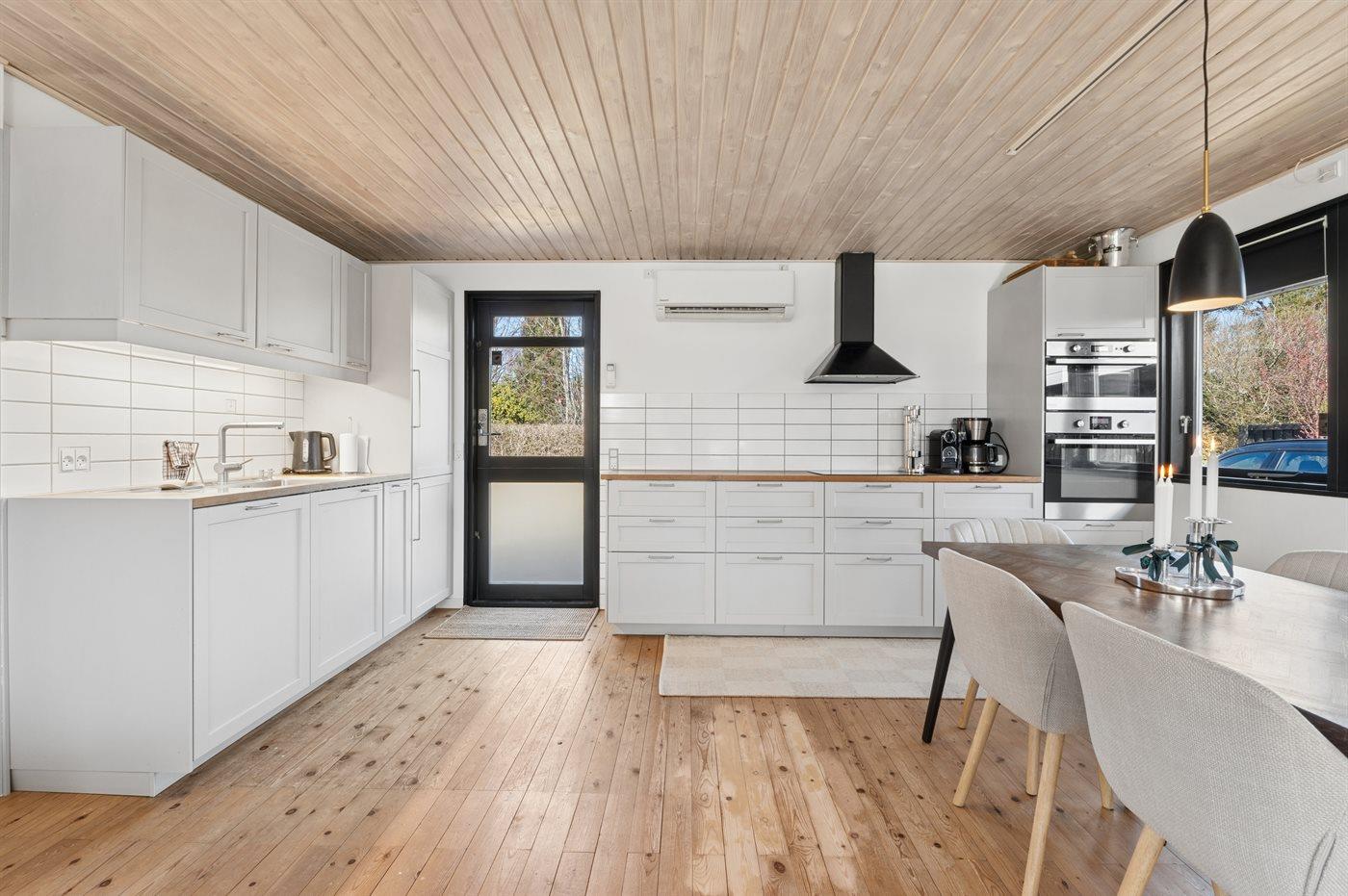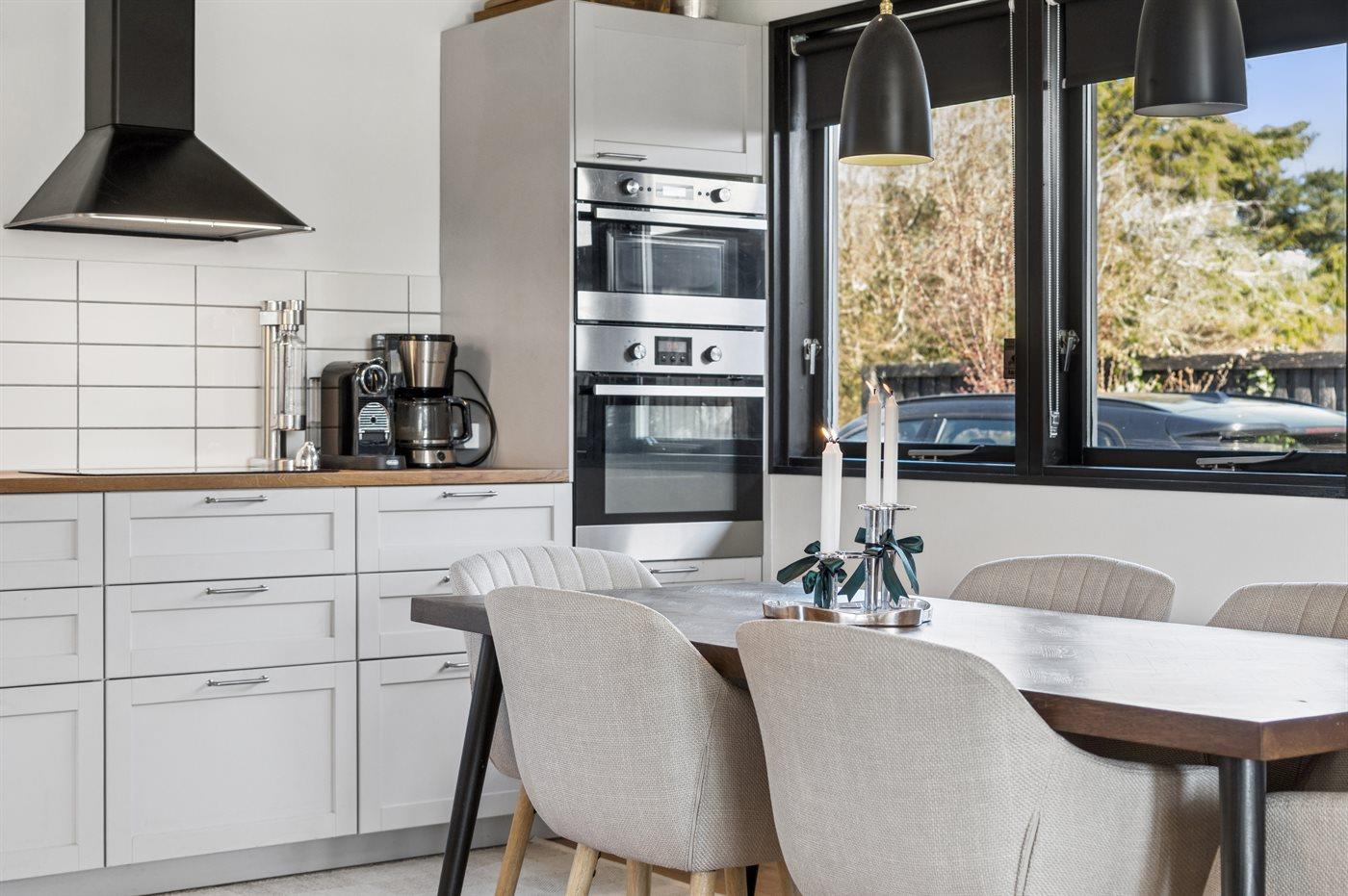 Køkkenet er udstyret med 1 køleskab. Der er 4 induktionskogeplader, varmluftovn, mikrobølgeovn samt opvaskemaskine.