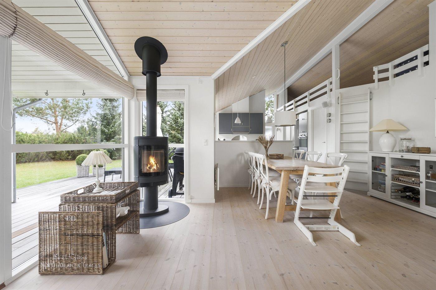 Køkken-alrum med plads til madlavning og hygge i stuen med brændeovn til de kølige dage. Fra stuen er der er direkte udgang til terrassen – hvor en del er overdækket, og man kan følge solen rundt på terrassen og nyde den dejlige have. Feriehuset indeholder 3 værelser og et badeværelse.