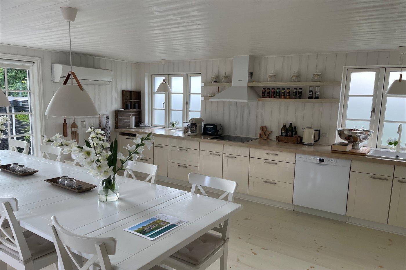 Køkkenet er udstyret med 1 køleskab. Der er 4 induktionskogeplader, varmluftovn, mikrobølgeovn samt opvaskemaskine.