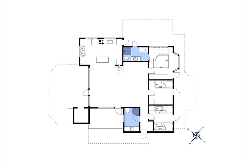 Når du træder ind i sommerhuset, mødes du af et lyst og åbent køkken, der er fuldt udstyret med alt, hvad du behøver for at tilberede lækre måltider. Køkkenet er i åben forbindelse med opholdsstuen, hvor komfortable siddepladser foran brændeovnen indbyder til hyggelige aftener med brætspil efter en dag på stranden. Huset rummer tre soveværelser, der sikrer gode sovepladser til hele familien, samt to badeværelser, hvilket giver ekstra komfort under opholdet.