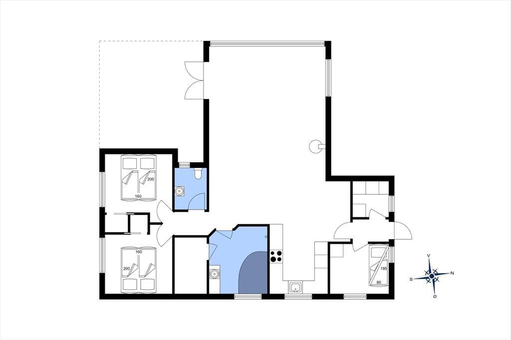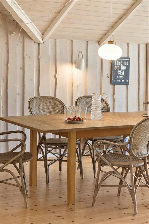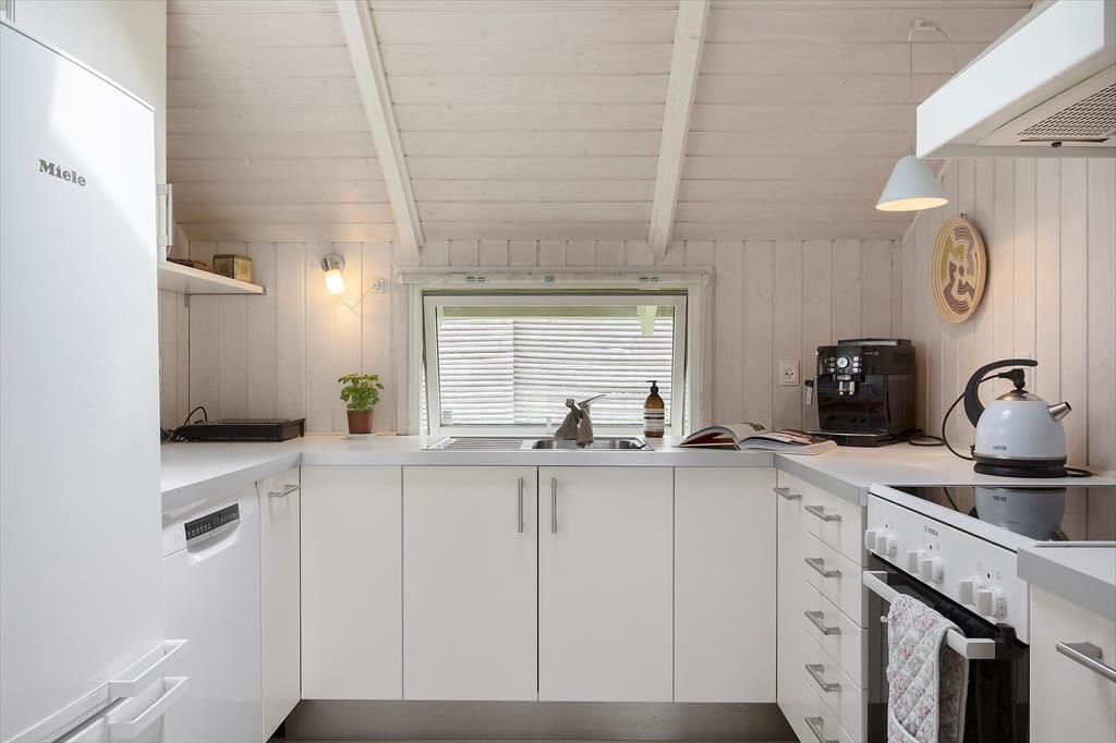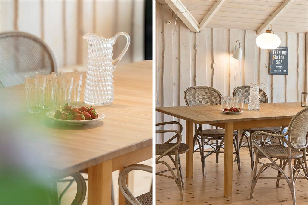 Når du træder ind i sommerhuset, mødes du af en lys og venlig atmosfære, hvor store vinduespartier inviterer naturen helt tæt på. I den rummelige opholdsstue kan du samle familien til hyggelige stunder – uanset om det er over en god middag, en brætspilsaften eller blot til afslapning foran brændeovnen, mens flammerne knitrer og spreder varme. Køkkenet ligger i åben forbindelse med stuen, så det er nemt at være sammen, også når måltiderne tilberedes. Husets soveværelser giver jer hver især mulighed for at finde ro, når dagen går på hæld, og i badeværelset er der god plads til hverdagens rutiner og et bad efter en tur på stranden.