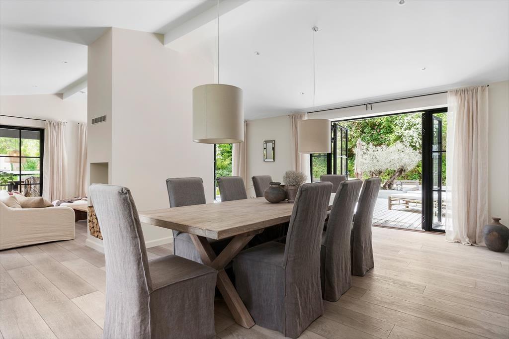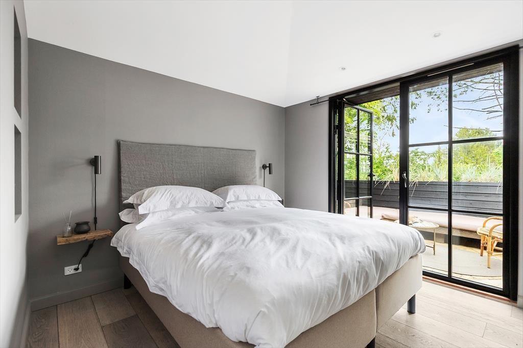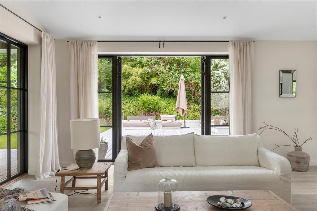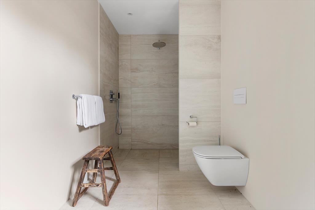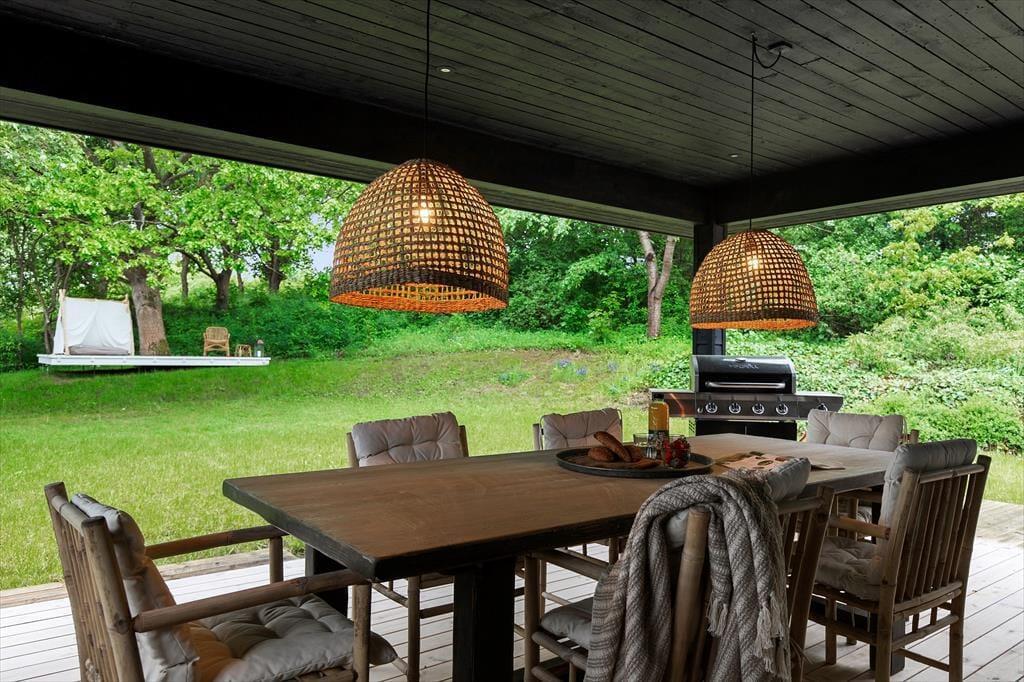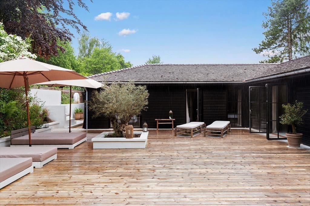 Udenfor folder huset sig ud omkring en stor og smukt anlagt terrasse, der er opdelt i stemningsfulde zoner. Den overdækkede spisezone har et langbord, der indbyder til lange middage i det fri – uanset vejret. På den store solterrasse finder du komfortable loungemøbler, hvor du kan nyde solen hele dagen, og længere tilbage i haven ligger en spansk-inspireret, niveaudelt afslapningszone. Her finder du også den elegante udendørs bruser – perfekt til en opfriskende skyller efter stranden.