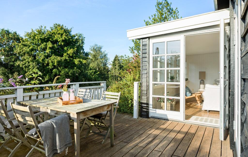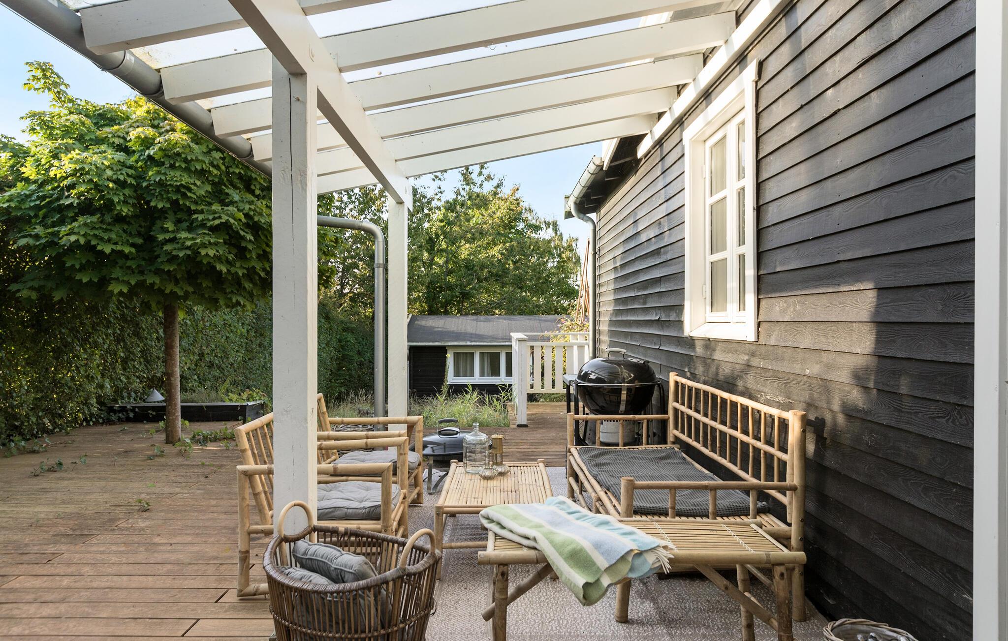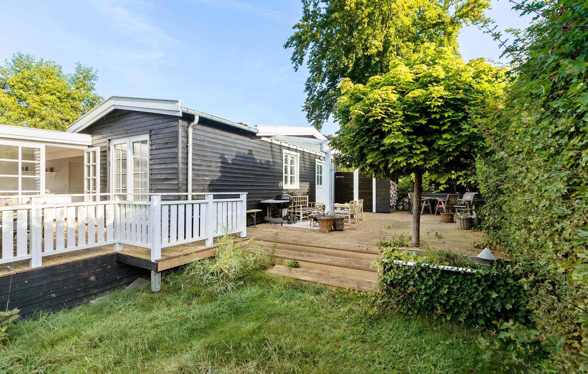 Charmerende træhus nær Hornbæks strand med anneks, flere terrasser og moderne faciliteter for en afslappende familieferie.