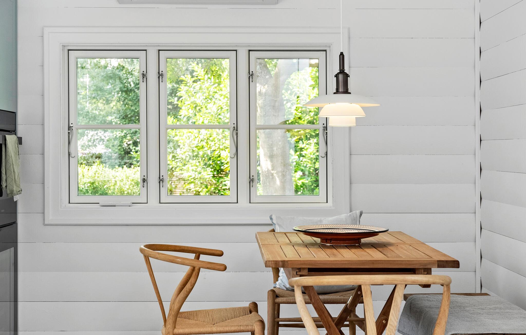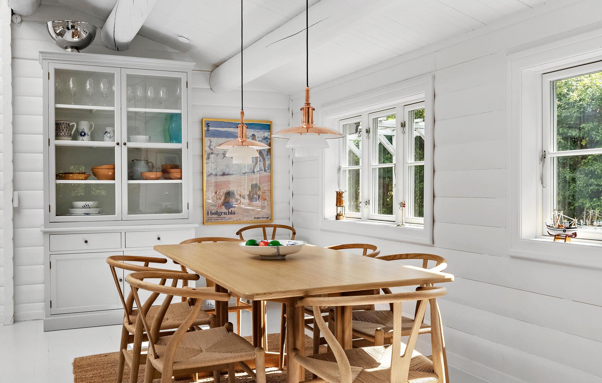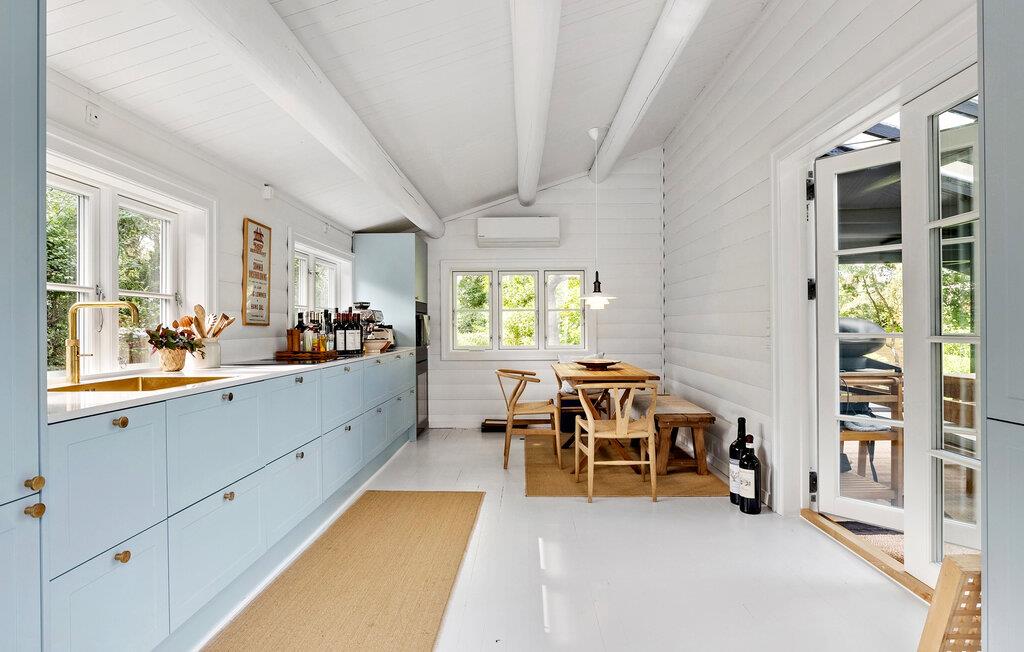 Dette komfortable feriehus kan prale af en åben og smagfuld opholdsstue, masser af naturligt dagslys og en smuk udsigt over de omkringliggende grønne områder. Skab kulinariske lækkerier og brug den hyggelige spiseplads til harmoniske måltider og sjove spilleaftener. Efter en lang dag i den friske havluft kan I samles i den behagelige sofa og streame en film, mens brændeovnen bader rummet i varmt lys.