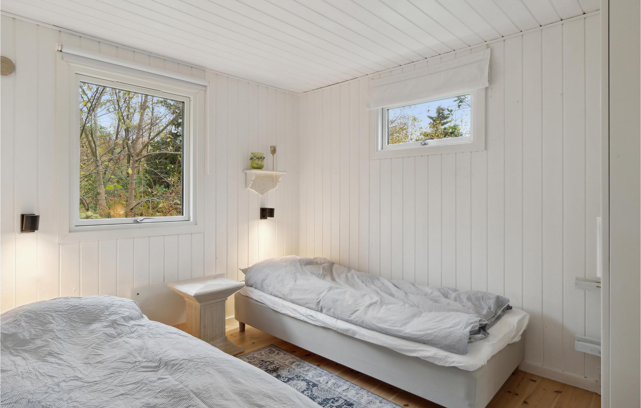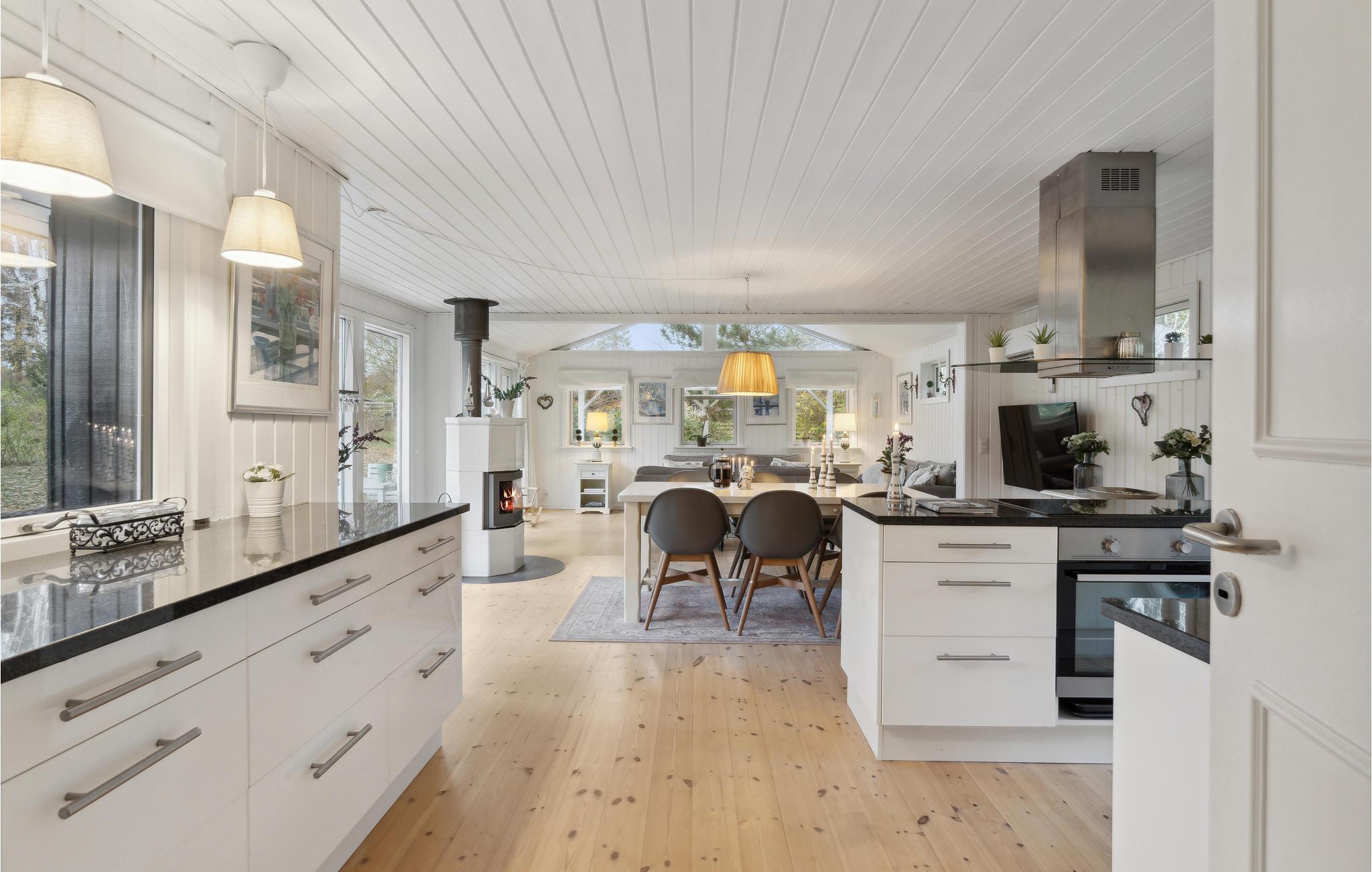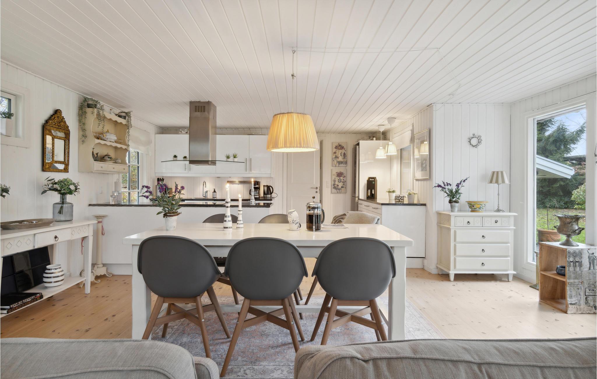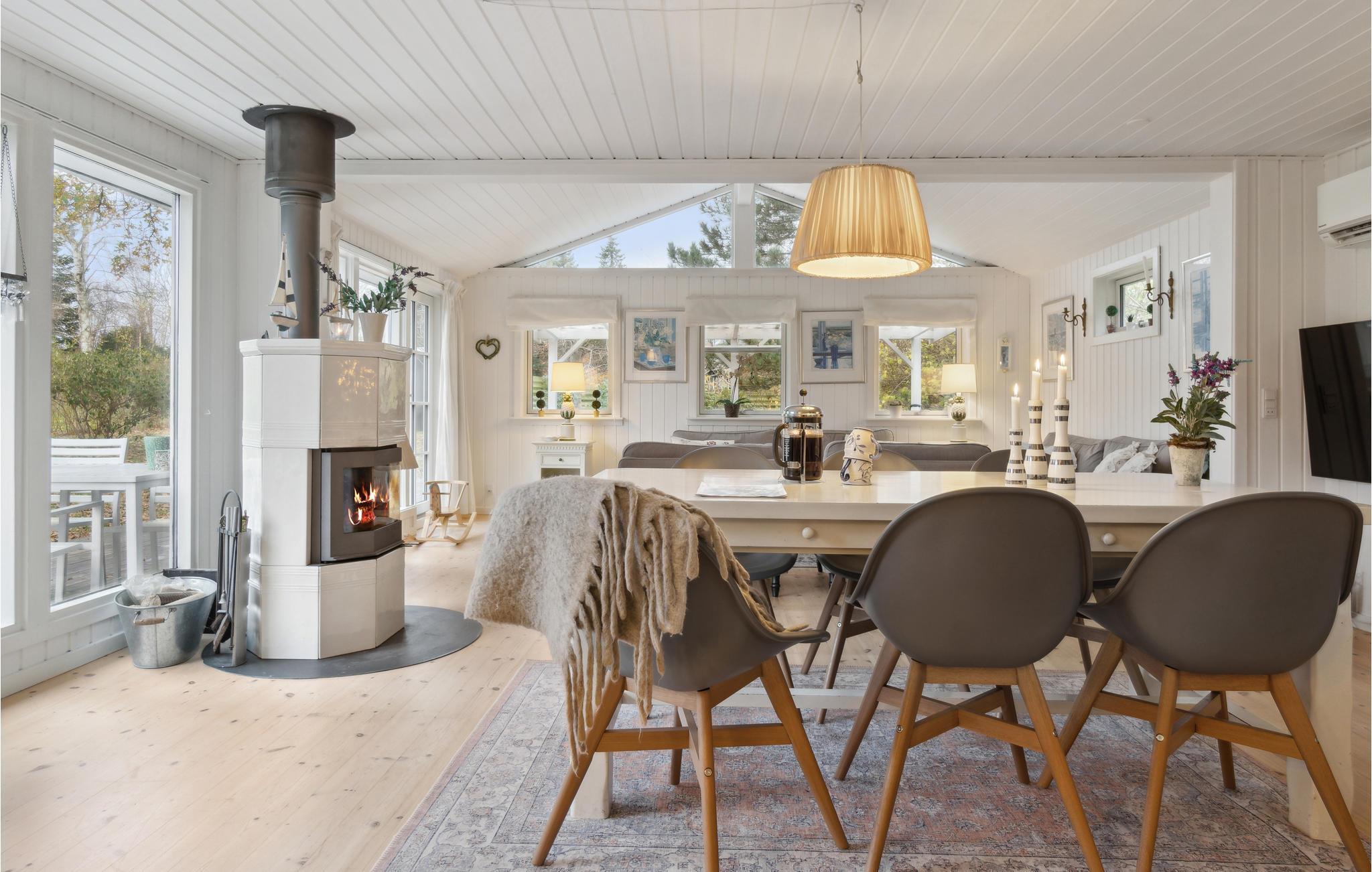 Tag en pause fra bylivet og tag til kunstnerkolonien Hornbæk, hvor dette feriehus venter på jer. Så snart I træder ind, vil I, takket være de mange vinduer og den lyse indretning, opleve en særlig atmosfære i de kærligt indrettede rum, som afspejler det maleriske lys ved havet. Det store opholdsrum, som forbinder køkkenet med spisepladsen og stuen, er rummelig og meget indbydende. Læn jer tilbage i sofaerne og lænestolene, mens ilden flammer i brændeovnen. Herfra kan I også gå ud på den store træterrasse, der flere steder er delvist overdækket, og som indbyder til at grille sammen om aftenen eller solbade i løbet af dagen.