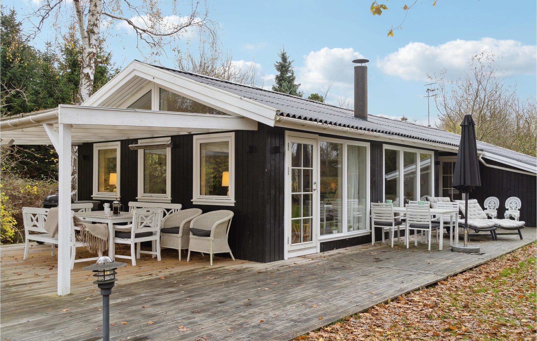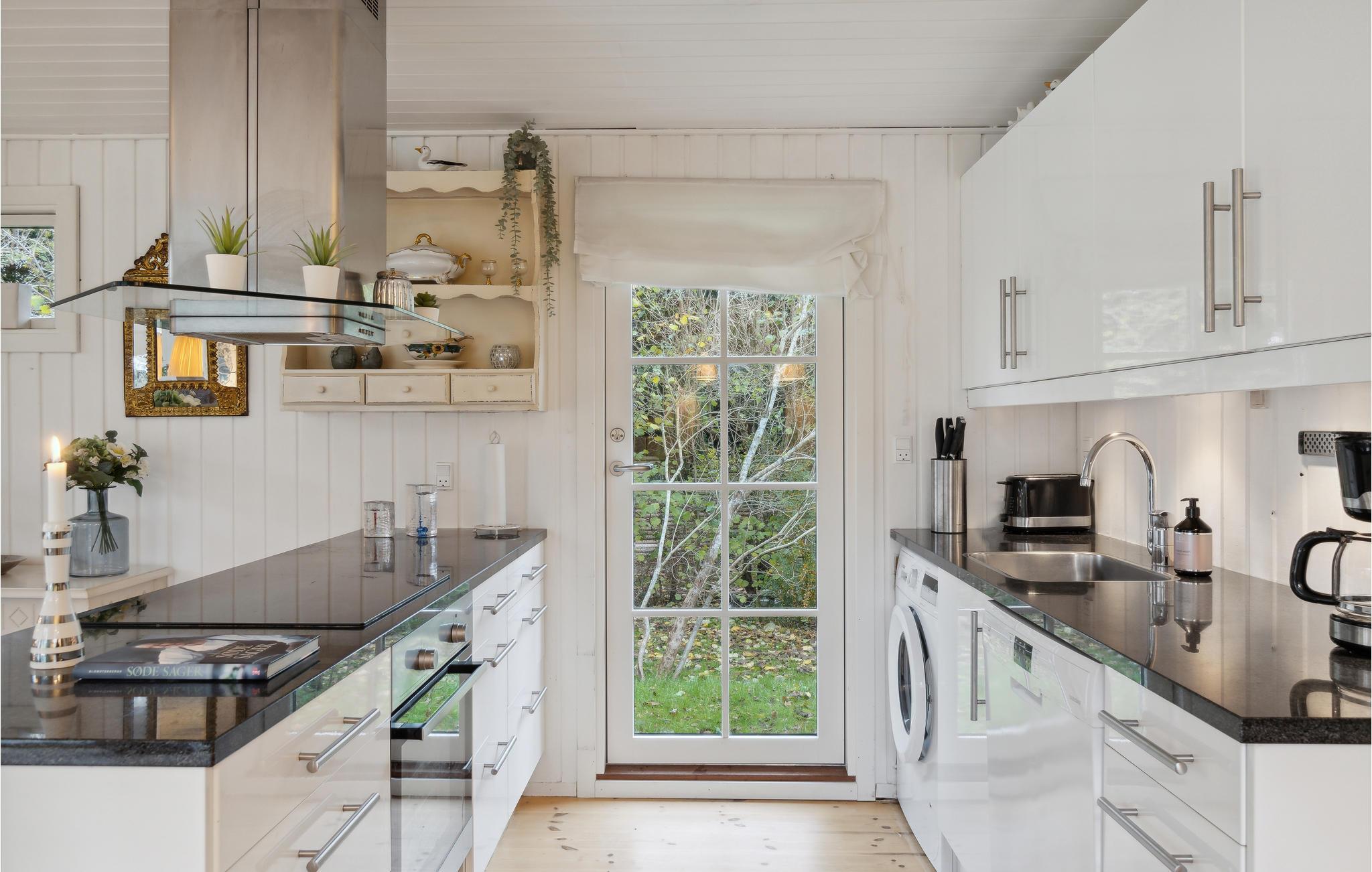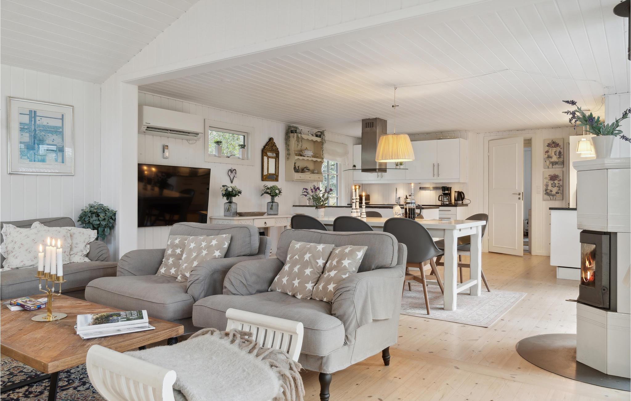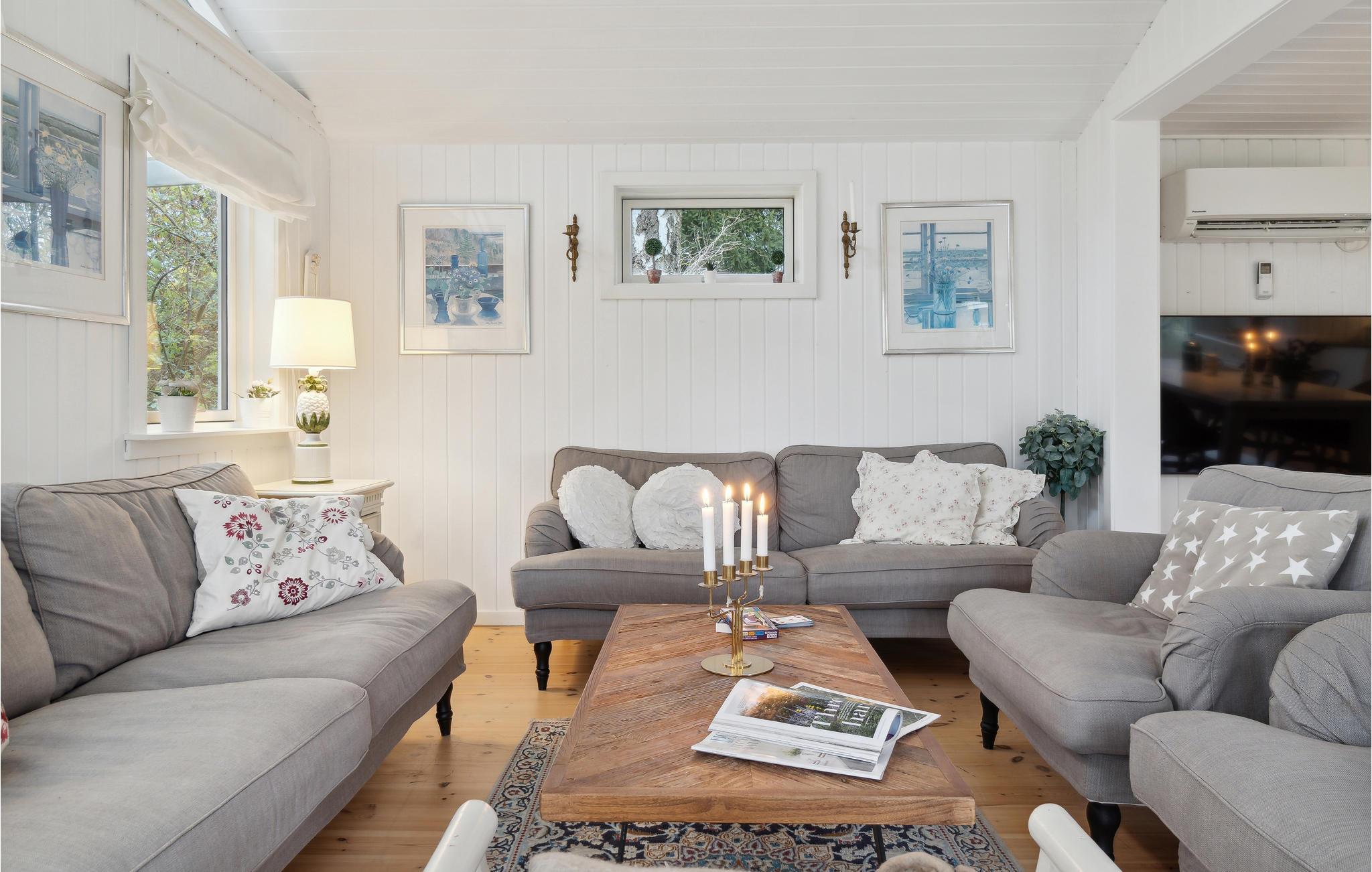 Tag en pause fra bylivet og tag til kunstnerkolonien Hornbæk, hvor dette feriehus venter på jer. Så snart I træder ind, vil I, takket være de mange vinduer og den lyse indretning, opleve en særlig atmosfære i de kærligt indrettede rum, som afspejler det maleriske lys ved havet. Det store opholdsrum, som forbinder køkkenet med spisepladsen og stuen, er rummelig og meget indbydende. Læn jer tilbage i sofaerne og lænestolene, mens ilden flammer i brændeovnen. Herfra kan I også gå ud på den store træterrasse, der flere steder er delvist overdækket, og som indbyder til at grille sammen om aftenen eller solbade i løbet af dagen.