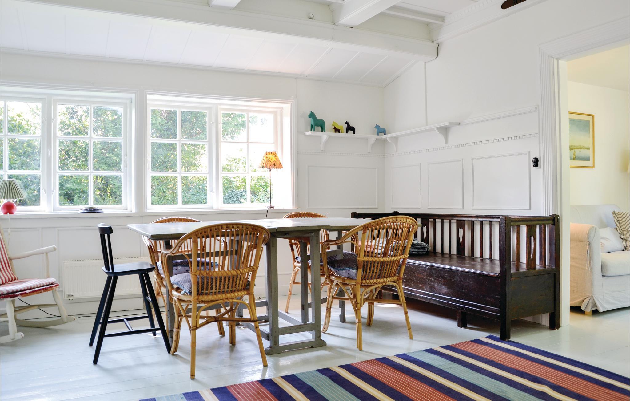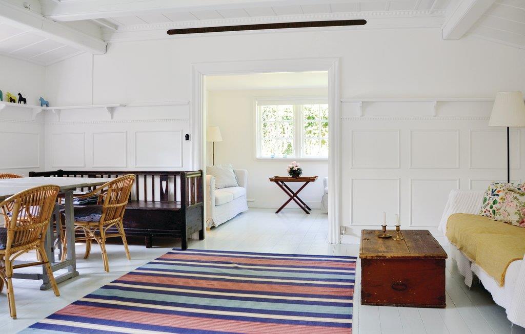 Sommerhusidyl med charmerende indretning og stråtag mindre end to minutters gang fra havet, hvor solen og stranden kan nydes i fulde drag. I opholdsstuen er der spiseplads til hele familien og udgang til en hyggelig, lys verandastue, hvor bogen eller striktøjet kan nydes i et godt lys. Dejligt, rummeligt køkken hvor feriemåltiderne kan tilberedes. På første sal er der to gode og hyggelige soveværelser, hvoraf det ene har indbyggede alkovesenge. På første sal findes ligeledes et badeværelse. Endvidere er der endnu et badeværelse, der har adgang fra haven, og som kan benyttes af dem, som overnatter i det tilhørende anneks til to personer. I huset findes en varmepumpe, som supplerende varmekilde. Vinduerne i huset er enkeltlagsvinduer.