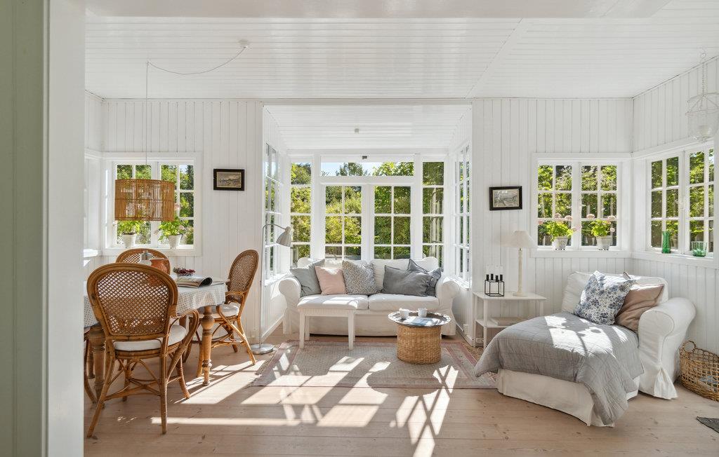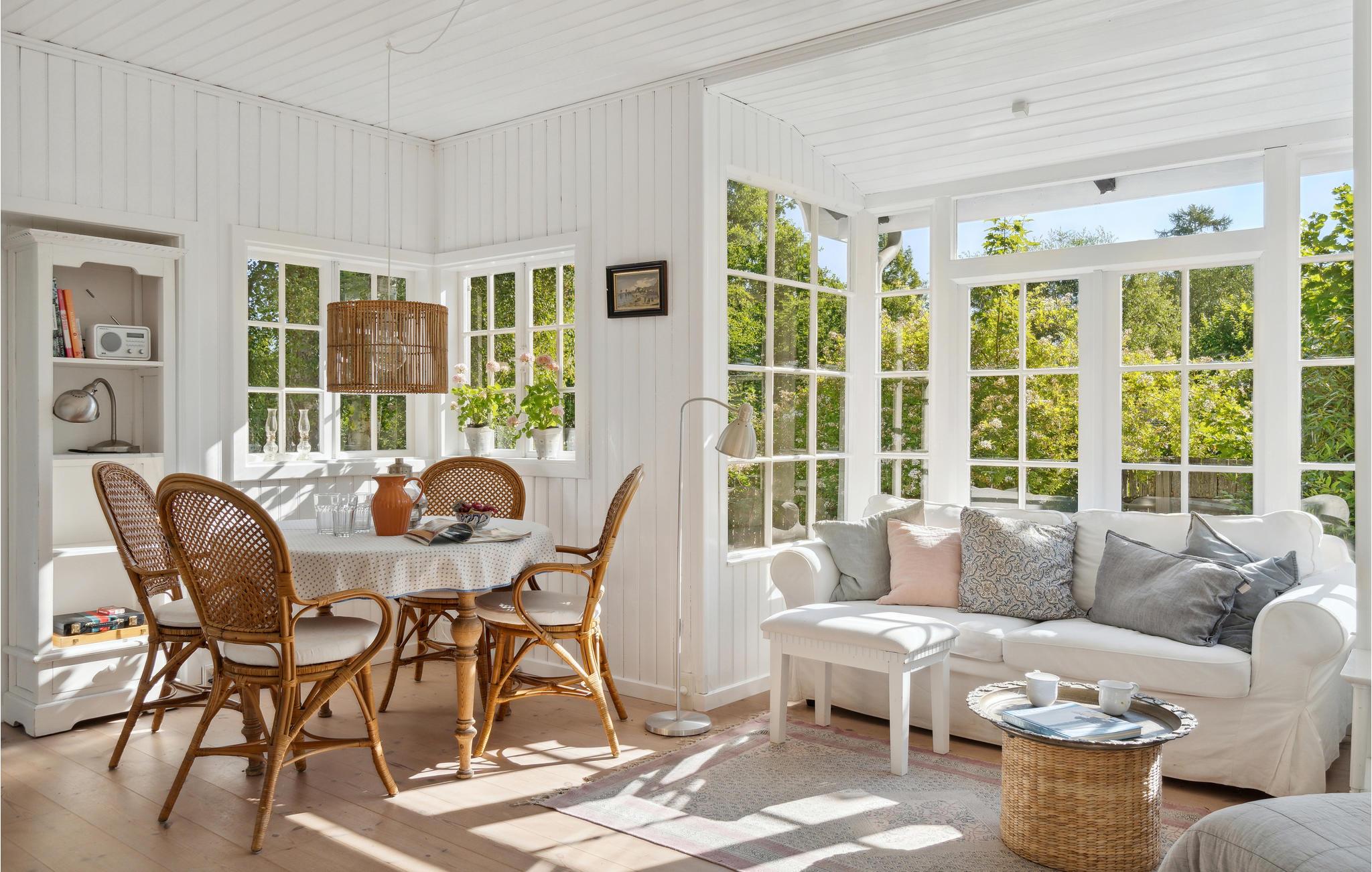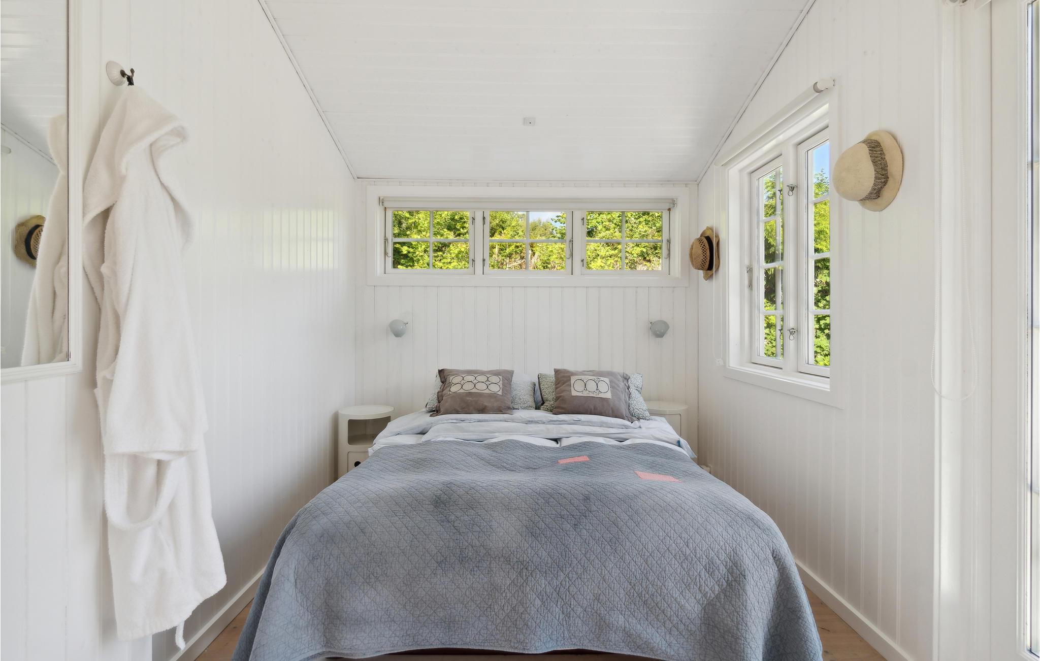 I populære Hornbæk finder I dette feriehus, som indbyder jer til en dejlig ferie i grønne omgivelser. Indenfor er huset en drøm af hvid med enkelte elementer, der bryder farven og skaber et harmonisk modspil og en stemning af velvære. De mange og store sprossevinduer lader dagslyset strømme ind. Sæt jer godt til rette ved morgenmadsbordet og nyd, at I ikke skal haste af sted på arbejde. Tilbring afslappende eftermiddage i sofaen med en god bog, mens I indimellem lader blikket vandre over de grønne omgivelser. I den kølige årstid spreder brændeovnen en hyggelig varme. Når vejret er godt, kan I finde en hyggekrog på terrassen til en kop kaffe eller et slag backgammon. Efter en kort gåtur kommer I til den dejlige sandstrand, hvor I kan springe ud i Kattegats bølger og lege i sandet med jeres børn.