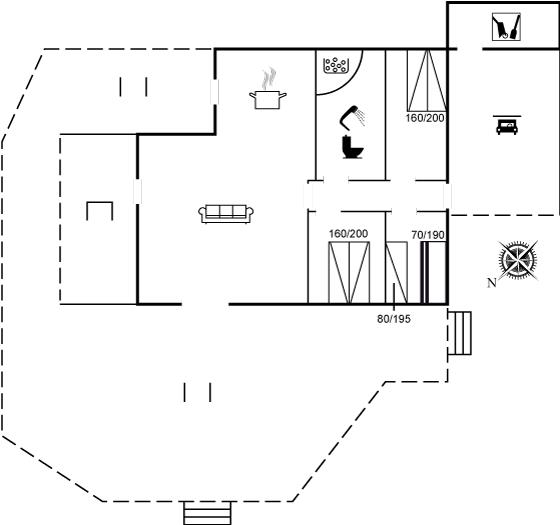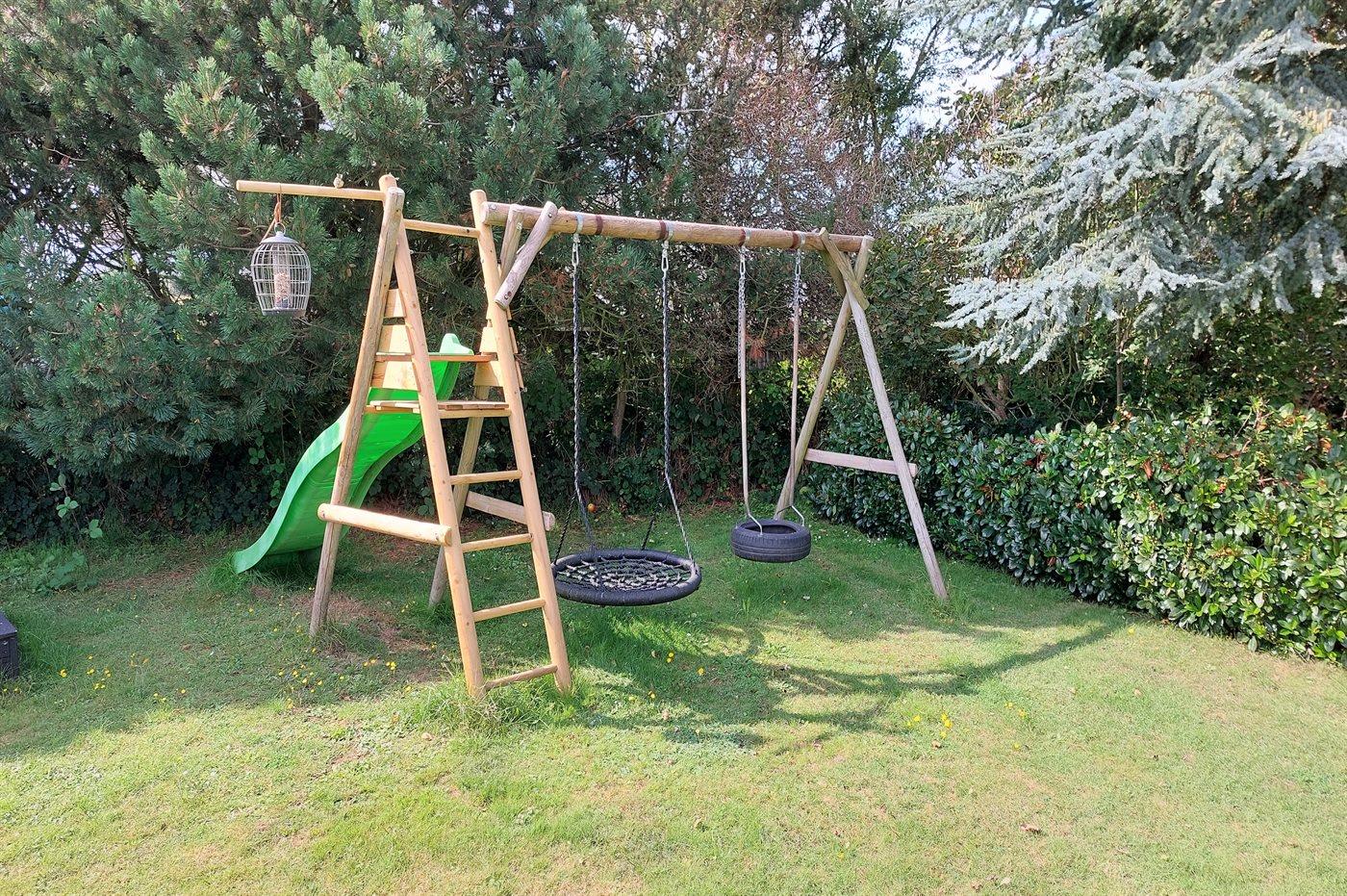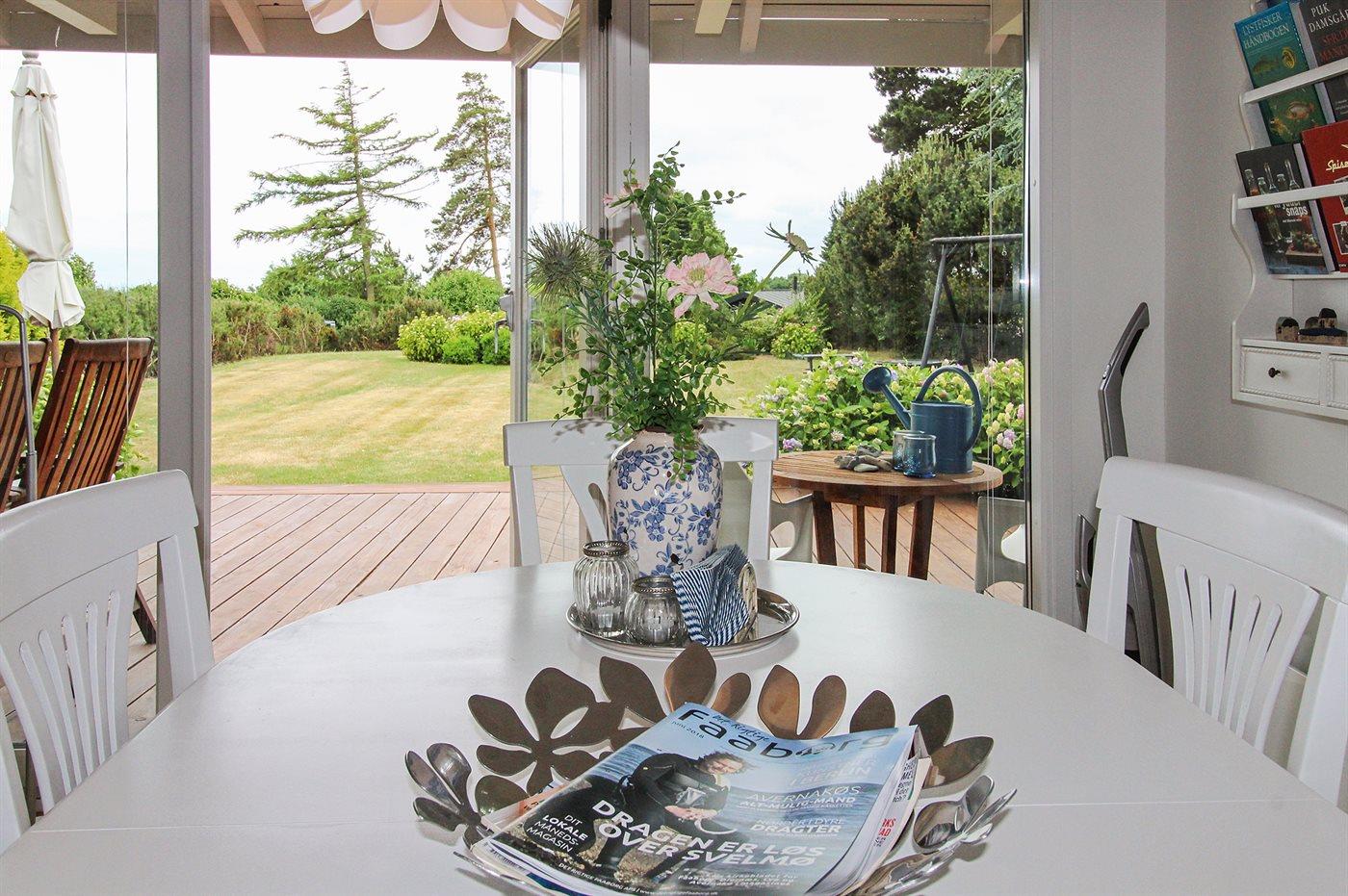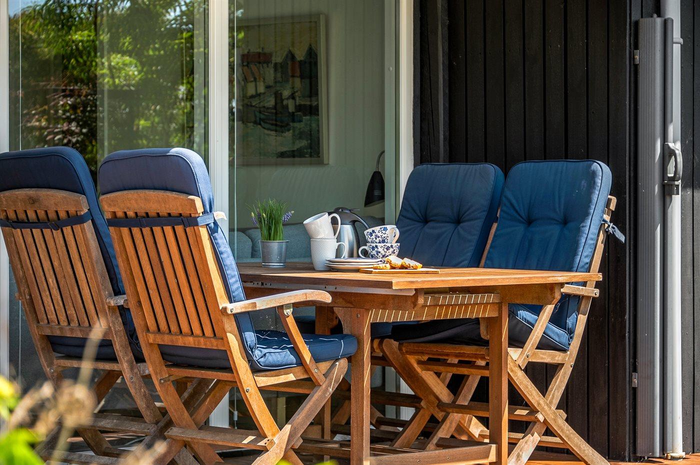 Ferieboligen er beliggende på en 1120 m² stor havegrund. Der er 150 m til havet. Nærmeste forretning er beliggende i en afstand af 2000 m. Til ferieboligen hører åbent terrasseareal. Desuden er der overdækket terrasse. Gynge. Rutchebane. Bålsted. Udendørs bruser. Grill til rådighed. Udendørs bord med vask til f.eks. rengøring af fisk. Parkering ved ferieboligen.