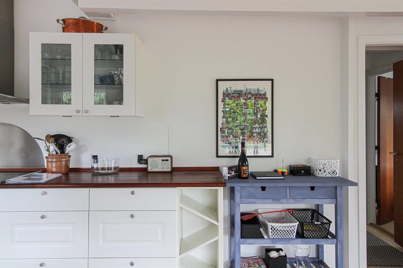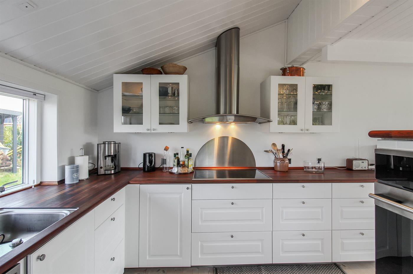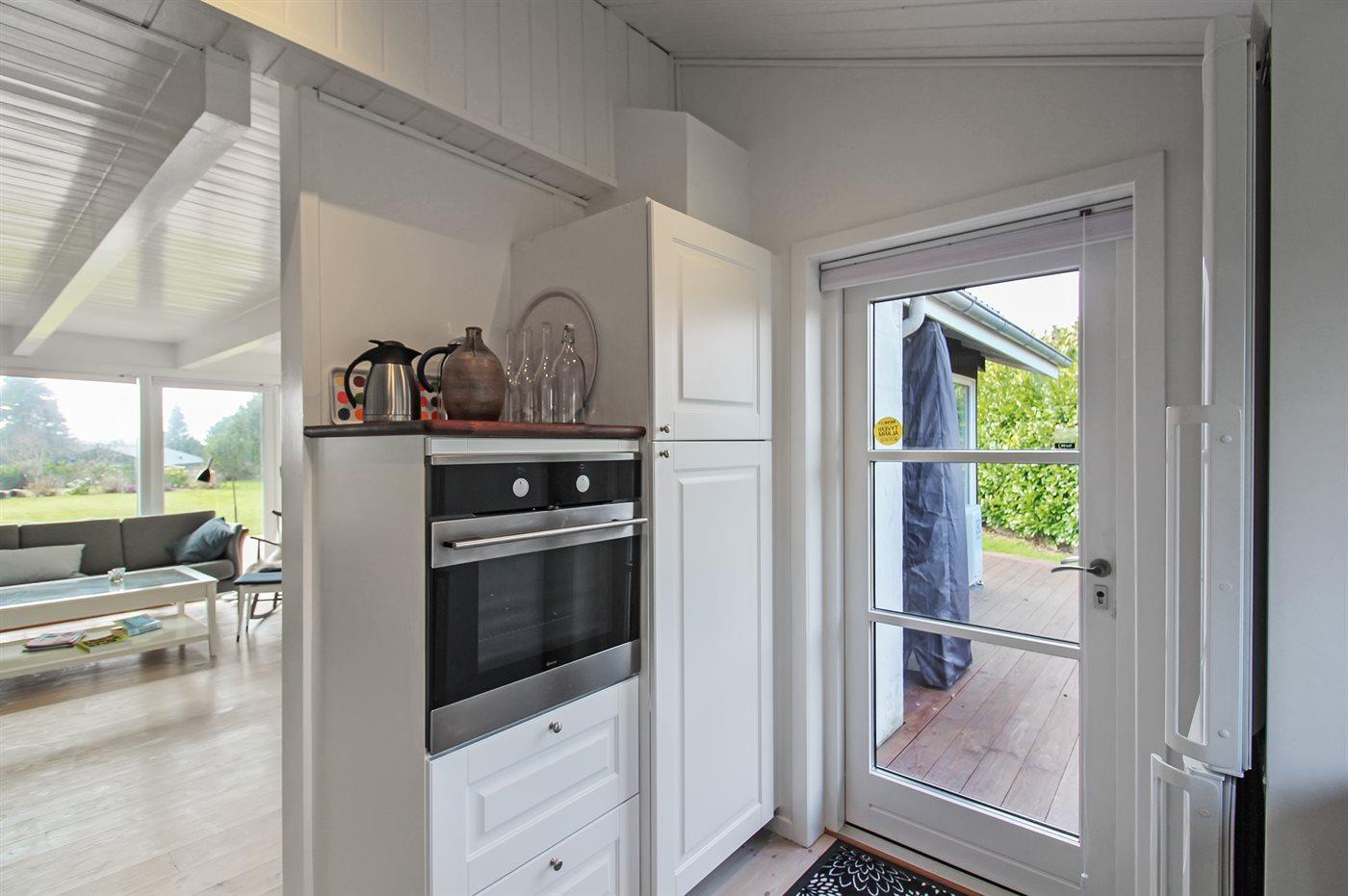 Køkkenet er udstyret med 1 køleskab. Der er 4 induktionskogeplader, varmluftovn samt opvaskemaskine.