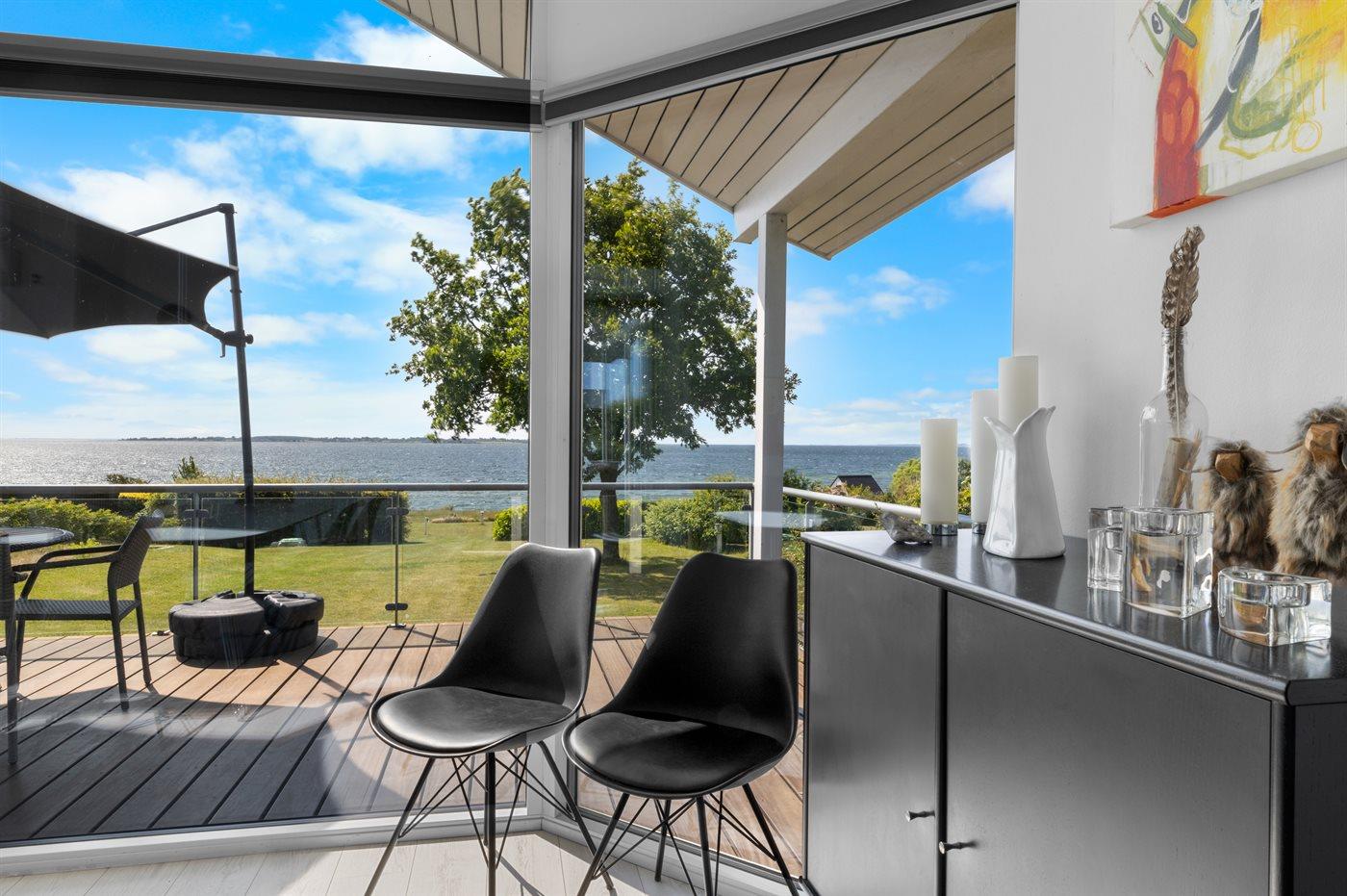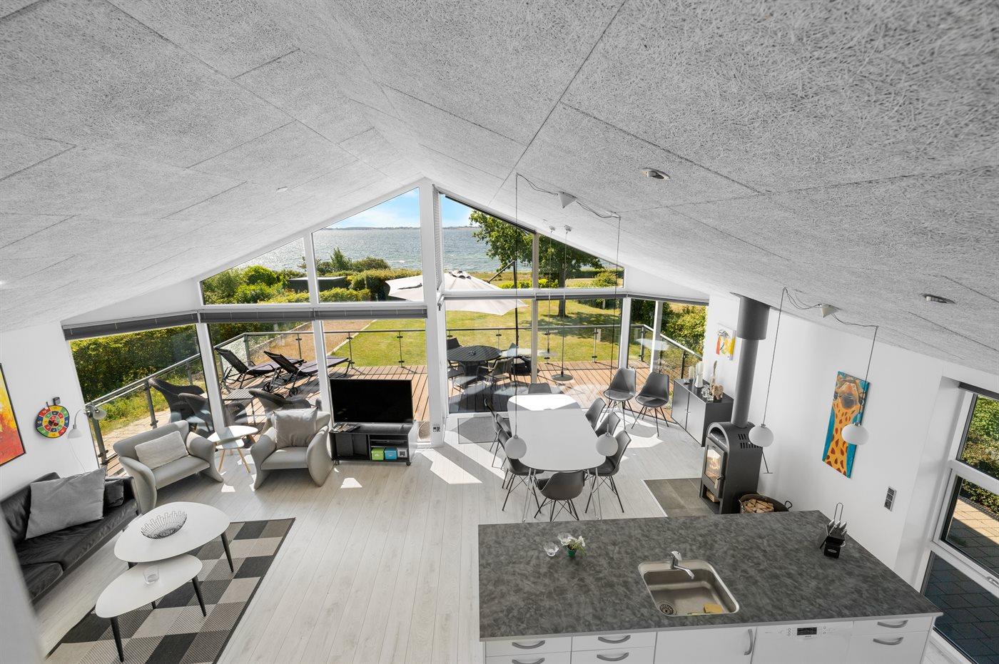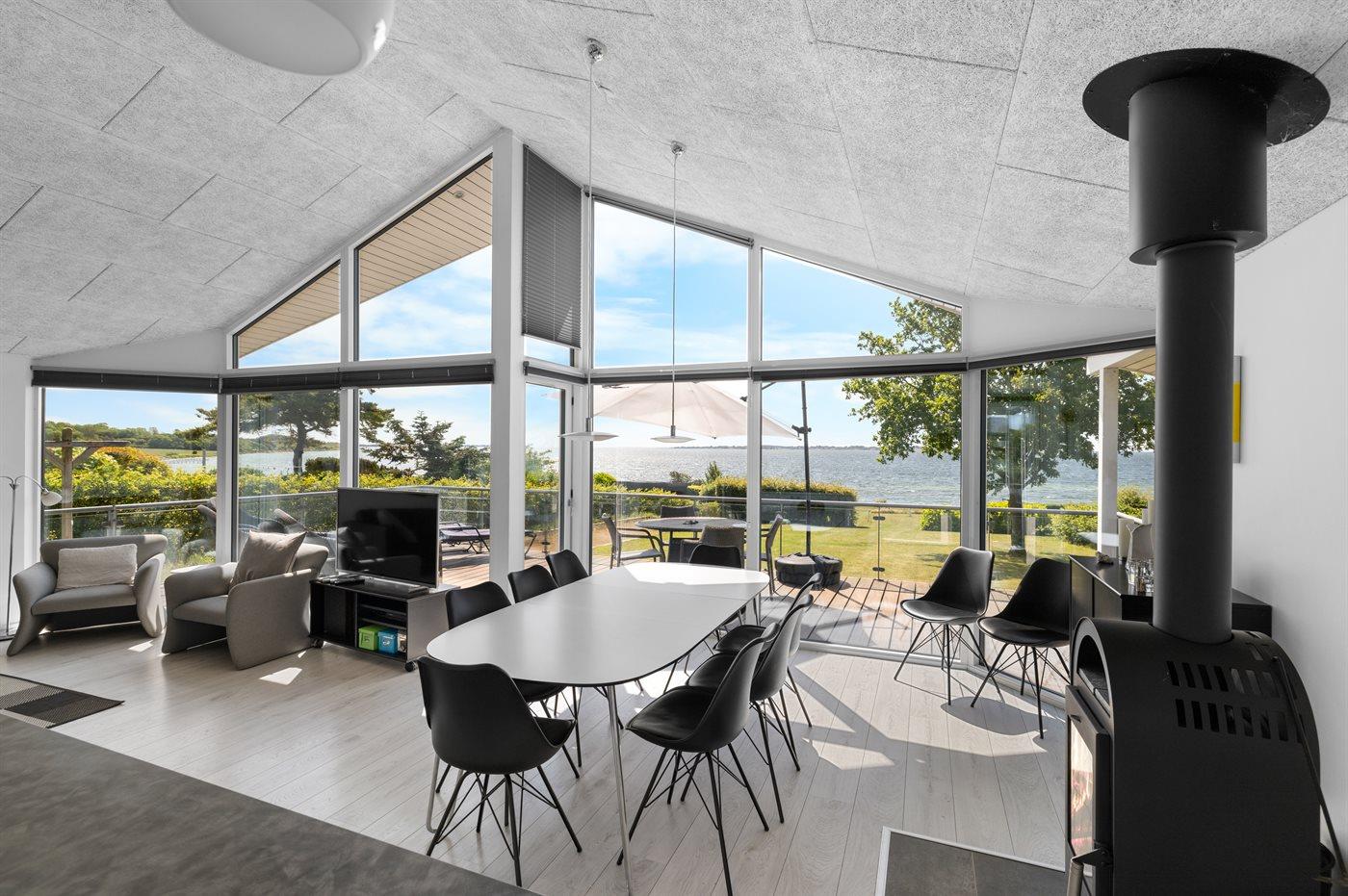 Flot sommerhus med panoramaudsigt over vandet, moderne indretning og direkte adgang til stranden.