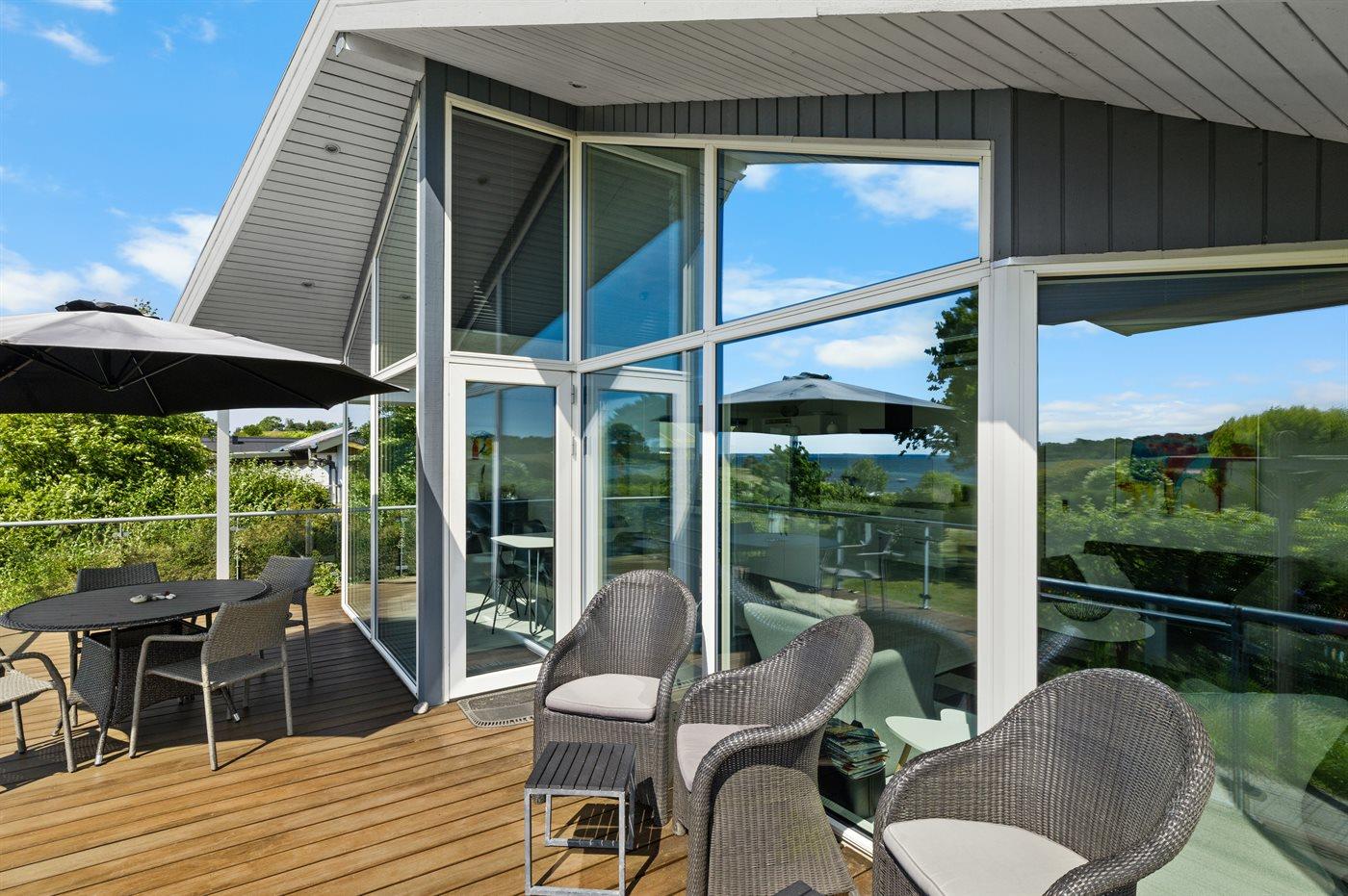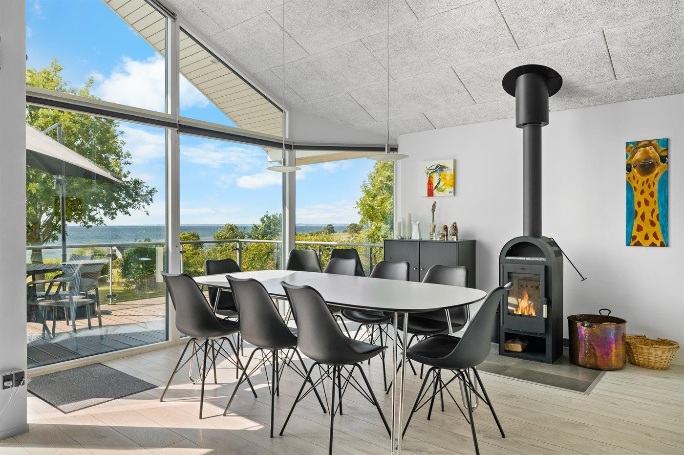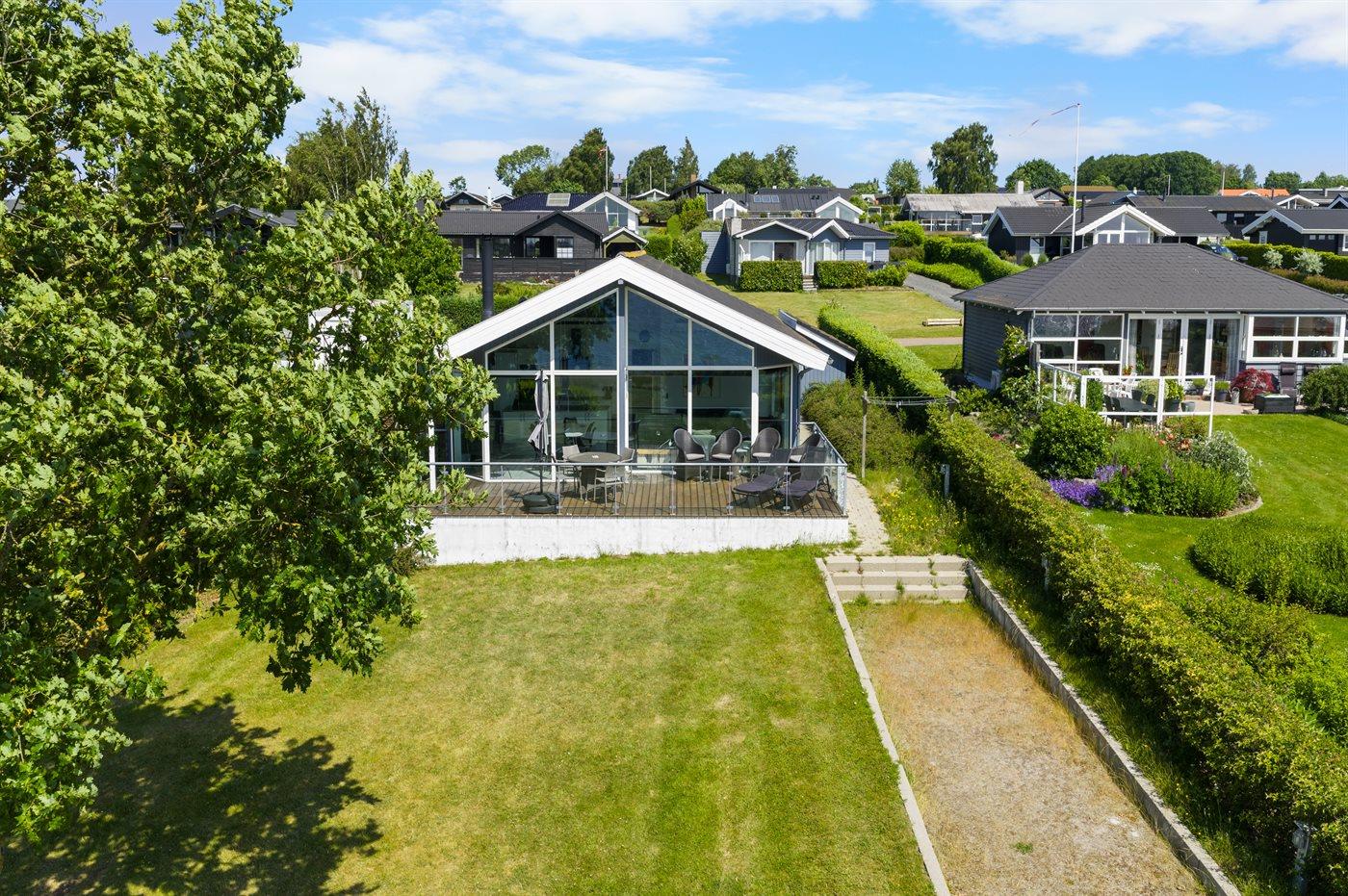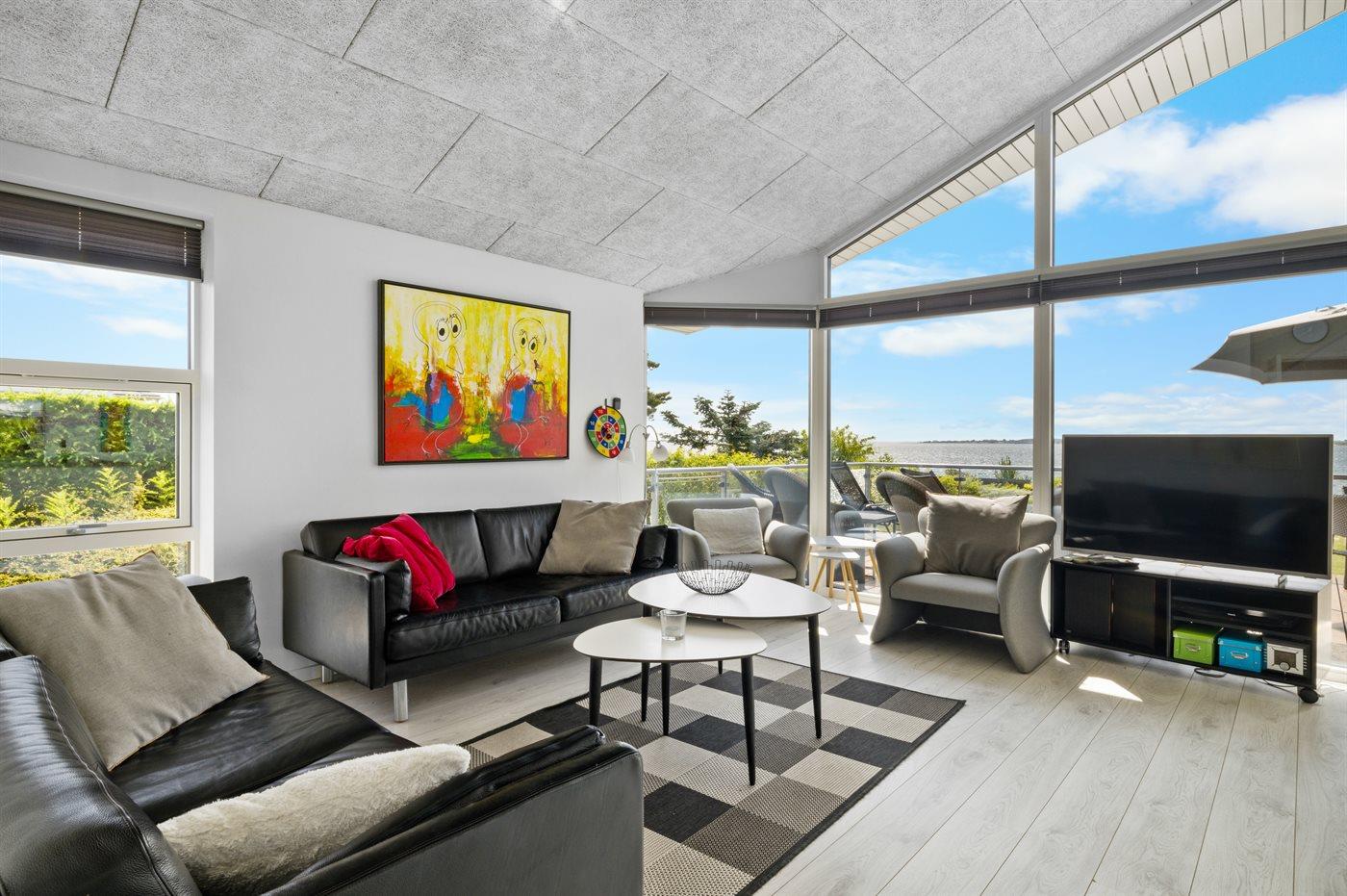 Flot sommerhus med panoramaudsigt over vandet, moderne indretning og direkte adgang til stranden.