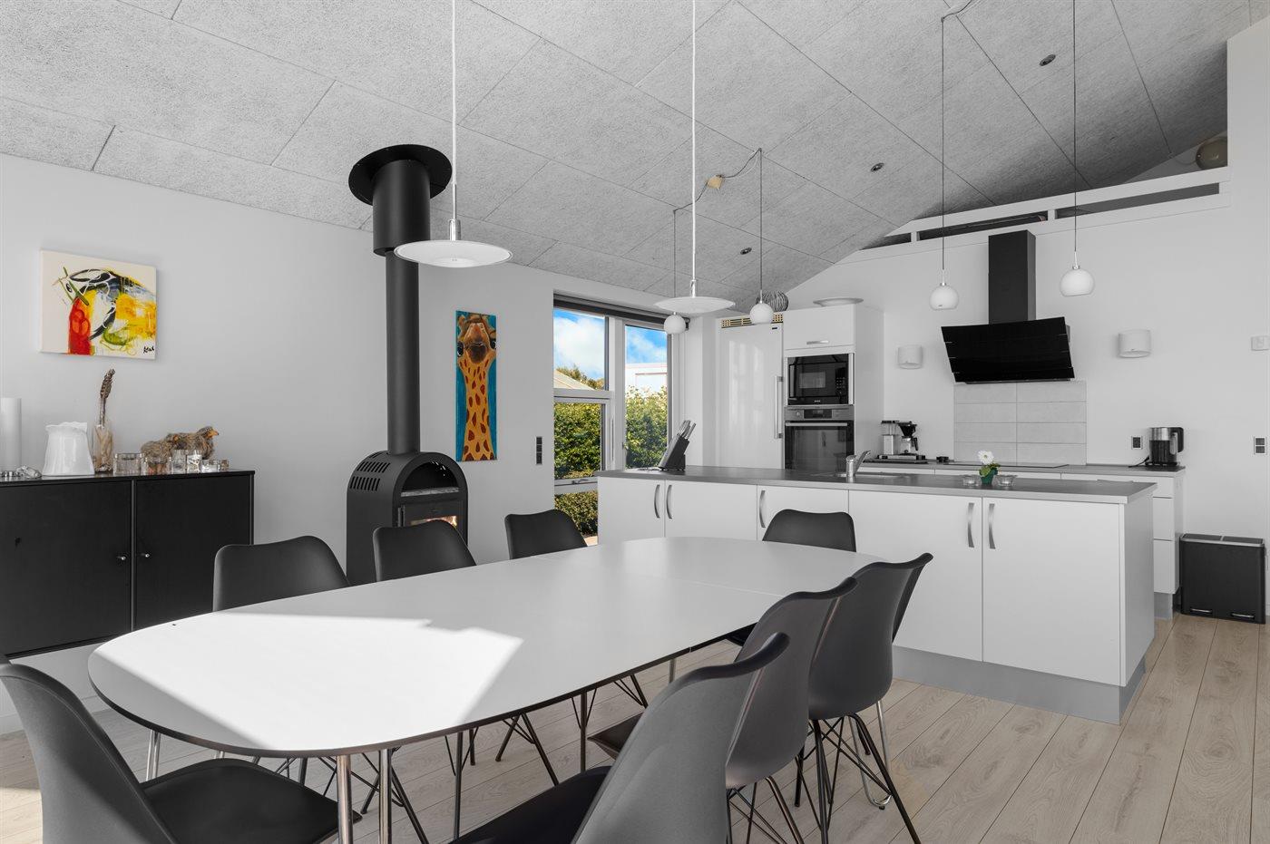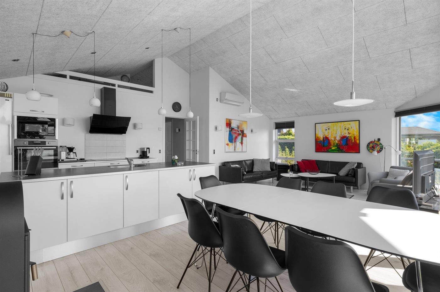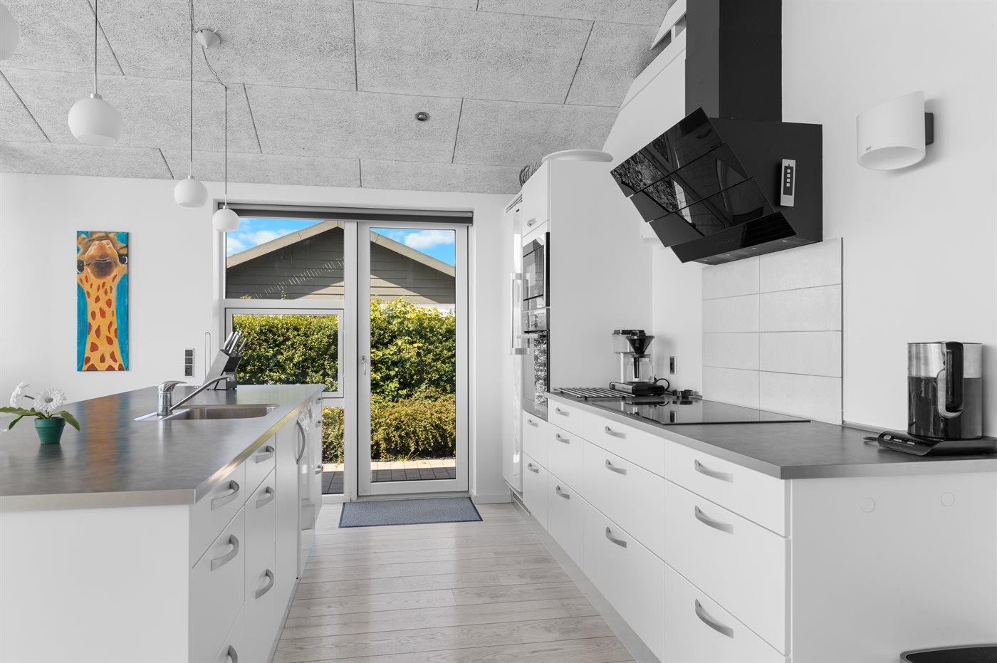 Køkkenet er udstyret med 1 køleskab. Der er 4 induktionskogeplader, varmluftovn, mikrobølgeovn samt opvaskemaskine.