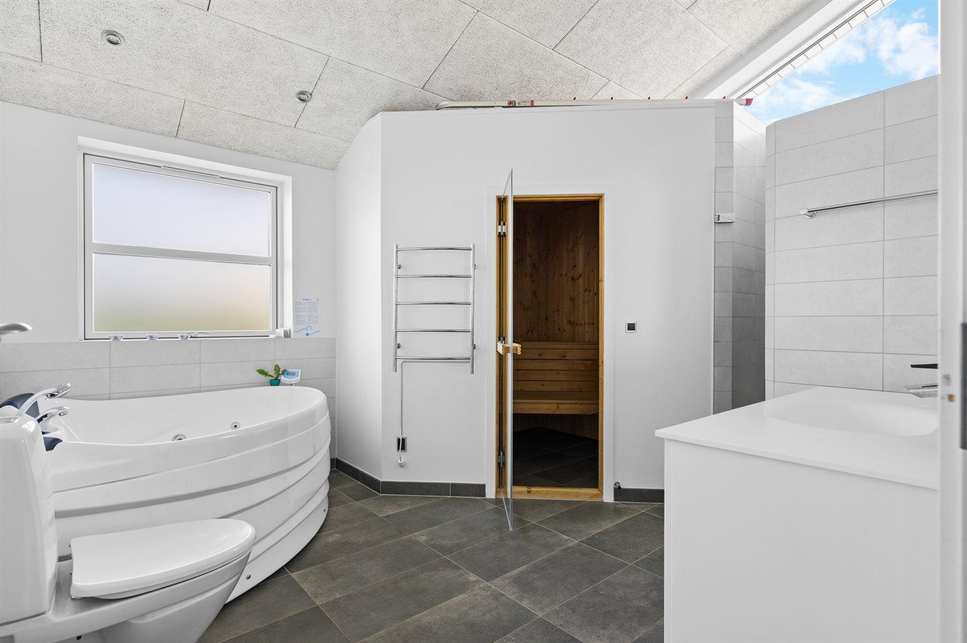 Der er 2 badeværelser med bruseniche og 2 toiletter. Der er gulvvarme på 2 badeværelser. I saunaen er der mulighed for afslapning.