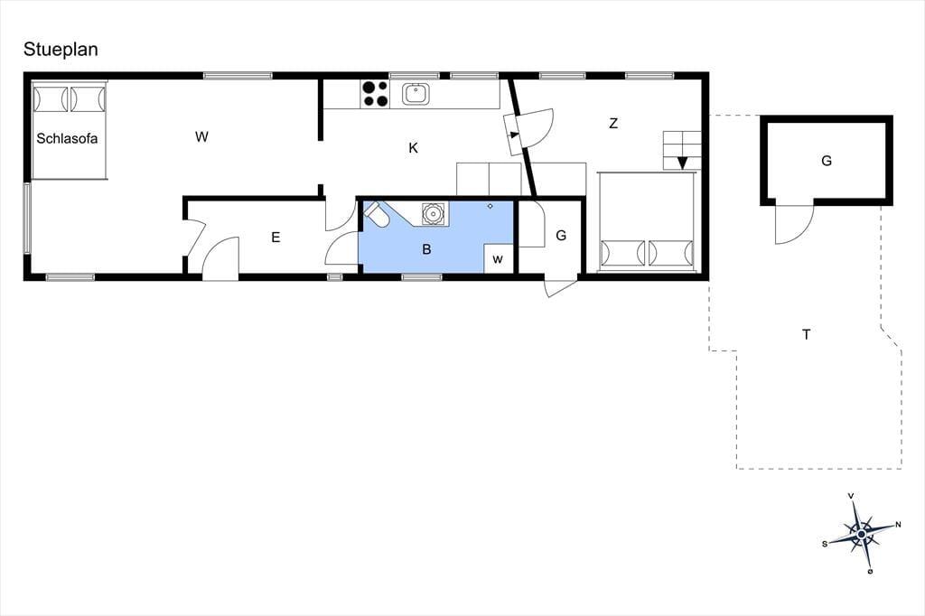 Dette hyggelige hus kan dateres helt tilbage til 1827. Huset har gennemgået en modernisering i 1994 og er derefter løbende vedligeholdt. Feriehuset indeholder en lille entré, et badeværelse med bruser og vaskemaskine samt et køkken med en lille spiseplads til 2 personer. Herudover er der en hyggelig stue med spiseplads og sovesofa, et værelse med dobbeltseng, hvorfra der er trappe op til 1. salen med endnu en dobbeltseng samt TV og Playstation..