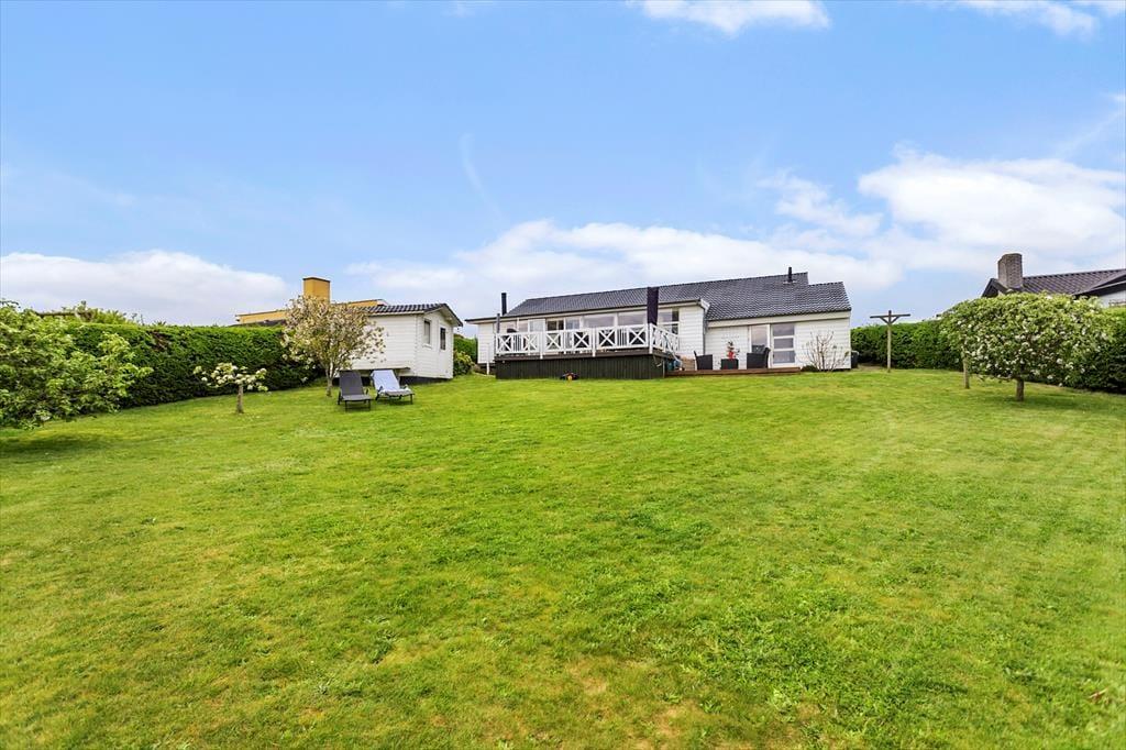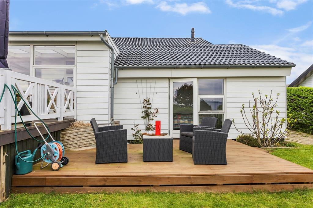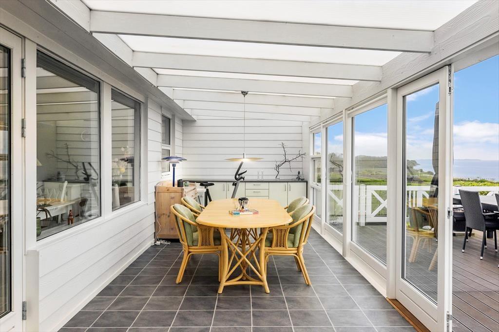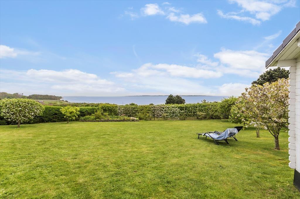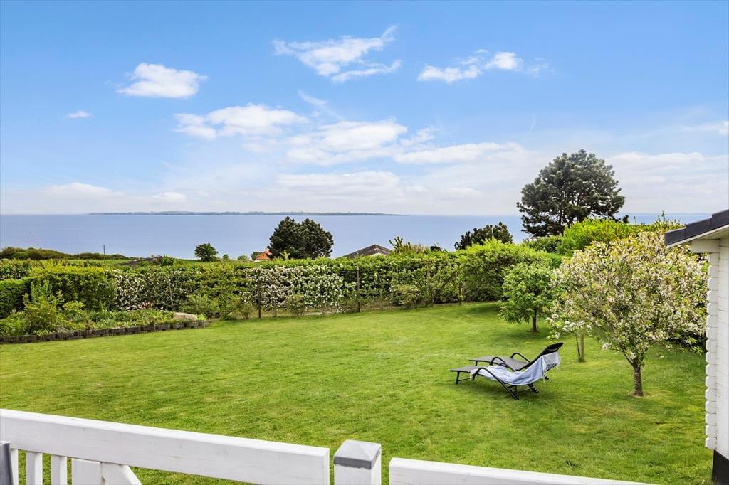 Når vejret lokker dig fra udestuen og helt ud på terrassen, har du frit udsyn over det betagende kystlandskab, og de øvrige sanser vækkes også af den lune sol og duften fra havens frodige bevoksning. En del af det sydvendte terrassemiljø er i direkte forlængelse af udestuen, mens et areal ligger et niveau lavere, og du kan selvfølgelig også sætte dig i en solstol direkte på græsplænen, hvis du trænger til at flytte dig lidt rundt. Den lukkede og let skrånende baghave indbyder til leg og afslapning for både børn og voksne, og hvis du og familien har brug for mere plads at boltre jer på, kan I hurtigt være nede ved Horne Sommerlands hyggelige strand.