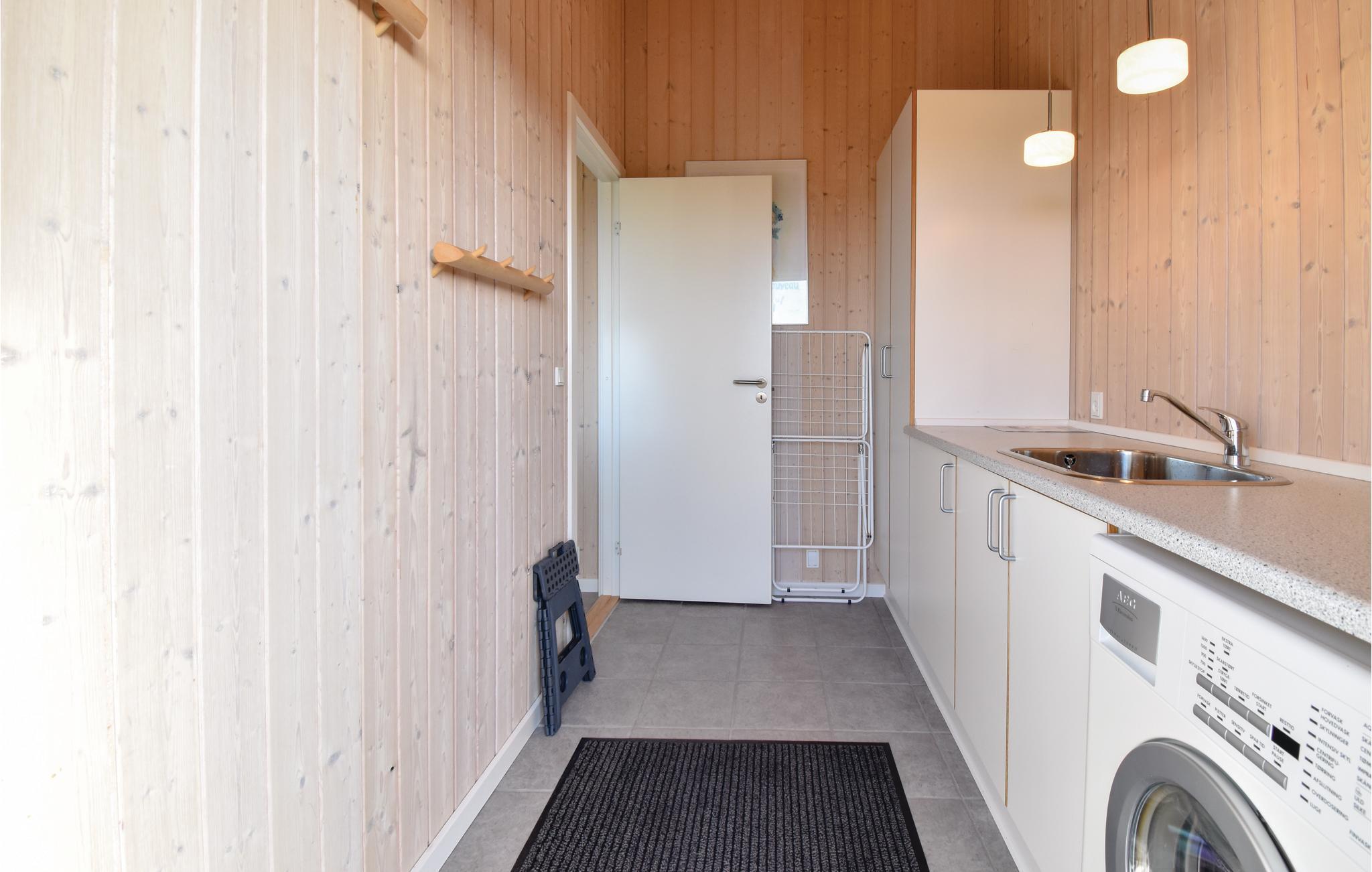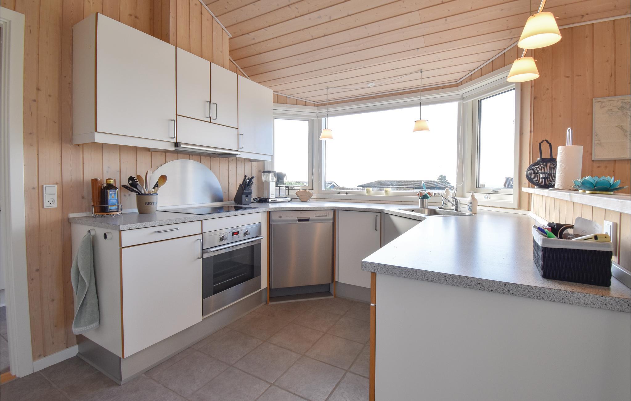 I træder ind i husets rummelige bryggers med vaskemaskine, og allerede her giver den høje lofthøjde jer et indtryk af rum og plads. Videre ind i køkken/alrummet, hvor I fra det veludstyrede køkken kan nyde havudsigten alt imens måltiderne forberedes. Selv om I opholder jer i køkkenet, er I stadig en del af det, der sker i husets hjerte, alrummet, hvor de store vinduespartier mod havet virkelig giver et flot kig og lys.