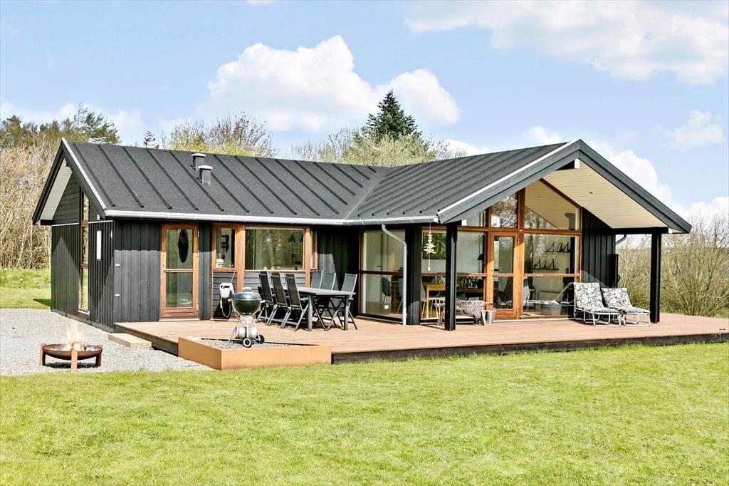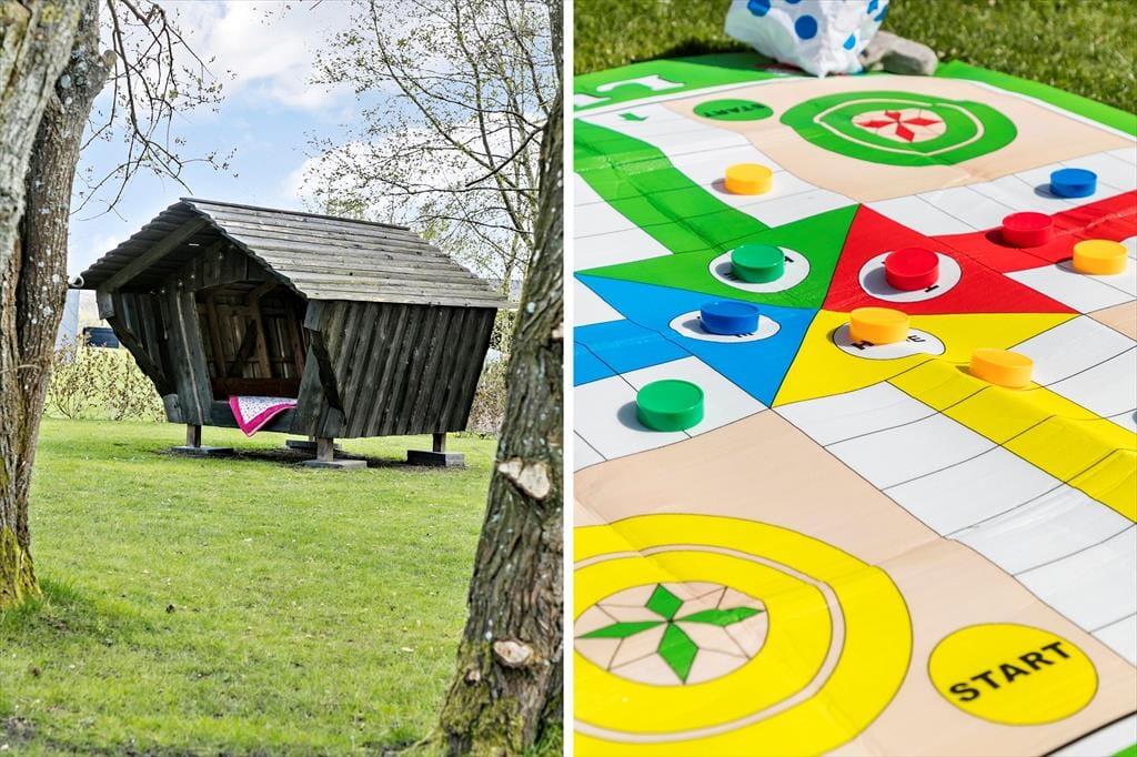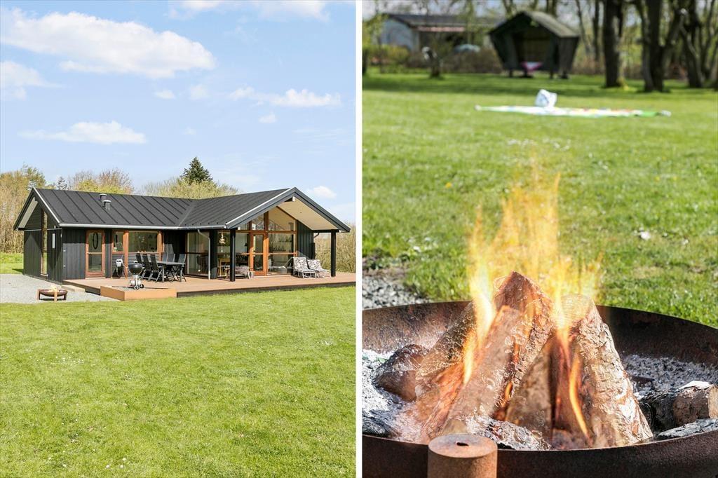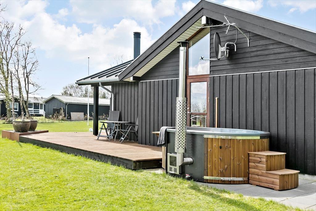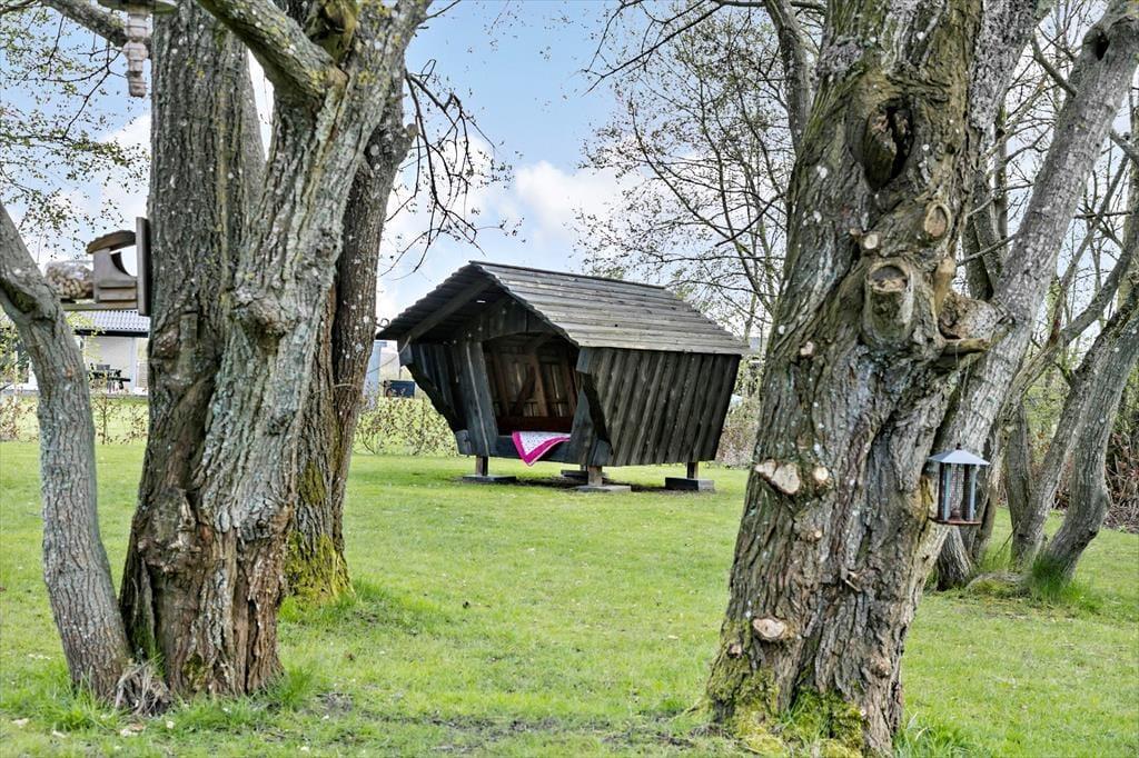 Sommerhusets grønne grund er en herlig oase, når du vil slappe af under åben himmel. Den sydvendte træterrasse er stor og delvist overdækket, så du kan finde flere gode steder at sidde – hvis ikke vildmarksbadet lokker dig til at bruge en time på totalt velvære i det varme vand. Græsplænen er perfekt, hvis du vil lege og spille bold med børnene, og bålstedet fungerer som et hyggeligt samlingspunkt, hvis I vil riste skumfiduser eller bare sidde ved ilden i tusmørket. Og hvis vejret er så godt, at du ikke engang har lyst til at gå indenfor, når det er sengetid, kan du lægge dig til at sove i husets shelter.