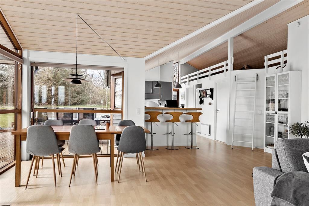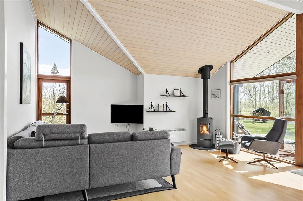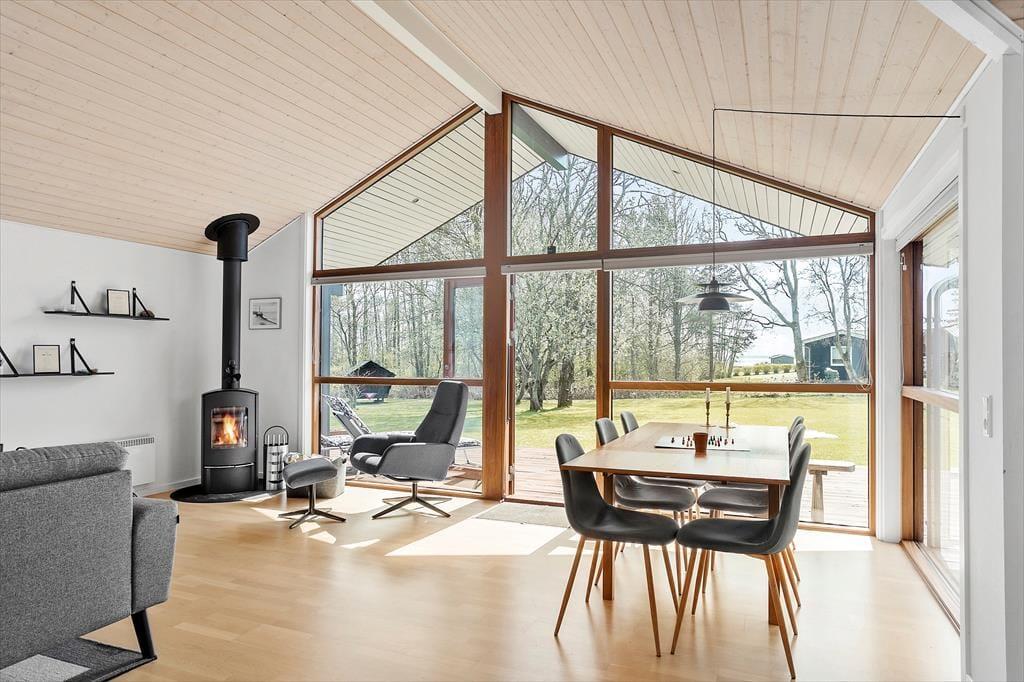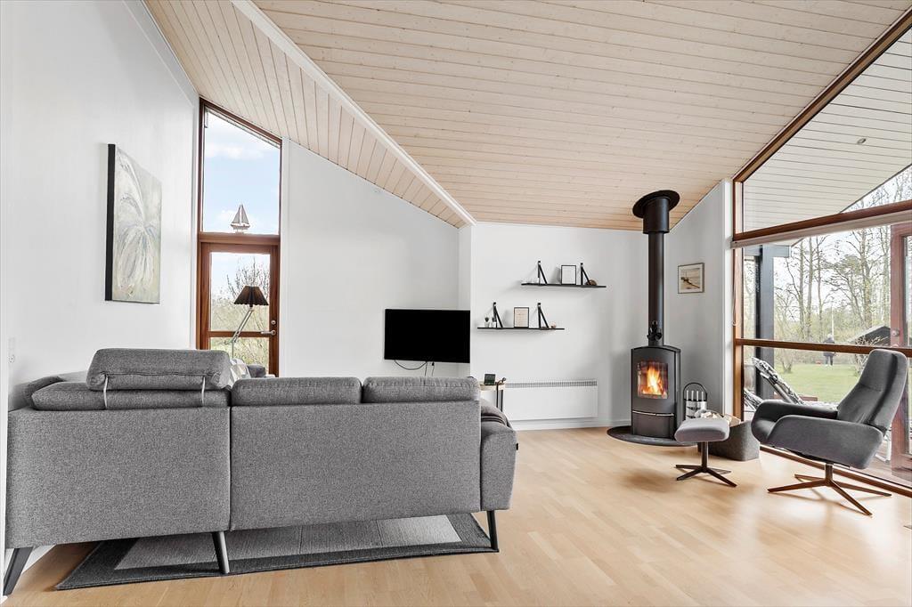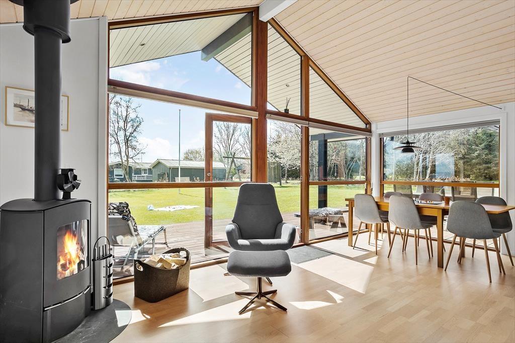 Med sin komfortable indretning og gode atmosfære står sommerhuset klar til at give dig lige det afbræk fra hverdagen, som du har brug for. Der er brændeovn i stuen til eventuelle kølige dage, og når solen skinner udenfor, kan du sætte dig i en solstråle, mens du læser i en lænestol eller spiller brætspil ved spisebordet med børnene. Gennem de store vinduer har du udsigt til høje, flotte løvtræer og den grønne grund. Et veludstyret køkken er integreret med stuen, og derudover byder planløsningen på tre soveværelser og et pænt brusebadeværelse.